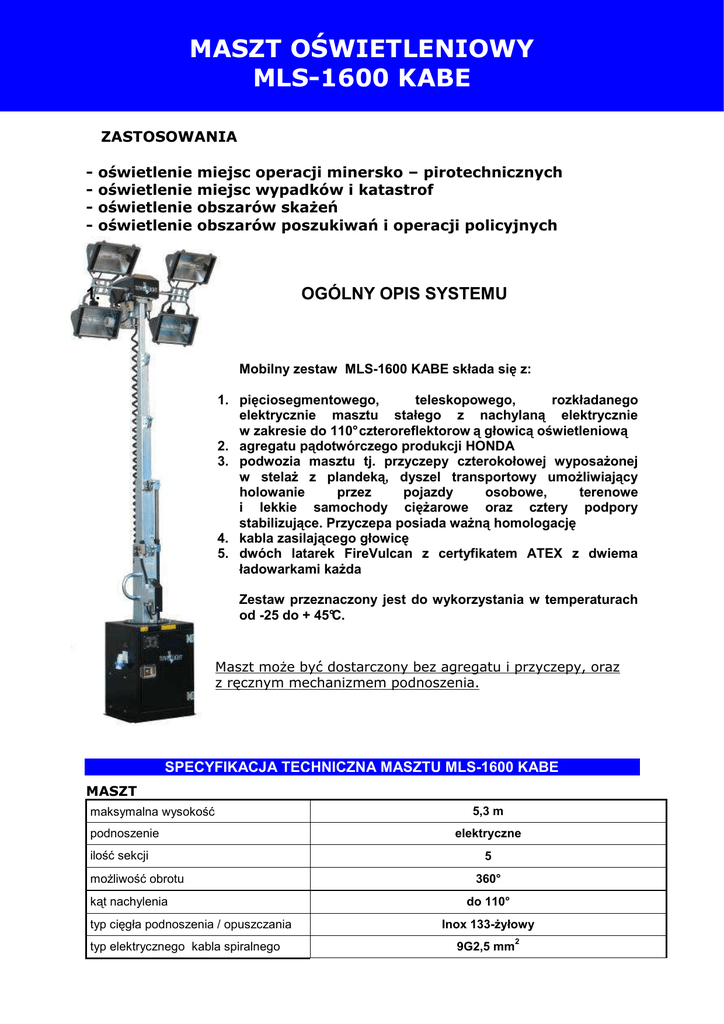 MASZT OŚWIETLENIOWY MLS-1600 KABE ZASTOSOWANIA - oświetlenie oświetlenie oświetlenie oświetlenie miejsc operacji minersko – pirotechnicznych miejsc wypadków i katastrof obszarów skaŜeń obszarów poszukiwań i operacji policyjnych 1. OGÓLNY OPIS SYSTEMU Mobilny zestaw MLS-1600 KABE składa się z: 1. pięciosegmentowego, teleskopowego, rozkładanego elektrycznie masztu stałego z nachylaną elektrycznie w zakresie do 110° czteroreflektorow ą głowicą oświetleniową 2. agregatu pądotwórczego produkcji HONDA 3. podwozia masztu tj. przyczepy czterokołowej wyposaŜonej w stelaŜ z plandeką, dyszel transportowy umoŜliwiający holowanie przez pojazdy osobowe, terenowe i lekkie samochody cięŜarowe oraz cztery podpory stabilizujące. Przyczepa posiada waŜną homologację 4. kabla zasilającego głowicę 5. dwóch latarek FireVulcan z certyfikatem ATEX z dwiema ładowarkami kaŜda Zestaw przeznaczony jest do wykorzystania w temperaturach od -25 do + 45°C. Maszt moŜe być dostarczony bez agregatu i przyczepy, oraz z ręcznym mechanizmem podnoszenia. SPECYFIKACJA TECHNICZNA MASZTU MLS-1600 KABE MASZT maksymalna wysokość podnoszenie ilość sekcji moŜliwość obrotu kąt nachylenia typ cięgła podnoszenia / opuszczania typ elektrycznego kabla spiralnego 5,3 m elektryczne 5 360° do 110° Inox 133-Ŝyłowy 9G2,5 mm 2 dopuszczalna prędkość wiatru klasa ochrony 80 km/h IP 55 wymiary przy opuszczonym maszcie (L x W x H) 1020 x 560 x 1930 wymiary przy podniesionym maszcie (L x W x H) 1020 x 560 x 5300 masa 217 kg REFLEKTOR typ lampy moc światłość (z zaleconymi źródłami) strumień świetlny klasa ochrony materiał konstrukcyjny obudowy reflektor podstawa lampy wymiary (długość x szerokość x głębokość) metalowo-halogenowa 4x400 W min. 3mln 200 tys. cd 42000lm dla lampy HQI-T 400W/N 35000lm dla lampy HQI BT 400W/D IP 55 anodyzowane aluminium UNI 5075 – UNI oksydowane aluminium z polerowaniem o doskonałości 99,85 ceramiczna E40 z gwintem E40 354 x 256 x 153,5 Reflektor jest dostarczony w wykonaniu z hartowanym szkłem i silikonową uszczelką. Zewnętrzne rygle wykonane są ze stali M5 UNI 5931 WIDOK MASZTU PO ZŁOZENIU: Z LEWEJ Z GŁOWICĄ PRZED ZŁOśENIEM, Z PRAWEJ Z GŁOWICĄ PO ZŁOśENIU (SKŁADANIE GŁOWICY ELEKTRYCZNE). mw-j