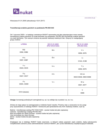 Warszawa 01.01.2005 (aktualizacja 10.01.2017) Transliteracja znaków greckich na podstawie PN-ISO 843 Od 1 stycznia 2005 r. w katalogu centralnym NUKAT wprowadza się jako obowiązujące nowe zasady transliteracji znaków greckich na znaki łacińskie (na podstawie: PN-ISO 843 Konwersja znaków greckich na znaki łacińskie). Tym samym zmienia się sposób realizacji niektórych liter. Dotyczy to następującej grupy znaków: LITERA DO 01.01.2005 (PN-72/N-01203) OD 01.01.2005 (PN-ISO 843) Ββ Bb Vv 0392, 03B2 Ηη 0056, 0076 Ēē 0397, 03B7 Υυ 012A, 012B Uu 03A5, 03C5 Χχ Hh CH ch 0043+0048, 0063+0068 Vv 03DC, 03DD ̔ Yy 0059, 0079 03A7, 03C7 Ϝϝ Īī Ww 0057, 0077 ‘ 0314 (daseia) h 0068 Uwaga: konwersję podwójnych samogłosek ay, ey i oy oddaje się w postaci: au, eu i ou. Zmiany te mają wpływ na szeregowanie w indeksie haseł i tytułów. Prosimy więc o zwracanie na nie uwagi przy wyszukiwaniu w katalogu NUKAT. Konieczne jest sprawdzenie obu form realizacji znaków, czyli np. Bakhai - transliteracja według PN-72/N-01203 - szukać trzeba też jako zapisanej: Vakchai - transliteracja według PN-ISO 843 Bios kai politeia tou Alexe Zormpa - szukać trzeba też jako zapisanej: Vios kai politeia tou Alexi Zormpa Elene - szukać trzeba też jako zapisanej: Eleni Znajdujące się w katalogu NUKAT hasła wzorcowe, w których należy poprawić zapis znaków, będą sukcesywnie modyfikowane zarówno przez administratorów Centrum NUKAT, jak i przez bibliotekarzy współpracujących bibliotek.