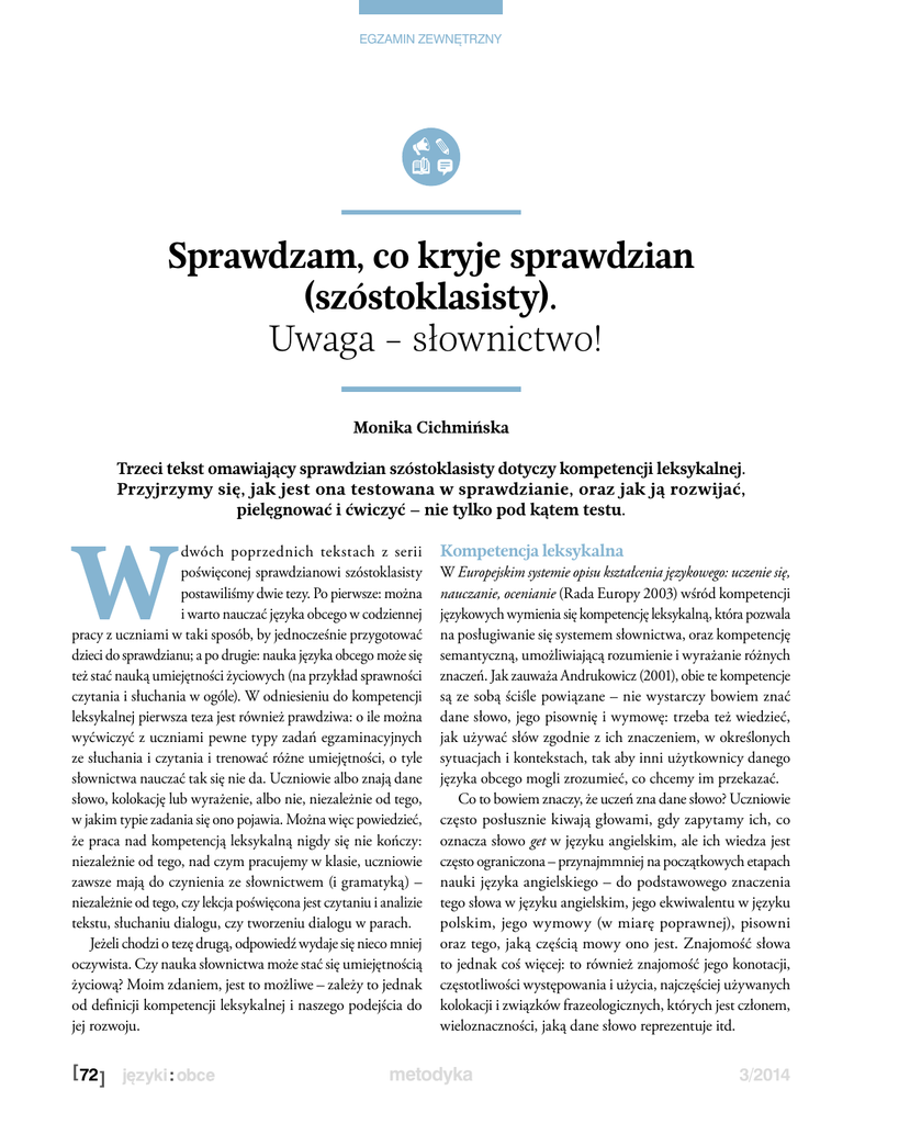 EGZAMIN ZEWNĘTRZNY Sprawdzam, co kryje sprawdzian (szóstoklasisty). Uwaga - słownictwo! Monika Cichmińska Trzeci tekst omawiający sprawdzian szóstoklasisty dotyczy kompetencji leksykalnej. Przyjrzymy się, jak jest ona testowana w sprawdzianie, oraz jak ją rozwijać, pielęgnować i ćwiczyć – nie tylko pod kątem testu. W dwóch poprzednich tekstach z serii poświęconej sprawdzianowi szóstoklasisty postawiliśmy dwie tezy. Po pierwsze: można i warto nauczać języka obcego w codziennej pracy z uczniami w taki sposób, by jednocześnie przygotować dzieci do sprawdzianu; a po drugie: nauka języka obcego może się też stać nauką umiejętności życiowych (na przykład sprawności czytania i słuchania w ogóle). W odniesieniu do kompetencji leksykalnej pierwsza teza jest również prawdziwa: o ile można wyćwiczyć z uczniami pewne typy zadań egzaminacyjnych ze słuchania i czytania i trenować różne umiejętności, o tyle słownictwa nauczać tak się nie da. Uczniowie albo znają dane słowo, kolokację lub wyrażenie, albo nie, niezależnie od tego, w jakim typie zadania się ono pojawia. Można więc powiedzieć, że praca nad kompetencją leksykalną nigdy się nie kończy: niezależnie od tego, nad czym pracujemy w klasie, uczniowie zawsze mają do czynienia ze słownictwem (i gramatyką) – niezależnie od tego, czy lekcja poświęcona jest czytaniu i analizie tekstu, słuchaniu dialogu, czy tworzeniu dialogu w parach. Jeżeli chodzi o tezę drugą, odpowiedź wydaje się nieco mniej oczywista. Czy nauka słownictwa może stać się umiejętnością życiową? Moim zdaniem, jest to możliwe – zależy to jednak od definicji kompetencji leksykalnej i naszego podejścia do jej rozwoju. [ 72 ] Kompetencja leksykalna W Europejskim systemie opisu kształcenia językowego: uczenie się, nauczanie, ocenianie (Rada Europy 2003) wśród kompetencji językowych wymienia się kompetencję leksykalną, która pozwala na posługiwanie się systemem słownictwa, oraz kompetencję semantyczną, umożliwiającą rozumienie i wyrażanie różnych znaczeń. Jak zauważa Andrukowicz (2001), obie te kompetencje są ze sobą ściśle powiązane – nie wystarczy bowiem znać dane słowo, jego pisownię i wymowę: trzeba też wiedzieć, jak używać słów zgodnie z ich znaczeniem, w określonych sytuacjach i kontekstach, tak aby inni użytkownicy danego języka obcego mogli zrozumieć, co chcemy im przekazać. Co to bowiem znaczy, że uczeń zna dane słowo? Uczniowie często posłusznie kiwają głowami, gdy zapytamy ich, co oznacza słowo get w języku angielskim, ale ich wiedza jest często ograniczona – przynajmmniej na początkowych etapach nauki języka angielskiego – do podstawowego znaczenia tego słowa w języku angielskim, jego ekwiwalentu w języku polskim, jego wymowy (w miarę poprawnej), pisowni oraz tego, jaką częścią mowy ono jest. Znajomość słowa to jednak coś więcej: to również znajomość jego konotacji, częstotliwości występowania i użycia, najczęściej używanych kolokacji i związków frazeologicznych, których jest członem, wieloznaczności, jaką dane słowo reprezentuje itd. metodyka 3/2014 EGZAMIN ZEWNĘTRZNY Pomimo intuicyjnego przekonania o znaczeniu słownictwa w nauczaniu języków obcych, poświęcało mu się i nadal poświęca (przynajmniej w większości podręczników) dużo mniej uwagi niż innym aspektom znajomości języków obcych, szczególnie gramatyce (Folse 2004). Pojawiają się oczywiście głosy, które nawołują do tego, by to właśnie słownictwo, a nie gramatyka, stanęło na nauczycielskim piedestale, w szczególności w tzw. podejściu leksykalnym (Lewis 1993, 1997), i reakcje na te apele widać w wielu podręcznikach, w których słownictwo nie jest już tylko dodatkiem do gramatyki. Uczniowie bowiem, często sfrustrowani niemożnością wypowiedzenia się z powodu braku prostych słów, dobrze wiedzą to, o czym napisał Wilkins: bez gramatyki nie da się zbyt wiele przekazać, ale bez słów nie można przekazać niczego (1972:111). Jednak niezależnie od używanego podręcznika i miejsca słownictwa, jakie w nim ono zajmuje zgodnie z intencją autorów i wydawców, nie da się uczyć języka obcego bez używania słownictwa, a rozwój kompetencji leksykalnej nigdy się nie kończy. Słownictwo na sprawdzianie. Gdzie? Wszędzie! Jeśli zakładamy, że uczniowie powinni znać typy zadań, za pomocą których sprawdzana jest ich kompetencja leksykalna, to gdzie jej szukać? Oczywiście – w zadaniach na znajomość środków językowych. Odpowiedź mniej oczywista – właściwie wszędzie. Nawet w informatorze znajdujemy wskazówkę, że dla zadań sprawdzających umiejętność rozumienia wypowiedzi nie podaje się wymagań związanych ze znajomością środków językowych, wychodząc z założenia, że ta wiedza jest koniecznym warunkiem zrozumienia tekstu mówionego i pisanego (Informator o sprawdzianie od roku 2014/2015, 2013:93). Nam, nauczycielom, może się to wydawać oczywiste, jednak uczniowie mogą uważać, że skoro najwięcej punktów dostają za wykonanie zadań na rozumienie tekstów, słownictwo i gramatyka nie są zbyt ważne. Być może nie zdają sobie sprawy z tego, że często nie muszą rozumieć całych (czytanych lub słuchanych) tekstów, że może im wystarczyć znajomość pojedynczych wyrazów lub zdań, by móc odpowiedzieć na dane pytanie. I odwrotnie, nieznajomość jednego wyrazu może prowadzić do braku odpowiedzi: np. w zadaniu 2. (Informator o sprawdzianie od roku 2014/2015) na rozumienie ze słuchu nieznajomość słowa jumper sprawi, że uczeń nie będzie umiał odpowiedzieć na jedno z pytań. 3/2014 To samo dotyczy czytania ze zrozumieniem. Wielu badaczy wskazuje na fakt, że znajomość słownictwa jest kluczowym składnikiem sprawności czytania. Badania Laufer i Sim (1985) wykazują, że to właśnie znajomość słownictwa jest czynnikiem, który ma najwi