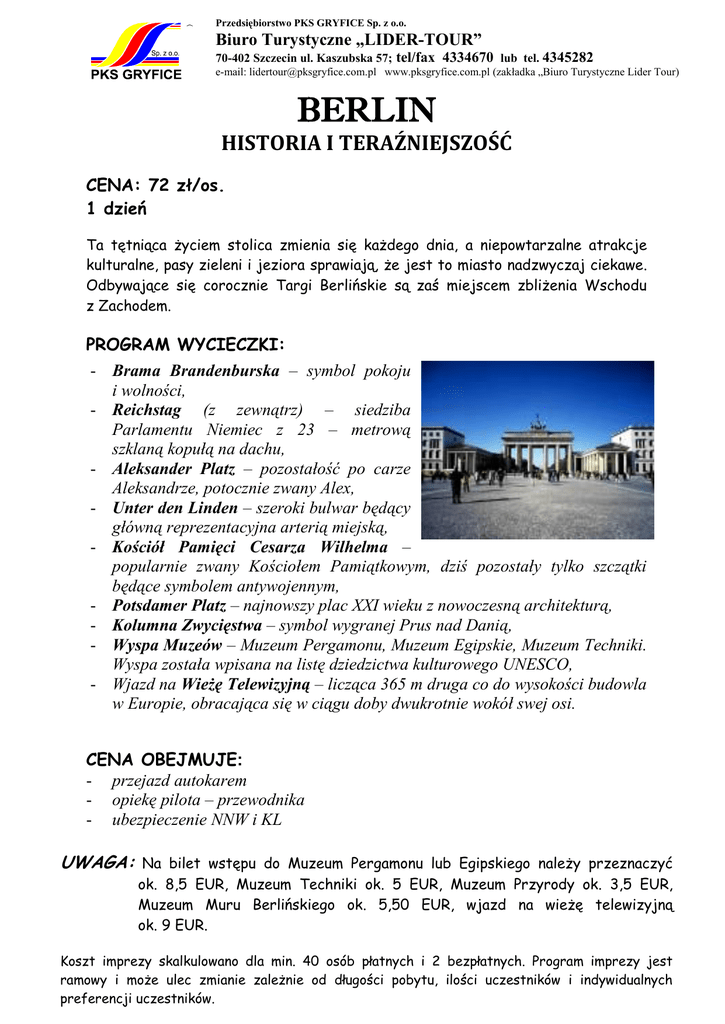Przedsiębiorstwo PKS GRYFICE Sp. z o.o. Biuro Turystyczne „LIDER-TOUR” 70-402 Szczecin ul. Kaszubska 57; tel/fax 4334670 lub tel. 4345282 e-mail: [email protected] www.pksgryfice.com.pl (zakładka „Biuro Turystyczne Lider Tour) BERLIN HISTORIA I TERAŹNIEJSZOŚĆ CENA: 72 zł/os. 1 dzień Ta tętniąca życiem stolica zmienia się każdego dnia, a niepowtarzalne atrakcje kulturalne, pasy zieleni i jeziora sprawiają, że jest to miasto nadzwyczaj ciekawe. Odbywające się corocznie Targi Berlińskie są zaś miejscem zbliżenia Wschodu z Zachodem. PROGRAM WYCIECZKI: - Brama Brandenburska – symbol pokoju i wolności, - Reichstag (z zewnątrz) – siedziba Parlamentu Niemiec z 23 – metrową szklaną kopułą na dachu, - Aleksander Platz – pozostałość po carze Aleksandrze, potocznie zwany Alex, - Unter den Linden – szeroki bulwar będący główną reprezentacyjna arterią miejską, - Kościół Pamięci Cesarza Wilhelma – popularnie zwany Kościołem Pamiątkowym, dziś pozostały tylko szczątki będące symbolem antywojennym, - Potsdamer Platz – najnowszy plac XXI wieku z nowoczesną architekturą, - Kolumna Zwycięstwa – symbol wygranej Prus nad Danią, - Wyspa Muzeów – Muzeum Pergamonu, Muzeum Egipskie, Muzeum Techniki. Wyspa została wpisana na listę dziedzictwa kulturowego UNESCO, - Wjazd na Wieżę Telewizyjną – licząca 365 m druga co do wysokości budowla w Europie, obracająca się w ciągu doby dwukrotnie wokół swej osi. CENA OBEJMUJE: - przejazd autokarem - opiekę pilota – przewodnika - ubezpieczenie NNW i KL UWAGA: Na bilet wstępu do Muzeum Pergamonu lub Egipskiego należy przeznaczyć ok. 8,5 EUR, Muzeum Techniki ok. 5 EUR, Muzeum Przyrody ok. 3,5 EUR, Muzeum Muru Berlińskiego ok. 5,50 EUR, wjazd na wieżę telewizyjną ok. 9 EUR. Koszt imprezy skalkulowano dla min. 40 osób płatnych i 2 bezpłatnych. Program imprezy jest ramowy i może ulec zmianie zależnie od długości pobytu, ilości uczestników i indywidualnych preferencji uczestników.