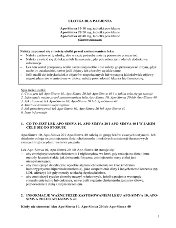 ULOTKA DLA PACJENTA Apo-Simva 10 10 mg, tabletki powlekane Apo-Simva 20 20 mg, tabletki powlekane Apo-Simva 40 40 mg, tabletki powlekane (Simvastatinum) NaleŜy zapoznać się z treścią ulotki przed zastosowaniem leku. − NaleŜy zachować tę ulotkę, aby w razie potrzeby móc ją ponownie przeczytać. − NaleŜy zwrócić się do lekarza lub farmaceuty, gdy potrzebna jest rada lub dodatkowa informacja. − Lek ten został przepisany ściśle określonej osobie i nie naleŜy go przekazywać innym, gdyŜ moŜe im zaszkodzić, nawet jeśli objawy ich choroby są takie same. − Jeśli nasili się którykolwiek z objawów niepoŜądanych lub wystąpią jakiekolwiek objawy niepoŜądane nie wymienione w ulotce, naleŜy powiadomić lekarza lub farmaceutę. Spis treści ulotki: 1. Co to jest lek Apo-Simva 10, Apo-Simva 20 lub Apo-Simva 40 i w jakim celu się go stosuje 2. Informacje waŜne przed zastosowaniem leku Apo-Simva 10, Apo-Simva 20 lub Apo-Simva 40 3. Jak stosować lek Apo-Simva 10, Apo-Simva 20 lub Apo-Simva 40 4. MoŜliwe działania niepoŜądane 5. Jak przechowywać lek Apo-Simva 10, Apo-Simva 20 lub Apo-Simva 40 6. Inne informacje 1. CO TO JEST LEK APO-SIMVA 10, APO-SIMVA 20 I APO-SIMVA 40 I W JAKIM CELU SIĘ GO STOSUJE Apo-Simva 10, Apo-Simva 20 i Apo-Simva 40 naleŜą do grupy leków zwanych statynami. Ich działanie polega na zmniejszaniu ilości cholesterolu i niektórych substancji tłuszczowych zwanych triglicerydami we krwi pacjenta. Lek Apo-Simva 10, Apo-Simva 20 lub Apo-Simva 40 stosuje się: − aby zmniejszyć stęŜenie cholesterolu i triglicerydów we krwi, gdy reakcja na dietę i inne metody leczenia (takie, jak ćwiczenia fizyczne, zmniejszenie masy ciała) jest niewystarczająca, − aby zmniejszyć dziedziczne wysokie stęŜenie cholesterolu we krwi (rodzinna homozygotyczna hipercholesterolemia), jako uzupełnienie diety i innych metod leczenia (np. LDL-aferezy) lub gdy metody te okaŜą się niewłaściwe, − aby zmniejszyć ryzyko choroby naczyń wieńcowych, jeŜeli u pacjenta występuje stwardnienie tętnic lub cukrzyca, nawet jeśli stęŜenie cholesterolu jest prawidłowe, jednocześnie z dietą i innym leczeniem. 2. INFORMACJE WAśNE PRZED ZASTOSOWANIEM LEKU APO-SIMVA 10, APOSIMVA 20 LUB APO-SIMVA 40 Kiedy nie stosować leku Apo-Simva 10, Apo-Simva 20 lub Apo-Simva 40 1 − jeśli u pacjenta stwierdzono uczulenie (nadwraŜliwość) na symwastatynę lub którykolwiek z pozostałych składników leku, − jeśli występuje choroba wątroby lub utrzymuje się zwiększona aktywność niektórych enzymów wątrobowych (aminotransferaz w surowicy krwi), − jeśli pacjentka jest w ciąŜy lub karmi piersią, − jeśli pacjent stosuje jednocześnie następujące leki (patrz takŜe punkt „Stosowanie innych leków”): ◦ niektóre leki przeciwgrzybicze (ketokonazol lub itrakonazol), ◦ niektóre leki stosowane w leczeniu AIDS (inhibitory proteazy wirusa HIV), ◦ niektóre antybiotyki (erytromycynę, klarytromycynę lub telitromycynę), ◦ lek przeciwdepresyjny nefazodon. Kiedy zachować szczególną ostroŜność stosując lek Apo-Simva 10, Apo-Simva 20 lub ApoSimva 40 − jeŜeli u pacjenta podczas leczenia symwastatyną wystąpiły niewyjaśnione bóle mięśni, nadwraŜliwość na ucisk lub osłabienie siły mięśni. Symwastatyna moŜe powodować zaburzenia ze strony mięśni i czasami rozpad mięśni z kurczem mięśni, gorączką i czerwonobrązowym zabarwieniem moczu. Ryzyko wystąpienia rozpadu mięśni zwiększa się wraz ze zwiększeniem dawki. Jeśli wystąpi ból mięśni, tkliwość uciskowa lub osłabienie siły mięśni, naleŜy natychmiast skontaktować się z lekarzem. Jeśli którakolwiek z opisanych poniŜej sytuacji dotyczy pacjenta, nasila się ryzyko rozpadu mięśni. − pacjent ma powyŜej 70 lat, − u pacjenta występują zaburzenia czynności nerek, − u pacjenta występują choroby tarczycy (i nie stosuje on odpowiednich leków), − u pacjenta lub jego najbliŜszej rodziny wystąpiły dziedziczne zaburzenia ze strony układu mięśniowego, − jeśli w przeszłości wystąpiło szkodliwe działanie symwastatyny, innych statyn lub fibratów (innych leków zmniejszających stęŜenie cholesterolu) na układ mięśniowy, − pacjent zaŜywa niektóre inne leki (patrz punkt „Stosowanie innych leków”), − pacjent spoŜywa duŜe ilości alkoholu lub u którego w przeszłości wystąpiły zaburzenia czynności wątroby lub choroby wątroby. Symwastatyna moŜe niekorzystnie działać na wątrobę nawet, jeśli to nie będzie bezpośrednio zauwaŜalne. Lekarz moŜe zalecić niektóre badania krwi, aby sprawdzić czynność wątroby przed rozpoczęciem i po rozpoczęciu leczenia symwastatyną. NaleŜy zasięgnąć porady lekarza jeŜeli któraś z powyŜszych sytuacji dotyczy pacjenta obecnie lub w przeszłości. Stosowanie leku Apo-Simva 10, Apo-Simva 20 lub Apo-Simva 40 z innymi lekami NaleŜy zwrócić uwagę, Ŝe poniŜsze stwierdzenia mogą dotyczyć leków, które pacjent stosował w przeszłości lub które być moŜe będzie stosował w przyszłości. Leki wymienione poniŜej mogą być znane pacjentowi pod inną nazwą, zwykle nazwą handlową. W tym punkcie nie wymieniano nazw handlowych leków, lecz nazwy substancji czynnej leku lub grupy substancji czynnych, do której naleŜy. Dlatego naleŜy dokładnie sprawdzić na opakowaniu lub w załączonej ulotce dla pacjenta, co jest substancją czynną stosowanego leku. 2 Ryzyko wystąpienia zaburzeń ze strony mięśni moŜe być większe, jeŜeli pacjent przyjmuje symwastatynę z którymkolwiek z niŜej podanych leków (niektóre z nich zostały wymienione powyŜej w punkcie 2. Informacje waŜne przed zastosowaniem leku Apo-Simva 10, Apo-Simva 20 lub Apo-Simva 40): − fibratami (inne leki zmniejszające stęŜenie cholesterolu w surowicy krwi np.: gemfibrozyl, bezafibrat), − duŜymi dawkami (większymi lub równymi 1g na dobę) niacyny lub kwasu nikotynowego (inne le