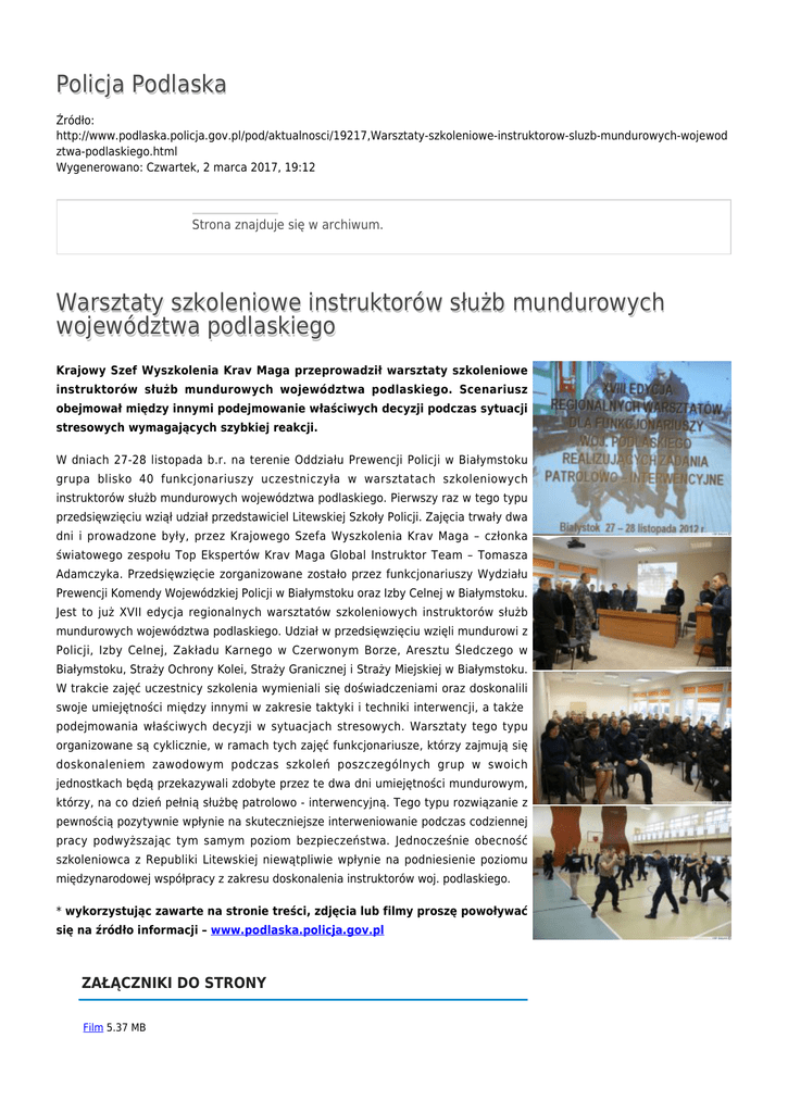 Policja Podlaska Źródło: http://www.podlaska.policja.gov.pl/pod/aktualnosci/19217,Warsztaty-szkoleniowe-instruktorow-sluzb-mundurowych-wojewod ztwa-podlaskiego.html Wygenerowano: Czwartek, 2 marca 2017, 19:12 Strona znajduje się w archiwum. Warsztaty szkoleniowe instruktorów służb mundurowych województwa podlaskiego Krajowy Szef Wyszkolenia Krav Maga przeprowadził warsztaty szkoleniowe instruktorów służb mundurowych województwa podlaskiego. Scenariusz obejmował między innymi podejmowanie właściwych decyzji podczas sytuacji stresowych wymagających szybkiej reakcji. W dniach 27-28 listopada b.r. na terenie Oddziału Prewencji Policji w Białymstoku grupa blisko 40 funkcjonariuszy uczestniczyła w warsztatach szkoleniowych instruktorów służb mundurowych województwa podlaskiego. Pierwszy raz w tego typu przedsięwzięciu wziął udział przedstawiciel Litewskiej Szkoły Policji. Zajęcia trwały dwa dni i prowadzone były, przez Krajowego Szefa Wyszkolenia Krav Maga – członka światowego zespołu Top Ekspertów Krav Maga Global Instruktor Team – Tomasza Adamczyka. Przedsięwzięcie zorganizowane zostało przez funkcjonariuszy Wydziału Prewencji Komendy Wojewódzkiej Policji w Białymstoku oraz Izby Celnej w Białymstoku. Jest to już XVII edycja regionalnych warsztatów szkoleniowych instruktorów służb mundurowych województwa podlaskiego. Udział w przedsięwzięciu wzięli mundurowi z Policji, Izby Celnej, Zakładu Karnego w Czerwonym Borze, Aresztu Śledczego w Białymstoku, Straży Ochrony Kolei, Straży Granicznej i Straży Miejskiej w Białymstoku. W trakcie zajęć uczestnicy szkolenia wymieniali się doświadczeniami oraz doskonalili swoje umiejętności między innymi w zakresie taktyki i techniki interwencji, a także podejmowania właściwych decyzji w sytuacjach stresowych. Warsztaty tego typu organizowane są cyklicznie, w ramach tych zajęć funkcjonariusze, którzy zajmują się doskonaleniem zawodowym podczas szkoleń poszczególnych grup w swoich jednostkach będą przekazywali zdobyte przez te dwa dni umiejętności mundurowym, którzy, na co dzień pełnią służbę patrolowo - interwencyjną. Tego typu rozwiązanie z pewnością pozytywnie wpłynie na skuteczniejsze interweniowanie podczas codziennej pracy podwyższając tym samym poziom bezpieczeństwa. Jednocześnie obecność szkoleniowca z Republiki Litewskiej niewątpliwie wpłynie na podniesienie poziomu międzynarodowej współpracy z zakresu doskonalenia instruktorów woj. podlaskiego. * wykorzystując zawarte na stronie treści, zdjęcia lub filmy proszę powoływać się na źródło informacji – www.podlaska.policja.gov.pl ZAŁĄCZNIKI DO STRONY Film 5.37 MB Ocena: 0/5 (0) Tweetnij