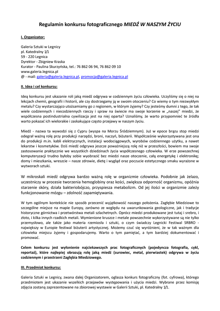 Regulamin konkursu fotograficznego MIEDŹ W NASZYM ŻYCIU I. Organizator: Galeria Sztuki w Legnicy pl. Katedralny 1/1 59 - 220 Legnica Dyrektor - Zbigniew Kraska Kurator - Paulina Skurzyńska, tel.: 76 862 06 94, 76 862 09 10 www.galeria.legnica.pl @ - mail: [email protected], [email protected] II. Idea i cel konkursu: Ideą konkursu jest ukazanie roli jaką miedź odgrywa w codziennym życiu człowieka. Uczyliśmy się o niej na lekcjach chemii, geografii i historii, ale czy dostrzegamy ją w swoim otoczeniu? Co wiemy o tym niezwykłym metalu? Czy wystarczająco utożsamiamy go z regionem, w którym żyjemy? Czy jesteśmy dumni z tego, że tak wiele codziennych i niecodziennych rzeczy i spraw na świecie ma swoje korzenie w „naszej” miedzi, że współczesna postindustrialna cywilizacja jest na niej oparta? Uznaliśmy, że warto przypomnieć te źródła warto pokazać ich wielorakie i zaskakujące często przejawy w naszym życiu. Miedź - nazwa ta wywodzi się z Cypru (wyspa na Morzu Śródziemnym). Już w epoce brązu stop miedzi odegrał ważną rolę przy produkcji narzędzi, broni, naczyń, biżuterii. Współcześnie wykorzystywana jest ona do produkcji m.in. kabli elektrycznych, instalacji wodociągowych, wyrobów codziennego użytku, a nawet lekarstw i kosmetyków. Dziś miedź odgrywa jeszcze poważniejszą rolę niż w przeszłości, bowiem ma swoje zastosowanie praktycznie we wszystkich dziedzinach życia współczesnego człowieka. W erze powszechnej komputeryzacji trudno byłoby sobie wyobrazić bez miedzi nasze otoczenie, całą energetykę i elektronikę; domy i mieszkania, wreszcie – nasze zdrowie, dietę i wygląd oraz poczucie estetycznego smaku wyrażone w wytworach sztuki. W mikroskali miedź odgrywa bardzo ważną rolę w organizmie człowieka. Podobnie jak żelazo, uczestniczy w procesie tworzenia hemoglobiny oraz kości, zwiększa odporność organizmu, opóźnia starzenie skóry, działa bakteriobójczo, przyspiesza metabolizm. Od jej ilości w organizmie zależy funkcjonowanie mózgu – zdolność zapamiętywania. W tym ogólnym kontekście nie sposób przecenić wyjątkowość naszego położenia. Zagłębie Miedziowe to szczególne miejsce na mapie Europy, zarówno ze względu na uwarunkowania geologiczne, jak i tradycje historyczne górnictwa i przetwórstwa metali szlachetnych. Oprócz miedzi produkowane jest tutaj i srebro, i złoto, i kilka innych rzadkich metali. Wymienione kruszce i metale powszechnie wykorzystywane są nie tylko przemysłowo, ale także jako materia rzemiosła i sztuki, o czym świadczy Legnicki Festiwal SRBRO największy w Europie festiwal biżuterii artystycznej. Możemy czuć się wyróżnieni, że w tak ważnym dla człowieka miejscu żyjemy i gospodarujemy. Warto o tym pamiętać, a tym bardziej dokumentować i promować. Celem konkursu jest wyłonienie najciekawszych prac fotograficznych (pojedyncza fotografia, cykl, reportaż), które najlepiej obrazują rolę jaką miedź (surowiec, metal, pierwiastek) odgrywa w życiu codziennym i przestrzeni Zagłębia Miedziowego. III. Przedmiot konkursu: Galeria Sztuki w Legnicy, zwana dalej Organizatorem, ogłasza konkurs fotograficzny (fot. cyfrowa), którego przedmiotem jest ukazanie wszelkich przejawów występowania i użycia miedzi. Wybrane przez komisję zdjęcia zostaną zaprezentowane na zbiorowej wystawie w Galerii Sztuki, pl. Katedralny 1/1. Fotografie powinny kojarzyć się z regionem Zagłębia Miedziowego - oddawać jego unikatowy charakter oraz obrazować wykorzystanie miedzi w codziennym życiu. Podstawowym obok estetycznego kryterium przy ocenie projektów będzie ich powiązanie z tradycją wydobycia miedzi oraz wykorzystaniem jej w innych dziedzinach życia od przemysłu i budownictwa, przez przedmioty użytkowe codziennego użytku, zdrowie i pielęgnację ciała, a skończywszy na sztuce (biżuteria, grafika, rzeźba i inne) po kosmetyki, biżuterię, dom. IV. Warunki uczestnictwa w konkursie: 1. Konkurs ma charakter otwarty i jednoetapowy. Skierowany jest do uczniów szkół, studentów uczelni i osób dorosłych interesujących się fotografią. 2. Prace mogą być realizowane oraz zgłaszane do konkursu indywidualnie lub zespołowo. 3. Uczestnicy winni dostarczyć fotografie w postaci cyfrowej (wraz z wypełnioną kartą zgłoszeniową) w terminie do 30 listopada do siedziby Galerii Sztuki w Legnicy lub elektronicznie na adres: [email protected] lub pocztą tradycyjną (poczta, kurier) na nośnikach CD, DVD, pendrive w postaci plików JPG. 6. JPG z pracą powinien być nazwany (opisany) w poniższy sposób: nazwisko_imię_tytuł_rok Anna_Kowalska_Miedziowe_inspiracje_2013 V. Jury i kryteria oceny prac konkursowych: 1. Oceny prac dokona Komisja Konkursowa. 2. Wybór zwycięskiego projektu nastąpi 2.12.2014 r. 3. Werdykt jury jest ostateczny. 5. Podstawowym kryterium oceny pracy będzie jej adekwatność do tematu konkursowego zadania oraz walory artystyczne i społeczne. VI. Nagroda: 1. Najlepsze prace wybrane podczas obrad komisji zostaną zaprezentowane na wystawie zbiorowej w Galerii Sztuki. 2. Jury przyzna następujące nagrody: I nagroda rzeczowa (tablet) o wartości do 750 zł, II nagroda rzeczowa (aparat) o wartości do 500 zł, III nagroda rzeczowa (ramka cyfrowa) o wartości do 300 zł. 3. W przypadku wyboru pracy zespołu nagroda nie ulega zwielokrotnieniu. 4. Nagrodą specjalną, wylosowaną wśród wszystkich uczestników wystawy, będzie wycieczka do kopalni lub Huty Miedzi. VII. Rozstrzygnięcie konkursu: Ogłoszenie prac zakwalifikowanych do wystawy nastąpi do dnia 2 grudnia 2013 r. Nazwiska laureatów nagród zostaną ogłoszone do 6 grudnia 2013 r. O wynikach konkursu uczestnicy zostaną powiadomieni drogą elektroniczną. Informacja o zwycięzcy pojawi się również na stronie internetowej Organizatora: www.galeria.legnica.pl oraz na www.facebook.com/galeria.sztukiwlegnicy VIII. Prawa autorskie: Zgłoszenie prac do konkursu traktowane jest j