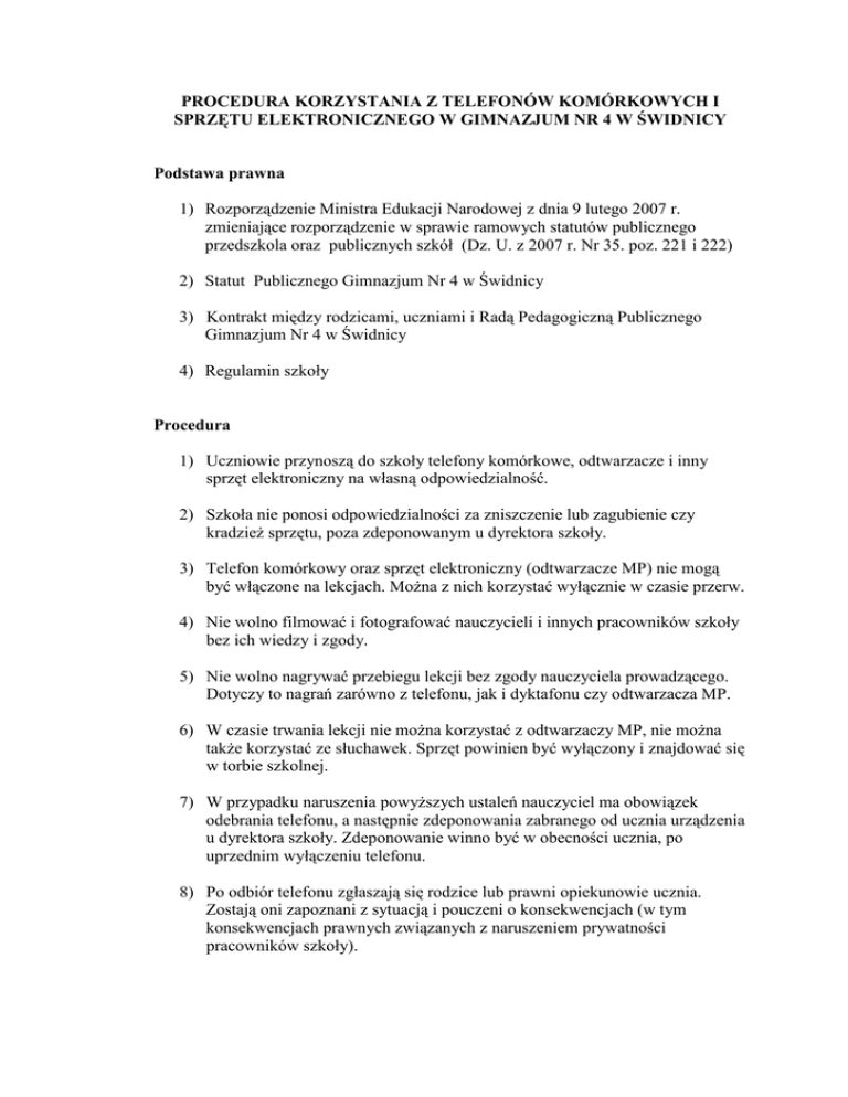 PROCEDURA KORZYSTANIA Z TELEFONÓW KOMÓRKOWYCH I SPRZĘTU ELEKTRONICZNEGO W GIMNAZJUM NR 4 W ŚWIDNICY Podstawa prawna 1) Rozporządzenie Ministra Edukacji Narodowej z dnia 9 lutego 2007 r. zmieniające rozporządzenie w sprawie ramowych statutów publicznego przedszkola oraz publicznych szkół (Dz. U. z 2007 r. Nr 35. poz. 221 i 222) 2) Statut Publicznego Gimnazjum Nr 4 w Świdnicy 3) Kontrakt między rodzicami, uczniami i Radą Pedagogiczną Publicznego Gimnazjum Nr 4 w Świdnicy 4) Regulamin szkoły Procedura 1) Uczniowie przynoszą do szkoły telefony komórkowe, odtwarzacze i inny sprzęt elektroniczny na własną odpowiedzialność. 2) Szkoła nie ponosi odpowiedzialności za zniszczenie lub zagubienie czy kradzież sprzętu, poza zdeponowanym u dyrektora szkoły. 3) Telefon komórkowy oraz sprzęt elektroniczny (odtwarzacze MP) nie mogą być włączone na lekcjach. Można z nich korzystać wyłącznie w czasie przerw. 4) Nie wolno filmować i fotografować nauczycieli i innych pracowników szkoły bez ich wiedzy i zgody. 5) Nie wolno nagrywać przebiegu lekcji bez zgody nauczyciela prowadzącego. Dotyczy to nagrań zarówno z telefonu, jak i dyktafonu czy odtwarzacza MP. 6) W czasie trwania lekcji nie można korzystać z odtwarzaczy MP, nie można także korzystać ze słuchawek. Sprzęt powinien być wyłączony i znajdować się w torbie szkolnej. 7) W przypadku naruszenia powyższych ustaleń nauczyciel ma obowiązek odebrania telefonu, a następnie zdeponowania zabranego od ucznia urządzenia u dyrektora szkoły. Zdeponowanie winno być w obecności ucznia, po uprzednim wyłączeniu telefonu. 8) Po odbiór telefonu zgłaszają się rodzice lub prawni opiekunowie ucznia. Zostają oni zapoznani z sytuacją i pouczeni o konsekwencjach (w tym konsekwencjach prawnych związanych z naruszeniem prywatności pracowników szkoły). 9) Jeżeli sytuacja powtarza się po raz trzeci, uczeń ma zakaz przynoszenia telefonu do szkoły, a rodzice mogą się z nim kontaktować przez sekretariat szkolny. 10) W przypadku kolejnego łamania zasad uczeń ma obniżoną ocenę ze sprawowania o 1 stopień. Każde trzy następne wykroczenia powodują obniżenie oceny z zachowania do nagannej. 11) Wszelkie objawy permanentnego łamania zasad współżycia społecznego w szkole mogą być traktowane jako przejaw demoralizacji i skutkować skierowaniem sprawy do sądu rodzinnego.