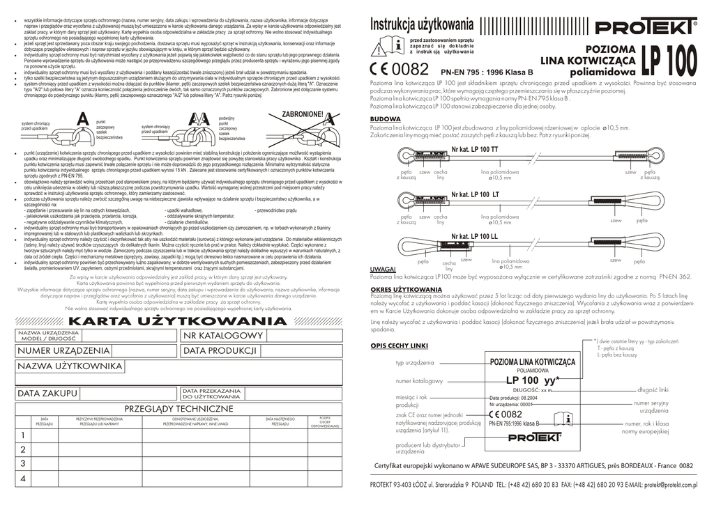 ! wszystkie informacje dotyczące sprzętu ochronnego (nazwa, numer seryjny, data zakupu i wprowadzenia do użytkowania, nazwa użytkownika, informacje dotyczące napraw i przeglądów oraz wycofania z użytkowania) muszą być umieszczone w karcie użytkowania danego urządzenia. Za wpisy w karcie użytkowania odpowiedzialny jest zakład pracy, w którym dany sprzęt jest użytkowany. Kartę wypełnia osoba odpowiedzialna w zakładzie pracy za sprzęt ochronny. Nie wolno stosować indywidualnego sprzętu ochronnego nie posiadającego wypełnionej karty użytkowania. ! jeżeli sprzęt jest sprzedawany poza obszar kraju swojego pochodzenia, dostawca sprzętu musi wyposażyć sprzęt w instrukcją użytkowania, konserwacji oraz informacje dotyczące przeglądów okresowych i napraw sprzętu w języku obowiązującym w kraju, w którym sprzęt będzie użytkowany. ! indywidualny sprzęt ochronny musi być natychmiast wycofany z użytkowania jeżeli pojawią się jakiekolwiek wątpliwości co do stanu sprzętu lub jego poprawnego działania. Ponowne wprowadzenie sprzętu do użytkowania może nastąpić po przeprowadzeniu szczegółowego przeglądu przez producenta sprzętu i wyrażeniu jego pisemnej zgody na ponowne użycie sprzętu. ! indywidualny sprzęt ochronny musi być wycofany z użytkowania i poddany kasacji(zostać trwale zniszczony) jeżeli brał udział w powstrzymaniu spadania. tylko szelki bezpieczeństwa są jedynym dopuszczalnym urządzeniem służącym do utrzymywania ciała w indywidualnym sprzęcie chroniącym przed upadkiem z wysokości. ! system chroniący przed upadkiem z wysokości można dołączać do punktów (klamer, pętli) zaczepowych szelek bezpieczeństwa oznaczonych dużą literą "A". Oznaczenie ! typu "A/2" lub połowa litery "A" oznacza konieczność połączenia jednocześnie dwóch, tak samo oznaczonych punktów zaczepowych. Zabronione jest dołączanie systemu chroniącego do pojedynczego punktu (klamry, pętli) zaczepowego oznaczonego "A/2" lub połowa litery "A". Patrz rysunki poniżej: A system chroniący przed upadkiem A punkt zaczepowy szelek bezpieczeństwa system chroniący przed upadkiem podwójny punkt zaczepowy szelek bezpieczeństwa ZABRONIONE! ! punkt (urządzenie) kotwiczenia sprzętu chroniącego przed upadkiem z wysokości powinien mieć stabilną konstrukcję i położenie ograniczające możliwość wystąpienia upadku oraz minimalizujące długość swobodnego spadku. Punkt kotwiczenia sprzętu powinien znajdować się powyżej stanowiska pracy użytkownika . Kształt i konstrukcja punktu kotwiczenia sprzętu musi zapewnić trwałe połączenie sprzętu i nie może doprowadzić do jego przypadkowego rozłączenia. Minimalna wytrzymałość statyczna punktu kotwiczenia indywidualnego sprzętu chroniącego przed upadkiem wynosi 15 kN . Zalecane jest stosowanie certyfikowanych i oznaczonych punktów kotwiczenia sprzętu zgodnych z PN-EN 795. ! obowiązkowo należy sprawdzić wolną przestrzeń pod stanowiskiem pracy, na którym będziemy używać indywidualnego sprzętu chroniącego przed upadkiem z wysokości w celu uniknięcia uderzenia w obiekty lub niższą płaszczyznę podczas powstrzymywania upadku. Wartość wymaganej wolnej przestrzeni pod miejscem pracy należy sprawdzić w instrukcji użytkowania sprzętu ochronnego, który zamierzamy zastosować. ! podczas użytkowania sprzętu należy zwrócić szczególną uwagę na niebezpieczne zjawiska wpływające na działanie sprzętu i bezpieczeństwo użytkownika, a w szczególności na: - zapętlanie i przesuwanie się lin na ostrych krawędziach, - upadki wahadłowe, - przewodnictwo prądu - jakiekolwiek uszkodzenia jak przecięcia, przetarcia, korozja, - oddziaływanie skrajnych temperatur, - negatywne oddziaływanie czynników klimatycznych, - działanie chemikaliów, ! indywidualny sprzęt ochronny musi być transportowany w opakowaniach chroniących go przed uszkodzeniem czy zamoczeniem, np. w torbach wykonanych z tkaniny impregnowanej lub w stalowych lub plastikowych walizkach lub skrzynkach. ! indywidualny sprzęt ochronny należy czyścić i dezynfekować tak aby nie uszkodzić materiału (surowca) z którego wykonane jest urządzenie . Do materiałów włókienniczych (taśmy, liny) należy używać środków czyszczących do delikatnych tkanin. Można czyścić ręcznie lub prać w pralce. Należy dokładnie wypłukać. Części wykonane z tworzyw sztucznych należy myć tylko w wodzie. Zamoczony podczas czyszczenia lub w trakcie użytkowania sprzęt należy dokładnie wysuszyć w warunkach naturalnych, z dala od źródeł ciepła. Części i mechanizmy metalowe (sprężyny, zawiasy, zapadki itp.) mogą być okresowo lekko nasmarowane w celu poprawienia ich działania. ! indywidualny sprzęt ochronny powinien być przechowywany luźno zapakowany, w dobrze wentylowanych suchych pomieszczeniach, zabezpieczony przed działaniem światła, promieniowaniem UV, zapyleniem, ostrymi przedmiotami, skrajnymi temperaturami oraz żrącymi substancjami. Za wpisy w karcie u¿ytkowania odpowiedzialny jest zak³ad pracy, w którym dany sprzêt jest u¿ytkowany. Karta u¿ytkowania powinna byæ wype³niona przed pierwszym wydaniem sprzêtu do u¿ytkowania. Wszystkie informacje dotycz¹ce sprzêtu ochronnego (nazwa, numer seryjny, data zakupu i wprowadzenia do u¿ytkowania, nazwa u¿ytkownika, informacje dotycz¹ce napraw i przegl¹dów oraz wycofania z u¿ytkowania) musz¹ byæ umieszczone w karcie u¿ytkowania danego urz¹dzenia. Kartê wype³nia osoba odpowiedzialna w zak³adzie pracy za sprzêt ochronny. Nie wolno stosowaæ indywidualnego sprzêtu ochronnego nie posiadaj¹cego wype³nionej karty u¿ytkowania. KARTA U¯YTKOWANIA NAZWA URZ¥DZENIA MODEL / D³UGOŒÆ NR KATALOGOWY NUMER URZ¥DZENIA DATA PRODUKCJI Instrukcja użytkowania przed zastosowaniem sprzętu zapo zna ć się do kładn ie z instruk cją uży tko wan ia 0082 PN-EN 795 : 1996 Klasa B BUDOWA Pozioma lina kotwicz¹ca LP 10