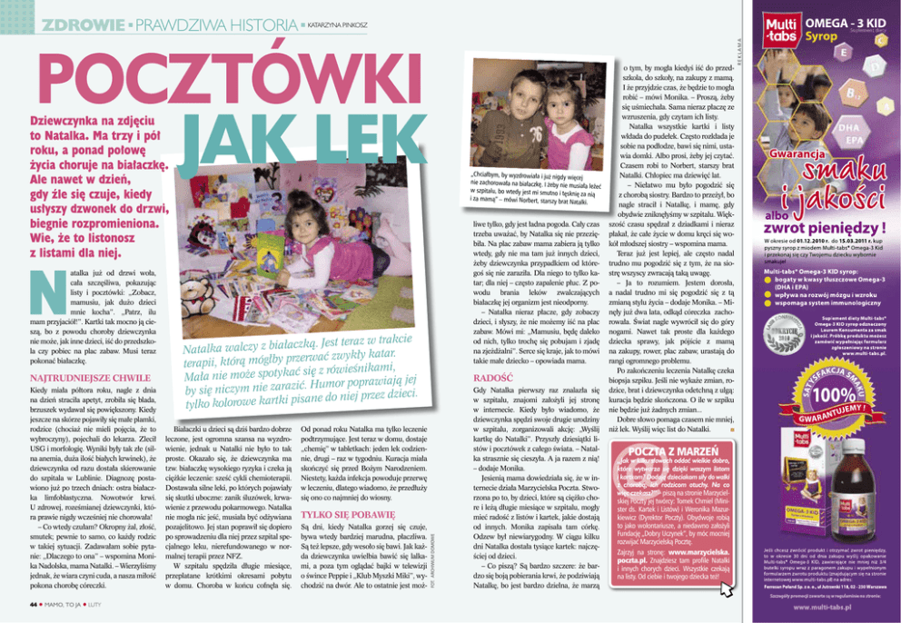 nnnnn nnnnn nnnnn n ZDROWIE PRAWDZIWA HISTORIA n n KATARZYNA PINKOSZ pocztówki jak lek Dziewczynka na zdjęciu to Natalka. Ma trzy i pół roku, a ponad połowę życia choruje na białaczkę. Ale nawet w dzień, gdy źle się czuje, kiedy usłyszy dzwonek do drzwi, biegnie rozpromieniona. Wie, że to listonosz z listami dla niej. N atalka już od drzwi woła, cała szczęśliwa, pokazując listy i pocztówki: „Zobacz, mamusiu, jak dużo dzieci mnie kocha”. „Patrz, ilu mam przyjaciół!”. Kartki tak mocno ją cieszą, bo z powodu choroby dziewczynka nie może, jak inne dzieci, iść do przedszkola czy pobiec na plac zabaw. Musi teraz pokonać białaczkę. Najtrudniejsze chwile Kiedy miała półtora roku, nagle z dnia na dzień straciła apetyt, zrobiła się blada, brzuszek wydawał się powiększony. Kiedy jeszcze na skórze pojawiły się małe plamki, rodzice (chociaż nie mieli pojęcia, że to wybroczyny), pojechali do lekarza. Zlecił USG i morfologię. Wyniki były tak złe (silna anemia, duża ilość białych krwinek), że dziewczynka od razu dostała skierowanie do szpitala w Lublinie. Diagnozę postawiono już po trzech dniach: ostra białaczka limfoblastyczna. Nowotwór krwi. U zdrowej, roześmianej dziewczynki, która prawie nigdy wcześniej nie chorowała! – Co wtedy czułam? Okropny żal, złość, smutek; pewnie to samo, co każdy rodzic w takiej sytuacji. Zadawałam sobie pytanie: „Dlaczego to ona” – wspomina Monika Nadolska, mama Natalki. – Wierzyliśmy jednak, że wiara czyni cuda, a nasza miłość pokona chorobę córeczki. 44 l MAMO, TO JA l LUTY „Chciałbym, by wyzdrowiała i już nigdy więcej nie zachorowała na białaczkę. I żeby nie musiała leżeć w szpitalu, bo wtedy jest mi smutno i tęskn ię za nią i za mamą” – mówi Norbert, starszy brat Natalki. liwe tylko, gdy jest ładna pogoda. Cały czas trzeba uważać, by Natalka się nie przeziębiła. Na plac zabaw mama zabiera ją tylko wtedy, gdy nie ma tam już innych dzieci, żeby dziewczynka przypadkiem od któregoś się nie zaraziła. Dla niego to tylko katar; dla niej – często zapalenie płuc. Z powodu brania leków zwalczających białaczkę jej organizm jest nieodporny. – Natalka nieraz płacze, gdy zobaczy dzieci, i słyszy, że nie możemy iść na plac zabaw. Mówi mi: „Mamusiu, będę daleko od nich, tylko trochę się pobujam i zjadę na zjeżdżalni”. Serce się kraje, jak to mówi takie małe dziecko – opowiada mama. zką. Jest teraz w trakcie Natalka walczy z białac zerwać zwykły katar. terapii, którą mógłby pr się z rówieśnikami, ać yk ot sp e oż m e ni a Mał umor poprawiają jej H ć. zi ra za e ni ym cz ni by się do niej przez dzieci. ne sa pi i rtk ka e w ro lo tylko ko Białaczki u dzieci są dziś bardzo dobrze leczone, jest ogromna szansa na wyzdrowienie, jednak u Natalki nie było to tak proste. Okazało się, że dziewczynka ma tzw. białaczkę wysokiego ryzyka i czeka ją ciężkie leczenie: sześć cykli chemioterapii. Dostawała silne leki, po których pojawiały się skutki uboczne: zanik śluzówek, krwawienie z przewodu pokarmowego. Natalka nie mogła nic jeść, musiała być odżywiana pozajelitowo. Jej stan poprawił się dopiero po sprowadzeniu dla niej przez szpital specjalnego leku, nierefundowanego w normalnej terapii przez NFZ. W szpitalu spędziła długie miesiące, przeplatane krótkimi okresami pobytu w domu. Choroba w końcu cofnęła się. Radość Od ponad roku Natalka ma tylko leczenie podtrzymujące. Jest teraz w domu, dostaje „chemię” w tabletkach: jeden lek codziennie, drugi – raz w tygodniu. Kuracja miała skończyć się przed Bożym Narodzeniem. Niestety, każda infekcja powoduje przerwę w leczeniu, dlatego wiadomo, że przedłuży się ono co najmniej do wiosny. Tylko się pobawię Są dni, kiedy Natalka gorzej się czuje, bywa wtedy bardziej marudna, płaczliwa. Są też lepsze, gdy wesoło się bawi. Jak każda dziewczynka uwielbia bawić się lalkami, a poza tym oglądać bajki w telewizji o śwince Peppie i „Klub Myszki Miki”, wychodzić na dwór. Ale to ostatnie jest moż- Gdy Natalka pierwszy raz znalazła się w szpitalu, znajomi założyli jej stronę w internecie. Kiedy było wiadomo, że dziewczynka spędzi swoje drugie urodziny w szpitalu, zorganizowali akcję: „Wyślij kartkę do Natalki”. Przyszły dziesiątki listów i pocztówek z całego świata. – Natalka strasznie się cieszyła. A ja razem z nią! – dodaje Monika. Jesienią mama dowiedziała się, że w internecie działa Marzycielska Poczta. Stworzona po to, by dzieci, które są ciężko chore i leżą długie miesiące w szpitalu, mogły mieć radość z listów i kartek, jakie dostają od innych. Monika zapisała tam córkę. Odzew był niewiarygodny. W ciągu kilku dni Natalka dostała tysiące kartek: najczęściej od dzieci. – Co piszą? Są bardzo szczere: że bardzo się boją pobierania krwi, że podziwiają Natalkę, bo jest bardzo dzielna, że marzą o tym, by mogła kiedyś iść do przedszkola, do szkoły, na zakupy z mamą. I że przyjdzie czas, że będzie to mogła robić – mówi Monika. – Proszą, żeby się uśmiechała. Sama nieraz płaczę ze wzruszenia, gdy czytam ich listy. Natalka wszystkie kartki i listy wkłada do pudełek. Często rozkłada je sobie na podłodze, bawi się nimi, ustawia domki. Albo prosi, żeby jej czytać. Czasem robi to Norbert, starszy brat Natalki. Chłopiec ma dziewięć lat. – Niełatwo mu było pogodzić się z chorobą siostry. Bardzo to przeżył, bo nagle stracił i Natalkę, i mamę, gdy obydwie zniknęłyśmy w szpitalu. Większość czasu spędzał z dziadkami i nieraz płakał, że całe życie w domu kręci się wokół młodszej siostry – wspomina mama. Teraz już jest lepiej, ale często nadal trudno mu pogodzić się z tym, że na sioC strę wszyscy zwracają taką uwagę. M – Ja to rozumiem. Jestem dorosła, Y a nadal trudno mi się pogodzi