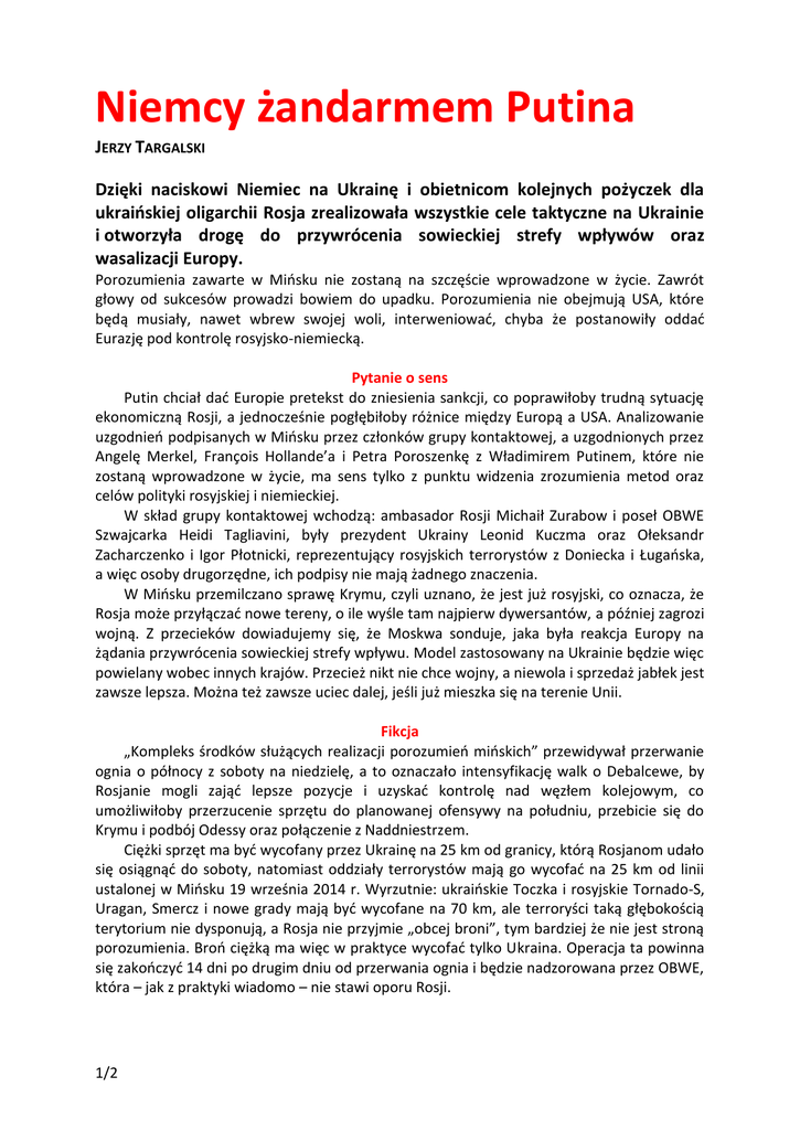 Niemcy żandarmem Putina JERZY TARGALSKI Dzięki naciskowi Niemiec na Ukrainę i obietnicom kolejnych pożyczek dla ukraińskiej oligarchii Rosja zrealizowała wszystkie cele taktyczne na Ukrainie i otworzyła drogę do przywrócenia sowieckiej strefy wpływów oraz wasalizacji Europy. Porozumienia zawarte w Mińsku nie zostaną na szczęście wprowadzone w życie. Zawrót głowy od sukcesów prowadzi bowiem do upadku. Porozumienia nie obejmują USA, które będą musiały, nawet wbrew swojej woli, interweniować, chyba że postanowiły oddać Eurazję pod kontrolę rosyjsko-niemiecką. Pytanie o sens Putin chciał dać Europie pretekst do zniesienia sankcji, co poprawiłoby trudną sytuację ekonomiczną Rosji, a jednocześnie pogłębiłoby różnice między Europą a USA. Analizowanie uzgodnień podpisanych w Mińsku przez członków grupy kontaktowej, a uzgodnionych przez Angelę Merkel, François Hollande’a i Petra Poroszenkę z Władimirem Putinem, które nie zostaną wprowadzone w życie, ma sens tylko z punktu widzenia zrozumienia metod oraz celów polityki rosyjskiej i niemieckiej. W skład grupy kontaktowej wchodzą: ambasador Rosji Michaił Zurabow i poseł OBWE Szwajcarka Heidi Tagliavini, były prezydent Ukrainy Leonid Kuczma oraz Ołeksandr Zacharczenko i Igor Płotnicki, reprezentujący rosyjskich terrorystów z Doniecka i Ługańska, a więc osoby drugorzędne, ich podpisy nie mają żadnego znaczenia. W Mińsku przemilczano sprawę Krymu, czyli uznano, że jest już rosyjski, co oznacza, że Rosja może przyłączać nowe tereny, o ile wyśle tam najpierw dywersantów, a później zagrozi wojną. Z przecieków dowiadujemy się, że Moskwa sonduje, jaka była reakcja Europy na żądania przywrócenia sowieckiej strefy wpływu. Model zastosowany na Ukrainie będzie więc powielany wobec innych krajów. Przecież nikt nie chce wojny, a niewola i sprzedaż jabłek jest zawsze lepsza. Można też zawsze uciec dalej, jeśli już mieszka się na terenie Unii. Fikcja „Kompleks środków służących realizacji porozumień mińskich” przewidywał przerwanie ognia o północy z soboty na niedzielę, a to oznaczało intensyfikację walk o Debalcewe, by Rosjanie mogli zająć lepsze pozycje i uzyskać kontrolę nad węzłem kolejowym, co umożliwiłoby przerzucenie sprzętu do planowanej ofensywy na południu, przebicie się do Krymu i podbój Odessy oraz połączenie z Naddniestrzem. Ciężki sprzęt ma być wycofany przez Ukrainę na 25 km od granicy, którą Rosjanom udało się osiągnąć do soboty, natomiast oddziały terrorystów mają go wycofać na 25 km od linii ustalonej w Mińsku 19 września 2014 r. Wyrzutnie: ukraińskie Toczka i rosyjskie Tornado-S, Uragan, Smercz i nowe grady mają być wycofane na 70 km, ale terroryści taką głębokością terytorium nie dysponują, a Rosja nie przyjmie „obcej broni”, tym bardziej że nie jest stroną porozumienia. Broń ciężką ma więc w praktyce wycofać tylko Ukraina. Operacja ta powinna się zakończyć 14 dni po drugim dniu od przerwania ognia i będzie nadzorowana przez OBWE, która – jak z praktyki wiadomo – nie stawi oporu Rosji. 1/2 Obce wojska i najemnicy mają być wycofani, ale skoro ani oddziałów rosyjskich, ani rosyjskich najemników na Ukrainie nie ma, ten punkt ich nie dotyczy. Służy natomiast zablokowaniu przysłania oddziału amerykańskiego. Oddziały terrorystów nie zostaną rozbrojone, wszak są legalnymi jednostkami „republik”, które właśnie uczestnicy mińskiego kontraktu uznali. Rosja uważa za nielegalne ukraińskie oddziały ochotnicze i to ich ten punkt dotyczy. Jeńcy powinni być zwolnieni do 5–6 marca. Według strony ukraińskiej amnestia nie będzie dotyczyła winnych „zbrodni przeciw ludzkości”, czyli morderców. Oficjalnie 184, a nieoficjalnie 300 ukraińskich wojskowych znajduje się w rosyjskiej niewoli. Według dokumentu obowiązuje jednak zasada „wszystkich za wszystkich” i amnestia ma dotyczyć wszystkich terrorystów. Legalizacja rozbioru Pierwszego dnia po wycofaniu ciężkiej broni ma się rozpocząć dialog w sprawie wyborów lokalnych na terenach zajętych przez rosyjskich terrorystów. Najdalej do 14 marca Rada Najwyższa Ukrainy przyjmie postanowienie o terytorium, na które rozciągać się będzie „szczególny status”, czyli w praktyce autonomia. Przywrócenie kontroli granicy z Rosją ma nastąpić do końca 2015 r. pod warunkiem wejścia w życie nowej konstytucji, która wprowadzi decentralizację (nie chciano użyć słowa „federalizacja”) z uwzględnieniem szczególnego statusu autonomicznych rejonów rosyjskich na wschodniej Ukrainie. Na tych terenach miałby więc panować inny system niż na ukraińskich obszarach państwa. Decentralizację wymyślono po to, by Rosja mogła od wewnątrz kontrolować politykę Ukrainy, tym bardziej że taki rosyjski region autonomiczny zawsze może się jej sprzeciwić. Ponadto Ukraina musi spełnić 11 warunków, by odzyskać kontrolę nad własną granicą. Na terenach autonomicznych odbędą się wybory lokalne, które zalegalizują władze rosyjskie, a rząd ukraiński będzie musiał zawierać z nimi porozumienia. Władze terenów okupowanych wyznaczą prokuratury i sądownictwo oraz stworzą milicję ludową. Kijów zaś będzie zobowiązany do udzielania pomocy finansowej rosyjskim władzom regionów okupowanych. Potwierdza się więc teza, że Donbas jest nabytkiem, którego Rosja nie jest w stanie utrzymać. Model dla Europy Oddziały najemników staną się jednostkami lokalnej milicji Doniecka i Ługańska utrzymywanymi z budżetu Ukrainy. Jest to modelowe rozwiązanie dla Europy: rosyjscy kryminaliści na utrzymaniu własnych ofiar. Przywrócenie związków społeczno-ekonomicznych na terenach okupowanych, w tym działanie systemu bankowego, oznacza, że Ukraina ma wziąć na utrzymanie region autonomiczny, który ze swojej strony będzie utrzymywał „transgraniczną współpracę”