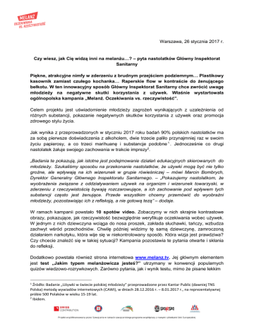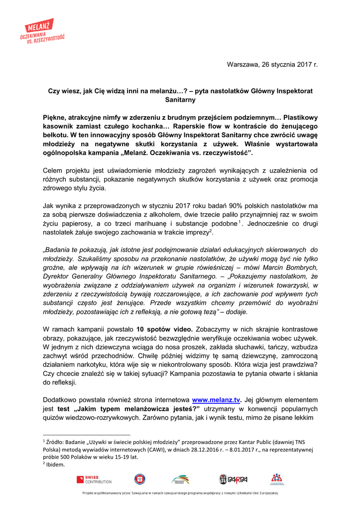 Warszawa, 26 stycznia 2017 r. Czy wiesz, jak Cię widzą inni na melanżu…? – pyta nastolatków Główny Inspektorat Sanitarny Piękne, atrakcyjne nimfy w zderzeniu z brudnym przejściem podziemnym… Plastikowy kasownik zamiast czułego kochanka… Raperskie flow w kontraście do żenującego bełkotu. W ten innowacyjny sposób Główny Inspektorat Sanitarny chce zwrócić uwagę młodzieży na negatywne skutki korzystania z używek. Właśnie wystartowała ogólnopolska kampania „Melanż. Oczekiwania vs. rzeczywistość”. Celem projektu jest uświadomienie młodzieży zagrożeń wynikających z uzależnienia od różnych substancji, pokazanie negatywnych skutków korzystania z używek oraz promocja zdrowego stylu życia. Jak wynika z przeprowadzonych w styczniu 2017 roku badań 90% polskich nastolatków ma za sobą pierwsze doświadczenia z alkoholem, dwie trzecie paliło przynajmniej raz w swoim życiu papierosy, a co trzeci marihuanę i substancje podobne 1 . Jednocześnie co drugi nastolatek żałuje swojego zachowania w trakcie imprezy2. „Badania te pokazują, jak istotne jest podejmowanie działań edukacyjnych skierowanych do młodzieży. Szukaliśmy sposobu na przekonanie nastolatków, że używki mogą być nie tylko groźne, ale wpływają na ich wizerunek w grupie rówieśniczej – mówi Marcin Bombrych, Dyrektor Generalny Głównego Inspektoratu Sanitarnego. – „Pokazujemy nastolatkom, że wyobrażenia związane z oddziaływaniem używek na organizm i wizerunek towarzyski, w zderzeniu z rzeczywistością bywają rozczarowujące, a ich zachowanie pod wpływem tych substancji często jest żenujące. Przede wszystkim chcemy przemówić do wyobraźni młodzieży, pozostawiając ich z refleksją, a nie gotową tezą” – dodaje. W ramach kampanii powstało 10 spotów video. Zobaczymy w nich skrajnie kontrastowe obrazy, pokazujące, jak rzeczywistość bezwzględnie weryfikuje oczekiwania wobec używek. W jednym z nich dziewczyna wciąga do nosa proszek, zakłada słuchawki, tańczy, wzbudza zachwyt wśród przechodniów. Chwilę później widzimy tę samą dziewczynę, zamroczoną działaniem narkotyku, która wije się w niekontrolowany sposób. Która wizja jest prawdziwa? Czy chcecie znaleźć się w takiej sytuacji? Kampania pozostawia te pytania otwarte i skłania do refleksji. Dodatkowo powstała również strona internetowa www.melanz.tv. Jej głównym elementem jest test „Jakim typem melanżowicza jesteś?” utrzymany w konwencji popularnych quizów wiedzowo-rozrywkowych. Zarówno pytania, jak i wynik testu, mimo że pisane lekkim 1 Źródło: Badanie „Używki w świecie polskiej młodzieży” przeprowadzone przez Kantar Public (dawniej TNS Polska) metodą wywiadów internetowych (CAWI), w dniach 28.12.2016 r. – 8.01.2017 r., na reprezentatywnej próbie 500 Polaków w wieku 15-19 lat. 2 Ibidem. językiem, dają badanemu wiedzę o działaniu poszczególnych używek i negatywnych skutkach ich używania. Dodatkowo na stronie kampanii młodzież znajdzie rozszerzone informacje na temat alkoholu i substancji psychoaktywnych oraz listę kontaktów do organizacji zajmujących się profilaktyką uzależnień. W ramach kampanii zaplanowano również szereg działań dodatkowych, m.in. współpracę z influencerami oraz produkcję limitowanej linii odzieży. Kampania „Melanż. Oczekiwania vs. rzeczywistość” jest adresowana także do rodziców, opiekunów i pedagogów, dla których przygotowano serię artykułów pomagających m.in. zrozumieć, jak rozmawiać z nastolatkami o używkach oraz jak rozpoznać pierwsze oznaki uzależnienia. Kampania potrwa do końca marca 2017 r. Projekt jest współfinansowany przez Szwajcarię w ramach szwajcarskiego programu współpracy z nowymi członkami Unii Europejskiej. Partnerem merytorycznym kampanii jest Fundacja Edukacji Społecznej. Więcej informacji można znaleźć na stronie: www.melanz.tv. Więcej informacji udzielają: Maria Zakrzewska Fabryka Komunikacji Społecznej [email protected] (22) 616 12 17 Jan Bondar Rzecznik Prasowy Głównego Inspektoratu Sanitarnego [email protected] 723 996 214 „Melanż. Oczekiwania vs. rzeczywistość” – ogólnopolska kampania realizowana przez Główny Inspektorat Sanitarny. Głównym celem kampanii jest zwrócenie uwagi młodzieży na negatywne skutki korzystania z używek. Kampania potrwa do końca marca 2017.