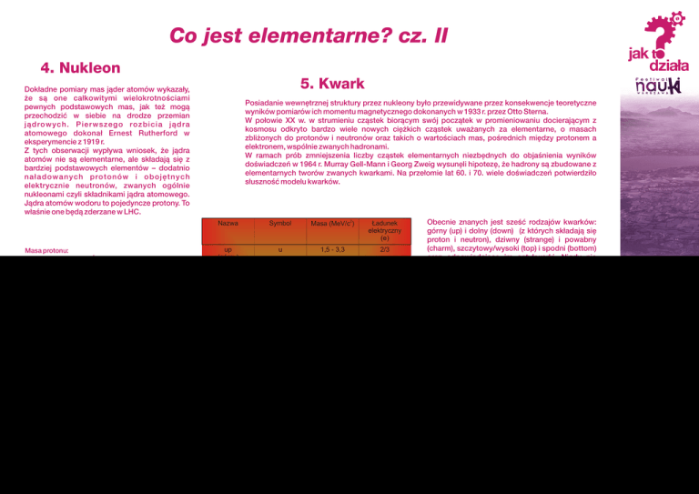 Co jest elementarne? cz. II 4. Nukleon 5. Kwark Dokładne pomiary mas jąder atomów wykazały, że są one całkowitymi wielokrotnościami pewnych podstawowych mas, jak też mogą przechodzić w siebie na drodze przemian j ą d ro w y c h . P i e r w s z e g o ro z b i c i a j ą d r a atomowego dokonał Ernest Rutherford w eksperymencie z 1919 r. Z tych obserwacji wypływa wniosek, że jądra atomów nie są elementarne, ale składają się z bardziej podstawowych elementów – dodatnio n a ł a d o w a n y c h p ro t o n ó w i o b o j ę t n y c h elektrycznie neutronów, zwanych ogólnie nukleonami czyli składnikami jądra atomowego. Jądra atomów wodoru to pojedyncze protony. To właśnie one będą zderzane w LHC. Masa protonu: 2 mp=938.2703 MeV/c za C. Amsler et al. (Particle Data Group), PL B667, 1 (2008) (URL: http://pdg.lbl.gov) Posiadanie wewnętrznej struktury przez nukleony było przewidywane przez konsekwencje teoretyczne wyników pomiarów ich momentu magnetycznego dokonanych w 1933 r. przez Otto Sterna. W połowie XX w. w strumieniu cząstek biorącym swój początek w promieniowaniu docierającym z kosmosu odkryto bardzo wiele nowych ciężkich cząstek uważanych za elementarne, o masach zbliżonych do protonów i neutronów oraz takich o wartościach mas, pośrednich między protonem a elektronem, wspólnie zwanych hadronami. W ramach prób zmniejszenia liczby cząstek elementarnych niezbędnych do objaśnienia wyników doświadczeń w 1964 r. Murray Gell-Mann i Georg Zweig wysunęli hipotezę, że hadrony są zbudowane z elementarnych tworów zwanych kwarkami. Na przełomie lat 60. i 70. wiele doświadczeń potwierdziło słuszność modelu kwarków. 2 Nazwa Symbol Masa (MeV/c ) Ładunek elektryczny (e) up (górny) u 1,5 - 3,3 2/3 down (dolny) d 3,5 - 6,6 -1/3 charm (powabny) c 1 270 2/3 strange (dziwny) s 104 -1/3 top (szczytowy) t 171 000 2/3 bottom (spodni) b 4 200 -1/3 Obecnie znanych jest sześć rodzajów kwarków: górny (up) i dolny (down) (z których składają się proton i neutron), dziwny (strange) i powabny (charm), szczytowy/wysoki (top) i spodni (bottom) oraz odpowiadające im antykwarki. Nigdy nie zaobserwowano kwarków występujących pojedynczo, tworzą one jedynie większe struktury składające się z trzech kwarków lub pary kwarkantykwark. W latach 70. sformułowano podstawy teorii opisującej oddziaływania kwarków – chromodynamiki kwantowej, wyjaśniającej również niemożność zaobserwowania samotnego kwarku. za: C. Amsler et al. (Particle Data Group), PL B667, 1 (2008) (URL: http://pdg.lbl.gov/2008/tables/rpp2008-sum-quarks.pdf) Murray Gell-Mann i Georg Zweig postulatorzy teorii kwarków, laureaci Nagrody Nobla 1969 r. WIELKI ZDERZACZ HADRONÓW Autor: Mateusz Iskrzyński