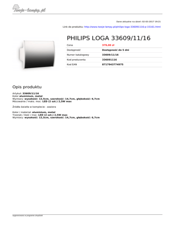 Dane aktualne na dzień: 02-03-2017 19:21 Link do produktu: http://www.twoje-lampy.pl/philips-loga-336091116-p-15161.html PHILIPS LOGA 33609/11/16 Cena 379,00 zł Dostępność Dostępność do 5 dni Numer katalogowy 33609/11/16 Kod producenta 336091116 Kod EAN 8717943774975 Opis produktu Artykuł: 33609/11/16 Kolor aluminium, metal Wymiary: wysokość: 12,5cm, szerokość: 14,7cm, głębokość: 6,7cm Mocowanie / maks. moc: LED (2 szt.) 2,5W max Źródła światła w komplecie: zawiera Kolor / materiał: aluminium, metal Trzonek / ilość / moc: LED (2 szt.) 2,5W max Wymiary: wysokość: 12,5cm, szerokość: 14,7cm, głębokość: 6,7cm wygenerowano w programie shopGold Powered by TCPDF (www.tcpdf.org)