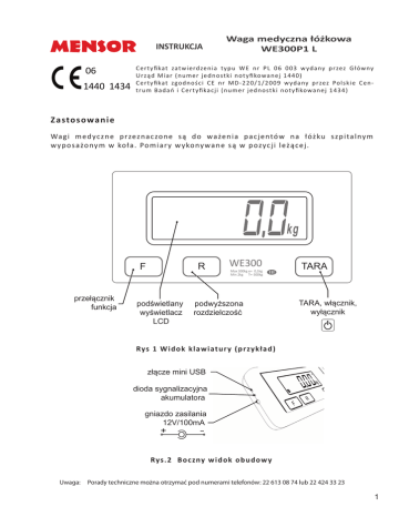 INSTRUKCJA 06 1440 1434 Waga medyczna łóżkowa WE300P1 L C e r t y fi kat zat w i e rd ze n i a t y p u W E n r P L 0 6 0 0 3 w yd a ny p r zez G łówny U r zą d M i a r ( n u m e r j e d n o st k i n o t y fi kowa n e j 1 4 4 0 ) C e r t y fi kat zgo d n o ś c i C E n r M D - 2 2 0 / 1 / 2 0 0 9 w yd a ny p r zez Po l s k i e C e n t r u m B a d a ń i C e r t y fi ka c j i ( n u m e r j e d n o st k i n o t y fi kowa n e j 1 4 3 4 ) Zastosowanie Wa g i m e d yc z n e p r zez n a c zo n e są d o wa że n i a p a c j e ntów n a łóż ku sz p i ta l ny m w y p o s a żo ny m w ko ła . Po m i a r y w y ko ny wa n e s ą w p ozyc j i l eż ą c e j . R F przełącznik funkcja podświetlany wyświetlacz LCD WE300 Max 300kg e= 0,1kg Min 2kg T=-300kg podwyższona rozdzielczość TARA TARA, włącznik, wyłącznik Rys 1 W i d o k k l aw i at u r y ( p r zy kła d ) złącze mini USB dioda sygnalizacyjna akumulatora gniazdo zasilania 12V/100mA Rys . 2 B o c z ny w i d o k o b u d o w y Uwaga: Porady techniczne można otrzymać pod numerami telefonów: 22 613 08 74 lub 22 424 33 23 1 Przygotowanie wagi do pracy 1 kółka ułatwiające transoprt wagi Podjedź wagą do łóżka 2 widok od spodu zespółu pomiarowego wagi Wprowadź zespoły pomiarowe pod łóżko. Tak aby oba znajdowały się symetrycznie względem osi łóżka i jak najbliżej kółek łóżka. kółka przeznaczone do wprowadzania zespołu pomiarowego pod łóżko Schemar usytuowania zespołów pomiarowych względem kółek. 3 Po staw wa gę n a t wa rd e j p oz i o my m p o d łożu . p raw i d łowe ws ka za n i e p oz i o m i c y b ł ęd n e ws ka za n i e p oz i o m i c y 2 4 podłącz zespoły pomiarowe wagi z zespołem wyświetlacza 5 TARA czekaj ≈ 5s 6 Wjedź łóżkiem na wagę (na zespoły pomiarowe) - „do oporu” - zwróć uwagę czy oba zespoły wykonały charakterystyczne „kiwnięcie się”. Pozycja wagi przed najechaniem łóżkiem Ważne! Nóżka opiera się o podłoże Schemat usytuowania zespołów pomiarowych względem kółek w trakcie ważeniia. Pozycja zespołu pomiarowego po prawidłowym najechaniu łóżkiem 7 Zablokuj hamulec w kole łóżka 3 8 TARA Przykładowa wartość na wyświetlaczu Tak przygotowana waga z łóżkiem jest gotowa do ważenie pacjenta Dodatkowa filtracja W przypadku drgań podłoża, na którym stoi waga lub niestabilnie leżącej lub siedzącej osoby ważonej można włączyć dodatkową filtrację oznaczoną na wyświetlaczu literami “F on”. 1. W początkowym stanie punkt (zerowe wskazanie wyświetlacza) naciśnij dwa razy przycisk F 2x F 2. Powtórne naciśnięcie przycisku F akceptuje stan “F on” lub stan “F off” tj. wyłączenie funkcji dodatkowej filtracji 3. Przełączenie między stanami: “F on” i “F off” wykonuje się naciskając przycisk TARA Po m i a r y “ M a ł e ze ro ” n a w yśw i et l a c z u oz n a c za , że n a l eży p o c ze ka ć d o m o m e nt u k i e d y p o j aw i s i ę “d u że ze ro ” a l b o n a c i s n ą ć p r zyc i s k TA R A . Ta ra d z i a ł a w ca ł y m za k re s i e p ra c y wa g i i zawęża ws ka za n i a wa g i o j e j wa r to ś ć . P r ze c i ą że n i e wa g i m a s ą w i ę ksz ą o d M ax p o d a n ą n a k l aw i at u r ze wa g i ws ka zy wa n e j e st p oz i o my m i k re s ka m i : lub W p r zy p a d ku b ra ku ze ra n a w yśw i et l a c z u n a l eży w y ł ą c zyć i p o n o w n i e w ł ą c zyć wa gę p r zy c i s k i e m TA R A’ 4 Zwiększona rozdzielczość W przypadku potrzeby dokładnego zważenia przyrostu małych mas np. określenie masy spożytego przez dziecko pokarmu naciśnij przycisk R i zważ dziecko przed karmieniem i po karmieniu. R Można nacisnąć i przytrzymać przycisk w celu odczytaniu wyniku ważenia Przykład pomiaru przyrostu masy Zatrzaskiwanie wyniku ważenia F ≈ 2s - 5s Wynik ważenia pozostaje dopuki użytkownik nie wytaruje wagi. Aby wyjść z funkcji zatrzaskiwania wyniku należy użyć przycisku TARA F Wyłączenie wagi. Naciśnij przycisk TARA i trzymaj kilka sekund - wskazania wyświetlacza znikną. TARA ≈ 3s 5 Praca z akumulatorem wewnętrznym włóż d o g n i a zd a sieciowe go 230V włóż do gniazda zasilacz stabilizowany wagi 12V/100mA Podłączanie do ładowania akumulatora wagi W wagach zastosowano zespół dwóch akumulatorów litowo-jonowych wraz z ukladem ładowania wyposażonym w diodę świecącą znajdującą się obok gniazda zasilania i sygnalizującą stan ładowania. Możliwe są następujące stany: - dioda nie świeci - zasilacz nie podłączony lub przy podłączonym zasilaczu akumulator całkowicie naładowany - dioda świeci w sposób ciągły - zasilacz podłączony, akumulator w trakcie ładowania - dioda miga (częstotliwość migania - kilkadziesiąt sekund) - zasilacz podłączony, ładowanie przerwane; należy wyłączyć zasilanie wagi, ponownie podłączyć zasilanie bez włączania wagi przyciskiem TARA Podczas ładowania zasilacz powinien być podłączony do wagi, natomiast waga powinna być wyłączona (włączenie wagi może spowodować błąd ładowania i konieczność ponownego rozpoczęcia cyklu ładowania). - maksymalny czas ładowania (od pełnego rozładowania do pełnego naładowania) 15 godzin - minimalny czas pracy od pełnego naładowania około 30 godzin - rozładowanie akumulatora sygnalizowane jest znakiem LOW BAT w lewym górnym rogu wyświetlacza (pojawia się na około 10 godzin przed ostatecznym rozładowaniem akumulatora). - do ładowania akumulatora korzystaj z zasilacza stabilizowanego 12V/100mA lub 12V/250mA - w wagach wyposażonych w zasilanie akumulatorowe, dla zwiększenia żywotności akumulatora należy możliwie często z niego korzystać. Podczas dłuższych przerw w pracy akumulator nie powinien być całkowicie naładowany lub całkowicie rozładowany DEKLARACJA ZGODNOŚCI z dyrektywą 93/42/EEC aparatury medycznej i dyrektywą 90/384/EEC wag nieautomatycznych 06 Zakład Mechanik