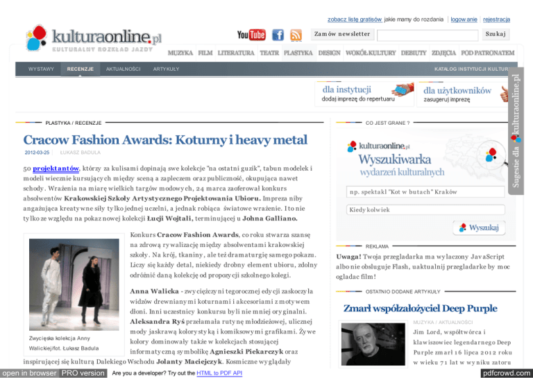 zobacz listę gratisów jakie mamy do rozdania logow anie rejestracja Za m ów n ew slet t er Szu k a j RSS WY STAWY RECENZJE AKTUALNOŚCI ARTY KUŁY PLASTY KA / RECENZJE KATALOG INSTYTUCJI KULTURY CO JEST GRANE ? Cracow Fashion Awards: Koturny i heavy metal 2012-03-25 ŁUKASZ BADULA 50 projekt ant ów, którzy za kulisam i dopinają swe kolekcje "na ostatni guzik", tabun m odelek i m odeli wiecznie kursujący ch m iędzy sceną a zapleczem oraz publiczność, okupująca nawet schody . Wrażenia na m iarę wielkich targów m odowy ch, 2 4 m arca zaoferował konkurs absolwentów Krakowskiej Szkoły Art y st y cznego Projekt owania Ubioru. Im preza niby angażująca kreaty wne siły ty lko jednej uczelni, a jednak robiąca światowe wrażenie. I to nie n p. spek t a k l "Kot w bu t a ch " Kr a k ów Kiedy k olw iek ty lko ze względu na pokaz nowej kolekcji Łucji Wojt ali, term inującej u Johna Galliano. Konkurs Cracow Fashion Awards, co roku stwarza szansę na zdrową ry walizację m iędzy absolwentam i krakowskiej Uwaga! Twoja przegladarka m a wy laczony Jav aScript Liczy się każdy detal, niekiedy drobny elem ent ubioru, zdolny albo nie obsluguje Flash, uaktualnij przegladarke by m oc odróżnić daną kolekcję od propozy cji szkolnego kolegi. ogladac film ! Anna Walicka - zwy ciężczy ni tegorocznej edy cji zaskoczy ła widzów drewniany m i koturnam i i akcesoriam i z m oty wem dłoni. Inni uczestnicy konkursu by li nie m niej ory ginalni. Zwycięska kolekc ja Anny Walic kiej/fot. Łukasz Badula OSTATNIO DODANE ARTY KUŁY Zmarł współzałożyciel Deep Purple Aleksandra Ry ś przełam ała ruty nę m łodzieżowej, ulicznej MUZY KA / AKTUALNOŚCI m ody jaskrawą kolory sty ką i kom iksowy m i grafikam i. Ży we Jim Lor d, w spółt w ór ca i kolory dom inowały także w kolekcjach stosującej k la w iszow iec leg en da r n eg o Deep inform aty czną sy m bolikę Agnieszki Piekarczy k oraz Pu r ple zm a r ł 1 6 lipca 2 0 1 2 r ok u inspirującej się kulturą Dalekiego Wschodu Jolant y Maciejczy k. Kosm iczne wy glądały open in browser PRO version REKLAMA szkoły . Na krój, tkaniny , ale też dram aturgię sam ego pokazu. Are you a developer? Try out the HTML to PDF API w w iek u 7 1 la t w w y n ik u za t or u pdfcrowd.com świecące w ciem ności buty z futury sty cznego pokazu Lidii Sajdak, która nawiązy wała m .in. do t ęt n icy płu cn eg o. Od... film u "2046". Film owe odwołania cechowały i pokaz Magdaleny Mól, przy wołującej m iłe skojarzenia z dziełam i Tima Burt ona. Wszy scy projekt anci zadbali o należy tą świetlnom uzy czną oprawę każdego pokazu. Z głośników m ożna by ło usły szeć m .in. goty cki heav y m etal Ty pe O Negat ive (!). Nowości w Klubie KulturaOnline.pl W t y m t y g odn iu w śr ód g r a t isy w szczeg óln ości pow in n y pr zy pa ść do g u st u w ielbicielom lit er a t u r y fa k t u , r epor t a żu . Ma m y dla W a s t r zy k sią żk i -... Główną bohaterką wieczoru by ła bez wątpienia wspom niana Anna Walicka. Młoda projektankta zdoby ła zarówno nagrodę Zalegalizuj swoją przestrzeń profesjonalnego jury (Rady Wy sokich Krawców),jak i dziennikarzy (Rady Mediów). Kolekcję Walickiej pt. "N- 1 8 lipca o g odz. 1 7 :3 0 n a t er en ie Pla cu W oln ości w Łodzi Hill" wy różniały nie ty lko wspom niane, ręcznie rzeźbione r ozpoczn ie się a k cja a r t y st y czn a Ew y Pa r t u m koturny (autorka skończy ła kurs konstrukcji obuwia). n a w ią zu ją ca do jej pr ojek t u z 1 9 7 1 r ok u . Widzowie m ogli bowiem podziwiać także nadrukowane Marta Makary - Barbarian/fot. Łukasz m oty wy czy niety powy krój nakry ć wierzchnich. Całość by ła Badula propozy cją o bardziej arty sty czny m niż uży tkowy m przeznaczeniu. Nergal jak na spowiedzi Smarzowski kręci Pilcha Podczas Cracow Fashion Awards swoje wy różnienia przy znawali ponadto i sponsorzy i pojedy nczy przedstawiciele m ediów. Teraz przed projektantam i, kto wie, czy nie najtrudniejsza próba. Ich REKLAMA prace ocenią bowiem internauci. 2 8 m arca na witry nie szkoły startuje głosowanie na najlepszą kolekcję. Potrwa ono do 4 kwietnia. TAGI Poza konkursowy m i em ocjam i, m iłośników m ody w Krakowie czeka jeszcze sporo at rakcji. Sobotnia im preza w NCK-u zainicjowała cały cy kl im prez pod hasłem Cracow Fashion Week. W jego ram ach m .in. otwarta sesja zdjęciowa na Ry nku Główny m oraz Targi Dizajnu w Kom pany . odwiedź witry nę KSAPU tutaj [rec] bilety co jest grane cza r n y ła będź esk 2 01 6 europejska stolica kultury 2 01 6 horror joh n n y depp gratisy klub kulturaonline klub kulturaonline.pl koncert konkurs k om ik s konkurs konkurs konkurs kreatywni k r y m in a ł k u lt u r a on lin e.pl la dy g a g a m ich a el ja ck son na co do kina na co do kina? open in browser PRO version Are you a developer? Try out the HTML to PDF API pdfcrowd.com do kina? n a sza k sięg a r n ia n ow a pły t a nowości nowości film owe n ow ości k in ow e n ow ości w k lu bie nowości w klubie kulturaonline pr em ier a premiery filmowe premiery kinowe pr zesłu ch a ln ia on lin e rec Podziel się | | Na pisz a r t y k u l r ecen zja r ecen zja serial son da t ele-k u lt u r a on lin e t eledy sk trailer cracow fashion awards , cracow fashion week , moda , ksapu TAGI recenzja trailery zwiastun w r ocła w w y w ia d znak zwiastuny ARTY KUŁY POWIĄZANE Młoda moda w Moda ze szkła Szklana moda w Krakowie Kopenhadze Kt ór y ze św ieżo Szk la n e poń czoch y , t or ebk i, Niet y pow ą w y st a w ę szy k u je dy plom ow a n y ch pr ojek t a n t ów pa n t ofle, su k ien k i i h a lk i do Mu zeu m Szt u k i i W zor n ict w a r ok u je n a jw ięk sze n a dzieje n a og lą da n ia (i pr zy m ier za n ia ) w Kopen h a dze. Niet y pow ą z pr zy szłość? Odpow iedź 2 4 zn a la zły się n a ek spozy cji dw óch pow odów - po pier w sze m a r ca podcza s 4 . edy cji "Gla ss-a -por t er " w k r a k ow sk iej pok a za