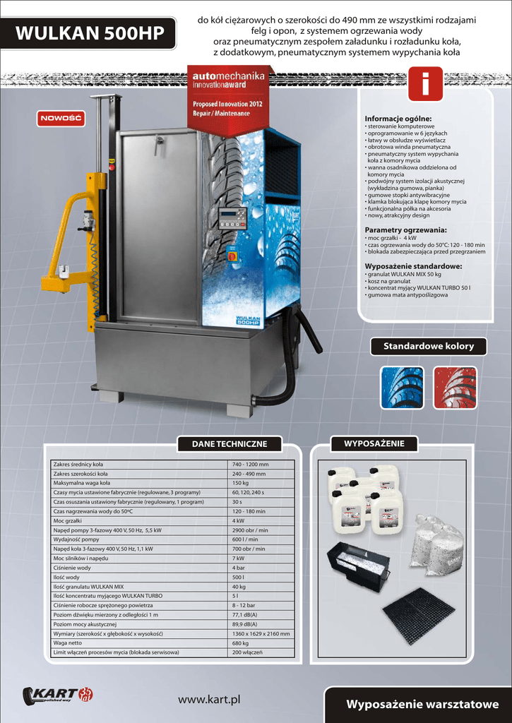 do kół ciężarowych o szerokości do 490 mm ze wszystkimi rodzajami felg i opon, z systemem ogrzewania wody oraz pneumatycznym zespołem załadunku i rozładunku koła, z dodatkowym, pneumatycznym systemem wypychania koła WULKAN 500HP Informacje ogólne: NOWOŚĆ • sterowanie komputerowe • oprogramowanie w 6 językach • łatwy w obsłudze wyświetlacz • obrotowa winda pneumatyczna • pneumatyczny system wypychania koła z komory mycia • wanna osadnikowa oddzielona od komory mycia • podwójny system izolacji akustycznej (wykładzina gumowa, pianka) • gumowe stopki antywibracyjne • klamka blokująca klapę komory mycia • funkcjonalna półka na akcesoria • nowy, atrakcyjny design Parametry ogrzewania: • moc grzałki - 4 kW • czas ogrzewania wody do 50°C: 120 - 180 min • blokada zabezpieczająca przed przegrzaniem Wyposażenie standardowe: • granulat WULKAN MIX 50 kg • kosz na granulat • koncentrat myjący WULKAN TURBO 50 l • gumowa mata antypoślizgowa Standardowe kolory DANE TECHNICZNE Zakres średnicy koła 740 - 1200 mm Zakres szerokości koła 240 - 490 mm Maksymalna waga koła 150 kg Czasy mycia ustawione fabrycznie (regulowane, 3 programy) 60, 120, 240 s Czas osuszania ustawiony fabrycznie (regulowany, 1 program) 30 s Czas nagrzewania wody do 50ºC 120 - 180 min Moc grzałki 4 kW Napęd pompy 3-fazowy 400 V, 50 Hz, 5,5 kW 2900 obr / min Wydajność pompy 600 l / min Napęd koła 3-fazowy 400 V, 50 Hz, 1,1 kW 700 obr / min Moc silników i napędu 7 kW Ciśnienie wody 4 bar Ilość wody 500 l Ilość granulatu WULKAN MIX 40 kg Ilość koncentratu myjącego WULKAN TURBO 5l Ciśnienie robocze sprężonego powietrza 8 - 12 bar Poziom dźwięku mierzony z odległości 1 m 77,1 dB(A) Poziom mocy akustycznej 89,9 dB(A) Wymiary (szerokość x głębokość x wysokość) 1360 x 1629 x 2160 mm Waga netto 680 kg Limit włączeń procesów mycia (blokada serwisowa) 200 włączeń www.kart.pl WYPOSAŻENIE Wyposażenie warsztatowe