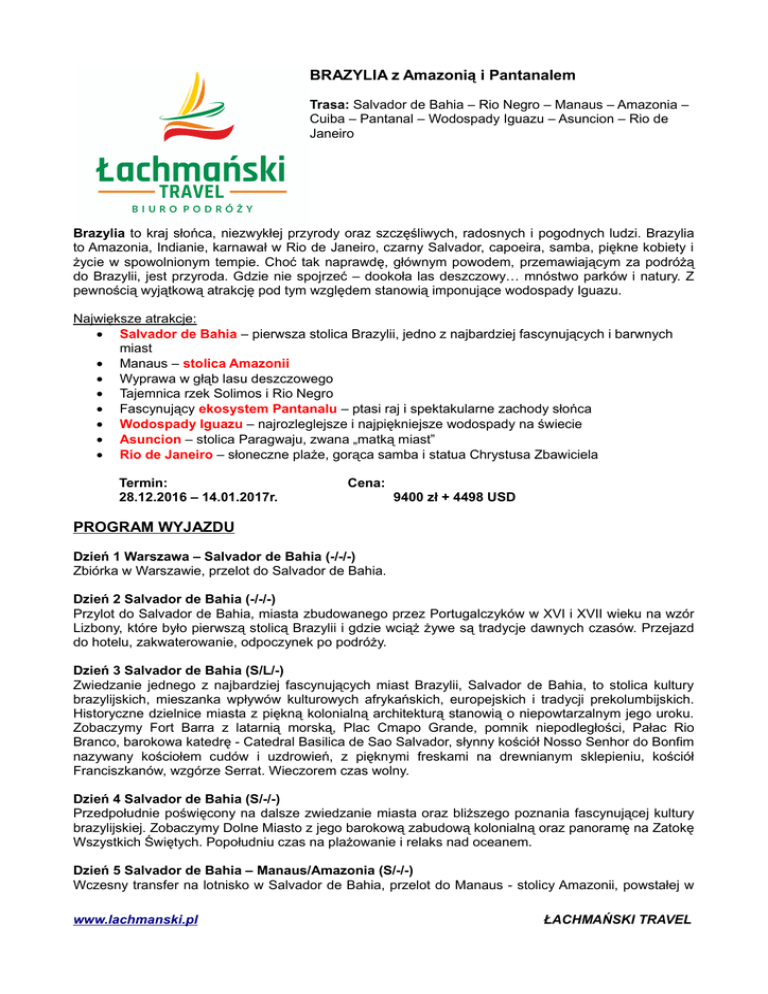 BRAZYLIA z Amazonią i Pantanalem Trasa: Salvador de Bahia – Rio Negro – Manaus – Amazonia – Cuiba – Pantanal – Wodospady Iguazu – Asuncion – Rio de Janeiro Brazylia to kraj słońca, niezwykłej przyrody oraz szczęśliwych, radosnych i pogodnych ludzi. Brazylia to Amazonia, Indianie, karnawał w Rio de Janeiro, czarny Salvador, capoeira, samba, piękne kobiety i życie w spowolnionym tempie. Choć tak naprawdę, głównym powodem, przemawiającym za podróżą do Brazylii, jest przyroda. Gdzie nie spojrzeć – dookoła las deszczowy… mnóstwo parków i natury. Z pewnością wyjątkową atrakcję pod tym względem stanowią imponujące wodospady Iguazu. Największe atrakcje: Salvador de Bahia – pierwsza stolica Brazylii, jedno z najbardziej fascynujących i barwnych miast Manaus – stolica Amazonii Wyprawa w głąb lasu deszczowego Tajemnica rzek Solimos i Rio Negro Fascynujący ekosystem Pantanalu – ptasi raj i spektakularne zachody słońca Wodospady Iguazu – najrozleglejsze i najpiękniejsze wodospady na świecie Asuncion – stolica Paragwaju, zwana „matką miast” Rio de Janeiro – słoneczne plaże, gorąca samba i statua Chrystusa Zbawiciela Termin: 28.12.2016 – 14.01.2017r. Cena: 9400 zł + 4498 USD PROGRAM WYJAZDU Dzień 1 Warszawa – Salvador de Bahia (-/-/-) Zbiórka w Warszawie, przelot do Salvador de Bahia. Dzień 2 Salvador de Bahia (-/-/-) Przylot do Salvador de Bahia, miasta zbudowanego przez Portugalczyków w XVI i XVII wieku na wzór Lizbony, które było pierwszą stolicą Brazylii i gdzie wciąż żywe są tradycje dawnych czasów. Przejazd do hotelu, zakwaterowanie, odpoczynek po podróży. Dzień 3 Salvador de Bahia (S/L/-) Zwiedzanie jednego z najbardziej fascynujących miast Brazylii, Salvador de Bahia, to stolica kultury brazylijskich, mieszanka wpływów kulturowych afrykańskich, europejskich i tradycji prekolumbijskich. Historyczne dzielnice miasta z piękną kolonialną architekturą stanowią o niepowtarzalnym jego uroku. Zobaczymy Fort Barra z latarnią morską, Plac Cmapo Grande, pomnik niepodległości, Pałac Rio Branco, barokowa katedrę - Catedral Basilica de Sao Salvador, słynny kościół Nosso Senhor do Bonfim nazywany kościołem cudów i uzdrowień, z pięknymi freskami na drewnianym sklepieniu, kościół Franciszkanów, wzgórze Serrat. Wieczorem czas wolny. Dzień 4 Salvador de Bahia (S/-/-) Przedpołudnie poświęcony na dalsze zwiedzanie miasta oraz bliższego poznania fascynującej kultury brazylijskiej. Zobaczymy Dolne Miasto z jego barokową zabudową kolonialną oraz panoramę na Zatokę Wszystkich Świętych. Popołudniu czas na plażowanie i relaks nad oceanem. Dzień 5 Salvador de Bahia – Manaus/Amazonia (S/-/-) Wczesny transfer na lotnisko w Salvador de Bahia, przelot do Manaus - stolicy Amazonii, powstałej w www.lachmanski.pl ŁACHMAŃSKI TRAVEL okresie boomu kauczukowego. Po przylocie przejazd do hotelu, następnie spacer z pilotem po centrum miasta – m. in. katedra, Teatro Amazonas, Opera Colon, Palacio Rio Negro, targ miejski, relaks w jeden z kafejek nad największą rzeką świata. Nocleg w Manaus. Dzień 6 Amazonia (S/L/K) Przejazd busem z Manaus, następnie rejs łodzią motorową po Amazonce, w głąb dżungli do miejsca gdzie spotykają się rzeki Solimos i Rio Negro – tu czeka nas jeden z największych spektakli natury, spotkanie dwóch potężnych rzek które różnią się nie tylko barwą ale także temperaturą wody. W godzinach południowych zakwaterowanie w logi. Po lunchu rejs lodzą motorową po okolicy położonej na terenie rezerwatu chroniącego zalewowe lasy Igapo. Po kolacji nocne safari w poszukiwaniu kajmanów i innych zwierzą aktywnych nocą. Nocleg w dżungli. Dzień 7 Amazonia (S/L/K) O wschodzie słońca rejs połączony z obserwacją ptaków i innych mniejszych oraz większych mieszkańców Amazonii. Powrót na śniadanie, następnie trekking po lesie amazońskim i bliskie spotkanie z potęgą i pięknem kruchego bogactwa lasów Amazonii. Powrót na lunch. Dalej kolejna wycieczka - tym razem spróbujemy połowów piranii. Nocleg w dżungli. Dzień 8 Amazonia/Manaus – Cuiba/Pantanal (S/-/-) Powrót do Manaus, przejazd na lotnisko. Przelot z przesiadką do Cuiabá, miasta będącego „bramą” do jednego z najbogatszych przyrodniczo obszarów na świecie. Po przylocie transfer do hotelu, nocleg w Cuiba. Dzień 9 Pantanal (S/L/K) Rozpoczynamy przygodę w Pantanal. To unikalne miejsce w skali kontynentu, jedne z największych obszarów podmokłych naszej planecie. To obszar ponad 230.tys.km2, posiadający zróżnicowane siedliska od lasów tropikalnych wiecznie zielonych w części północnej po lasy okresowo suche, sawanny i tereny trawiaste. Ogromne bogactwo fauny związane jest z sezonowością klimatu (pora sucha i deszczowa) jaki i różnorodnością flory. Największym bogactwem fauny Pantanalu są ptaki- jest tu 700 gatunków płatków. Przejazd w głąb jednego z największych terenów zalewowych w Ameryce Południowej. Podczas przejazdu postoje w najciekawszych i najbardziej spektakularnych miejscach Pantanalu. Po dotarciu do ecologdge zakwaterowanie. W tym niezwykłym miejscu czekają nas wycieczki piesze, wycieczki łodziami motorowym. Jednym z najważniejszych punktów tego dnie będzie spektakularny zachód słońca. Nocleg w Pantanal. Dzień 10 Pantanal (S/L/K) Pantanal to ptasi raj a o wschodzie słońca najłatwiej spotkać i usłyszeć skrzydlatych mieszkańców tego unikalnego miejsca na Ziemi. Wycieczka o wschodzie słońca. Po śniadaniu safari przyrodniczofotograficzne. Powrót na lunch. Następnie rejs po labiryncie zalewowych terenów Pantanalu i kolejna okazja podziwiania spektakularnego zachodu słońca. Nocleg w Pantanal. Dzień 11 Pantanal/Cuiba (S/L/-) Wcześnie rano wyruszymy w rejs podczas którego będziemy mieli okazje do spotkania z małymi I dużymi mieszkańcami Pantanalu. Po lunchu powrót do Cuiaba, czas wolny. Nocleg w Cuib