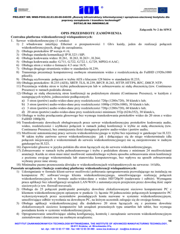 PROJEKT NR: WND-POIG.02.03.00-00-040/09 „Rozwój infrastruktury informatycznej i sprzętowo-sieciowej Instytutu dla poprawy zarządzania i transferu technologii” DOTACJE NA INNOWACJE Załącznik Nr 2 do SIWZ OPIS PRZEDMIOTU ZAMÓWIENIA Centralna platforma wideokonferencji wielopunktowych: 1. Serwer wideokonferencyjny (1 sztuka): 1) 2 wbudowane interfejsy Ethernet o przepustowości 1 Gb/s każdy, jeden do realizacji połączeń wideokonferencyjnych, drugi do zarządzania; 2) Obsługa protokołów IP wersja 4 i 6; 3) Obsługa standardu komunikacji IP H.323 i SIP; 4) Obsługa kodowania wideo: H.261, H.263, H.263+, H.264; 5) Obsługa kodowania audio: G.711, G.722, G.722.1, G.729, MPEG-4 AAC; 6) Obsługa stron z wideo o formacie 4:3 oraz 16:9; 7) Obsługa drugiego strumienia wideo w standardzie H.239; 8) Transmisja prezentacji komputerowej osobnym strumieniem wideo z rozdzielczością do FullHD (1920x1080 pikseli); 9) Obsługą szyfrowania połączeń w trybie AES z kluczem 128 bitów w standardzie H.235; 10) Obsługa protokołów: H.235 (AES), SRTP, TLS, H.239, BFCP, H.243, HTTP, HTTPS, RFC, DHCP, NTP; 11) Prezentacja widoku stron w trybie pełnoekranowym lub w zobrazowaniu ze stałą obecnością (tzw. Continuous Presence) w ramach podziału ekranu; 12) Obsługa ze stałą obecnością stron konferencji na podzielonym ekranie (Continuous Presence), w każdym z następujących trybów, jednocześnie podłączonych: a) 5 stron (portów) audio-wideo-dane przy rozdzielczości 720p (1280x720), 30 klatek/s lub; b) 3 stron (portów) audio-wideo-dane przy rozdzielczości 1080p (1920x1080), 30 klatek/s lub; c) 3 stron (portów) audio-wideo-dane przy rozdzielczości 720p (1280x720), 60 klatek/s lub; d) 20 stron (portów) audio-wideo-dane przy rozdzielczości minimum 352p (624x352), 30 klatek/s, 13) Obsługa w trybie przełączania głosowego bez wymogu transkodowania protokołów wideo do 20 stron z wideo FullHD 1080p30; 14) Transkodowanie dowolnych obsługiwanych przez serwer wideokonferencyjny protokołów kodowania audio, wideo, rozdzielczości i szybkości połączeń w ramach jednej konferencji w trybie ze stałą obecnością (tzw. Continuous Presence), bez zmniejszenia ilości dostępnych portów audio-wideo i portów audio; 15) Możliwość autonomicznej pracy serwera wideokonferencyjnego w trybie bez rejestracji w gatekeepe’rze H.323. W takim trybie zarówno serwer wideokonferencyjny jak i dołączające się do niego wideoterminale (dla połączeń inicjowanych z wideoterminali do serwera wideokonferencyjnego) nie są zarejestrowane w żadnym gatekeepe'rze H.323, 16) Zapowiedzi głosowe w języku polskim dla stron łączących się do serwera wideokonferencyjnego, 17) Zobrazowanie w ramach trybu pełnoekranowego i trybu z podziałem ekranu z minimum 24 możliwościami aranżacji. Każda ze stron musi mieć możliwość samodzielnego wyboru sposobu zobrazowania stron konferencji z poziomu swojego wideoterminala lub stanowiska komputerowego, bez wpływu na sposób zobrazowania wybrany przez inne strony. 18) Minimalne pasmo przenoszenia dźwięku w wideokonferencjach wielopunktowych na serwerze: 14 kHz, Pozostałe urządzenia i funkcje centralnej platformy wideokonferencji wielopunktowych: 1) Udostępnianie w formule klient-serwer możliwości pobierania oprogramowania pozwalającego na instalację na komputerze PC software’owego klienta wideokonferencyjnego, umożliwiającego realizację połączeń wideokonferencyjnych w formule audio-wideo-dane z wideo HD720p30 (nadawanie i odbiór). Wymagana praca aplikacji bez rekonfiguracji urządzeń LAN/WAN z automatycznym przejściem przez dowolną ilość zapór sieciowych (z tzw. firewall traversal); 2) Obsługa do 25 połączeń punkt-punkt pomiędzy dowolnie zlokalizowanymi sieciowo komputerami PC z klientem wideokonferencyjnym opisanym w punkcie 1); łącznie 50 jednocześnie połączonych komputerów PC wykorzystywanych przez uczestników posiadających konta nazwane w systemie wideokonferencyjnym, umożliwiające odbiór wywołania na dowolnym PC, na którym uczestnik zaloguje się do swojego konta; 3) Obsługa aplikacji wideokonferencyjnej dla dodatkowo 20 stron łączących się z poziomu dowolnie zlokalizowanych sieciowo komputerów lub urządzeń przenośnych typu smartfon lub tablet, bez wymogu posiadania konta w systemie wideokonferencyjnym; 4) Oprogramowanie umożliwiające zdalną konfigurację, kontrolę i zarządzanie serwerem wideokonferencyjnym zainstalowane i dostarczone na osobnym urządzeniu; 10 INSTYTUT ZAAWANSOWANYCH TECHNOLOGII WYTWARZANIA, THE INSTITUTE OF ADVANCED MANUFACTURING TECHNOLOGY, 30-011 Kraków, ul. Wrocławska 37a, tel. dyr. +48 12 63 17 100 ⋅ fax +48 12 63 39 490 ⋅ www.ios.krakow.pl ⋅ [email protected] PROJEKT NR: WND-POIG.02.03.00-00-040/09 „Rozwój infrastruktury informatycznej i sprzętowo-sieciowej Instytutu dla poprawy zarządzania i transferu technologii” DOTACJE NA INNOWACJE 5) Zdalna administracja podstawowymi parametrami wideokonferencji realizowanych na platformie wideokonferencji wielopunktowych z poziomu urządzeń dotykowych typu smartfon lub tablet; 6) Dostępne z poziomu przeglądarki WWW: kalendarz wideokonferencji, harmonogram planowanych wideokonferencji i system rezerwacji wideokonferencji oraz globalna książka adresowa; 7) Gatekeeper H.323 dla minimum 200 zarejestrowanych stron; 8) Rejestracja połączeń audio-wideo-dane w rozdzielczości 720p z odświeżaniem obrazu z szybkością 30 klatek/s dla 1 z prowadzonych jednocześnie wideokonferencji (1 port nagrywania); 9) Transmisja strumieniowa High Definition (streaming) audio-wideo-dane do minimum 600 odbiorców jednocześnie poprzez sieć IP w trybie unicast; 10) Możliwość zabezpieczenia wejścia do wideokonferencji hasłem; 11) W razie potrzeby należy dostarczyć odpowiednią dodatkową platformę sprzętową instalowaną w szafie 19”, zapewniającą nagranie min 1000 godzin konferencji (audio+ dane+wideo); 12) Dost