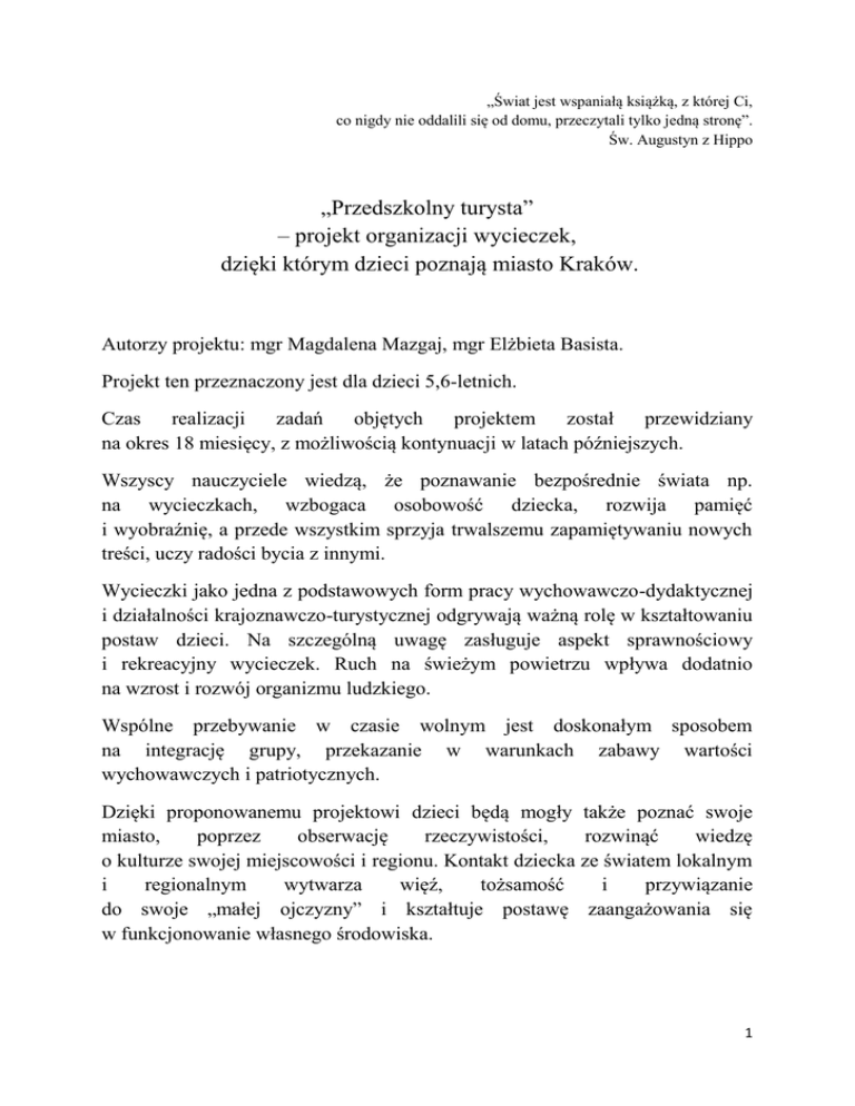 „Świat jest wspaniałą książką, z której Ci, co nigdy nie oddalili się od domu, przeczytali tylko jedną stronę”. Św. Augustyn z Hippo „Przedszkolny turysta” – projekt organizacji wycieczek, dzięki którym dzieci poznają miasto Kraków. Autorzy projektu: mgr Magdalena Mazgaj, mgr Elżbieta Basista. Projekt ten przeznaczony jest dla dzieci 5,6-letnich. Czas realizacji zadań objętych projektem został przewidziany na okres 18 miesięcy, z możliwością kontynuacji w latach późniejszych. Wszyscy nauczyciele wiedzą, że poznawanie bezpośrednie świata np. na wycieczkach, wzbogaca osobowość dziecka, rozwija pamięć i wyobraźnię, a przede wszystkim sprzyja trwalszemu zapamiętywaniu nowych treści, uczy radości bycia z innymi. Wycieczki jako jedna z podstawowych form pracy wychowawczo-dydaktycznej i działalności krajoznawczo-turystycznej odgrywają ważną rolę w kształtowaniu postaw dzieci. Na szczególną uwagę zasługuje aspekt sprawnościowy i rekreacyjny wycieczek. Ruch na świeżym powietrzu wpływa dodatnio na wzrost i rozwój organizmu ludzkiego. Wspólne przebywanie w czasie wolnym jest doskonałym sposobem na integrację grupy, przekazanie w warunkach zabawy wartości wychowawczych i patriotycznych. Dzięki proponowanemu projektowi dzieci będą mogły także poznać swoje miasto, poprzez obserwację rzeczywistości, rozwinąć wiedzę o kulturze swojej miejscowości i regionu. Kontakt dziecka ze światem lokalnym i regionalnym wytwarza więź, tożsamość i przywiązanie do swoje „małej ojczyzny” i kształtuje postawę zaangażowania się w funkcjonowanie własnego środowiska. 1 Tworząc ten projekt miałyśmy na uwadze uświadomienie dzieciom i rodzicom wartości i walory turystyki pieszej, zachęcanie do aktywnego, zdrowego i twórczego spędzania czasu. Zachęcone przez dzieci, które bardzo lubią każdą formę aktywności ruchowej, postanowiłyśmy stworzyć projekt, który połączyłby "przyjemne z pożytecznym". I tak powstał Projekt Wycieczek po Krakowie i okolicy „Przedszkolny turysta". Podstawą projektu jest popularyzacja turystyki pieszej i krajoznawstwa. Cele główne: zachęcenie najmłodszych do uprawiania wędrówek pieszych i poznawania ojczystego kraju, a przede wszystkim okolicy miejsca zamieszkania; podnoszenie kondycji zdrowotnej i sprawności fizycznej; wspomaganie rodziny w procesie aktywnego i zdrowego wychowania; poznanie bliższego i dalszego regionu, jego środowiska przyrodniczego, tradycji, zabytków kultury, historii oraz baśni i legend. Cele szczegółowe: dziecko: rozumie potrzebę aktywnego wypoczynku i wyrabia w sobie nawyk czynnego spędzania czasu wolnego; poznaje i stosuje podstawowe zasady bezpieczeństwa w czasie poruszania się po drogach, ulicach i w podróży, i w trakcie całej wycieczki; uczy się umiejętności obserwacji środowiska i wyciągania wniosków; nabywa umiejętności współpracy w grupie i dostrzega wartości kontaktów przyjacielskich; rozumie konieczność ochrony środowiska naturalnego; wie, jak bezpiecznie korzystać z publicznych środków transportu. 2 Realizacja Podstawy Programowej obszary podstawowe: 6/5 próbuje samodzielnie i bezpiecznie organizować sobie czas wolny w przedszkolu i w domu; ma rozeznanie, gdzie można się bezpiecznie bawić, a gdzie nie; 9/1 przejawia, w miarę swoich możliwości, zainteresowanie wybranymi zabytkami i dziełami sztuki oraz tradycjami i obrzędami ludowymi ze swojego regionu; 9/3 wykazuje zainteresowanie malarstwem, rzeźbą i architekturą (także architekturą zieleni i architekturą wnętrz); 5/3 jest sprawne fizycznie lub jest sprawne w miarę swoich możliwości, jeżeli jest dzieckiem mniej sprawnym ruchowo; 6/2 orientuje się w bezpiecznym poruszaniu się po drogach i korzystaniu ze środków transportu; obszary dodatkowe: 1/2 przestrzega reguł obowiązujących w społeczności dziecięcej (stara się współdziałać w zabawach i w sytuacjach zadaniowych) oraz w świecie dorosłych; 1/3 w miarę samodzielnie radzi sobie w sytuacjach życiowych i próbuje przewidywać skutki swoich zachowań; 3/1 zwraca się bezpośrednio do rozmówcy, stara się mówić poprawnie pod względem artykulacyjnym, gramatycznym, fleksyjnym i składniowym; 3/2 mówi płynnie, niezbyt głośno, dostosowując ton głosu do sytuacji; 3/3 uważnie słucha, pyta o niezrozumiałe fakty i formułuje dłuższe wypowiedzi o ważnych sprawach; 3/4 w zrozumiały sposób mówi o swoich potrzebach i decyzjach; 7/1 wie, jak należy się zachować na uroczystościach, np. na koncercie, festynie, przedstawieniu, w teatrze, w kinie; 3 13/4 rozróżnia stronę lewą i prawą, określa kierunki i ustala położenie obiektów w stosunku do własnej osoby, a także w odniesieniu do innych obiektów; 14/7 rozumie sens informacji podanych w formie uproszczonych rysunków oraz często stosowanych oznaczeń i symboli, np. w przedszkolu, na ulicy, na dworcu. 15/2 zna nazwę miejscowości, w której mieszka, zna ważniejsze instytucje i orientuje się w rolach społecznych pełnionych przez ważne osoby, np. policjanta, strażaka; 15/3 wie, jakiej jest narodowości, że mieszka w Polsce, a stolicą Polski jest Warszawa; 15/4 nazywa godło i flagę państwową, zna polski hymn i wie, że Polska należy do Unii Europejskiej; 15/5 wie, że wszyscy ludzie mają równe prawa. Metody pracy wykorzystane w projekcie: wielozmysłowe poznawanie świata poprzez własne doświadczenie zdobyte drogą obserwacji, przeżywania i działania; metody czynne, oparte na organizowaniu aktywnego udziału dziecka, na zasadzie partnerstwa; metoda dominująca to bezpośrednia obserwacja rzeczywistości. Zawarte treści mają umożliwić dzieciom zdobycie podstawowej wiedzy na temat naszego regionu, miejsc pamięci narodowej i zabytków w naszym mieście i jego okolicach, jak również zachęcić dzieci i dorosłych do uprawiania turystyki pieszej. Zasady obowiązujące podczas realizacji proje
