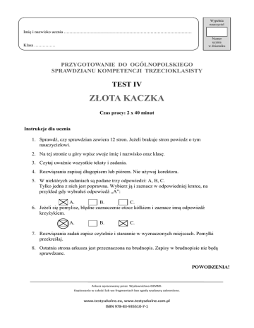 Wypełnia nauczyciel Imię i nazwisko ucznia ……………………………………………………………………………… Numer ucznia w dzienniku Klasa …………… PRZYGOTOWANIE DO OGÓLNOPOLSKIEGO SPRAWDZIANU KOMPETENCJI TRZECIOKLASISTY TEST IV ZŁOTA KACZKA Czas pracy: 2 x 40 minut Instrukcje dla ucznia 1. Sprawdź, czy sprawdzian zawiera 12 stron. Jeżeli brakuje stron powiedz o tym nauczycielowi. 2. Na tej stronie u góry wpisz swoje imię i nazwisko oraz klasę. 3. Czytaj uważnie wszystkie teksty i zadania. 4. Rozwiązania zapisuj długopisem lub piórem. Nie używaj korektora. 5. W niektórych zadaniach są podane trzy odpowiedzi: A, B, C. Tylko jedna z nich jest poprawna. Wybierz ją i zaznacz w odpowiedniej kratce, na przykład gdy wybrałeś odpowiedź „A”: A. B. C. 6. Jeżeli się pomylisz, błędne zaznaczenie otocz kółkiem i zaznacz inną odpowiedź krzyżykiem. A. B. C. 7. Rozwiązania zadań zapisz czytelnie i starannie w wyznaczonych miejscach. Pomyłki przekreślaj. 8. Ostatnia strona arkusza jest przeznaczona na brudnopis. Zapisy w brudnopisie nie będą sprawdzane. POWODZENIA! Arkusz opracowany przez Wydawnictwo GEMMI. Kopiowanie w całości lub we fragmentach bez zgody wydawcy zabronione. www.testyszkolne.eu, www.testyszkolne.com.pl ISBN 978-83-935510-7-1 ZŁOTA KACZKA CZĘŚĆ POLONISTYCZNA Dawno temu w Warszawie żył sobie młody chłopiec Lutek. Był szewczykiem i pracował w jednym z zakładów na Starym Mieście. Był bardzo ubogi i żył tylko z tego, co udało mu się zarobić u majstra. Wieczorami często przesiadywał w gospodzie i słuchał opowieści starszych mieszkańców. Pewnego wieczoru usłyszał cichą rozmowę majstrów. - Podobno na Tamce, w podziemiach Zamku Ostrogskich, można spotkać Złotą Kaczkę - tajemniczym szeptem mówił mistrz Jan. - Słyszałem, że to piękny ptak, ale też bardzo przebiegły i niebezpieczny - dodał mistrz Bartłomiej. - Szukając kaczki można zabłądzić w podziemiach i nigdy nie wrócić na powierzchnię. Mówią, że wielu już próbowało i słuch o nich zaginął - odezwał się znowu mistrz Jan. - A jeśli ktoś spotka kaczkę? - zapytał młody Staś, syn jednego z majstrów. - Wtedy kaczka uczyni go bogatym na zawsze. Lutek słysząc te słowa natychmiast wybiegł z gospody i skierował się wprost na Tamkę. Szybko dotarł do zamku i bez trudu odnalazł wejście do podziemi. Chłopiec długo krążył po korytarzach. I właśnie wtedy znalazł się w wielkiej komnacie o wysokim sklepieniu, zdobionym szczerym złotem. Prawie całą komnatę wypełniało jezioro o wodzie w kolorze granatu, po którym pływała Złota Kaczka. - Witaj, Lutku - powiedziała ludzkim głosem. - Odnalazłeś mnie, więc zasłużyłeś na nagrodę. Uczynię cię bogatym. Weź tę sakiewkę, w środku jest sto złotych dukatów. Kup sobie, co tylko zechcesz, ale pamiętaj, że musisz wydać wszystko w ciągu jednego dnia. I nie wolno ci się z nikim podzielić. Jeżeli nie spełnisz tych warunków, na zawsze pozostaniesz biedny. Lutek chwycił sakiewkę i ruszył z powrotem. Test IV strona 2 z 12 „Nareszcie jestem bogaty!" - myślał chłopiec, idąc dziarskim krokiem w kierunku rynku. Najpierw kupił wszystkie przysmaki. Potem udał się do krawca i ubrał się w najdroższy strój ozdobiony szlachetnymi kamieniami i złotem, a także w skórzane trzewiki ze złotymi ostrogami. Następnie poszedł do najdroższej gospody i zamówił w niej najdroższe dania i najszlachetniejszy pitny miód. Po południu kupił najwspanialszego konia, u jubilera zamówił złoty pierścień z największym brylantem, a wieczorem udał się na przedstawienie do teatru, gdzie zasiadł w książęcej loży. Zapadł wieczór, a w sakiewce chłopca była jeszcze połowa dukatów. Zastanawiał się, na co jeszcze może wydać pieniądze, gdy tuż obok siebie usłyszał cichy głos: - Szlachetny panie, wspomóż starego żebraka. Wojna zabrała mi wszystko, co miałem. Lutek sięgnął do kieszeni i wyjął garść dukatów. W chwili, gdy wręczył je żebrakowi, tuż obok rozbłysło jasne światło i pojawiła się księżniczka, zaklęta dotąd w Złotą Kaczkę. - Nie spełniłeś moich warunków! Zawsze będziesz biednym szewcem! - krzyknęła, po czym rozpłynęła się w powietrzu. Barbara Lewandowska, Legenda o Złotej Kaczce, Warszawa 1986. 1. Gdzie mieścił się zakład, w którym pracował szewczyk? A. na Tamce, B. nad brzegiem Wisły, C. na Starym Mieście. 2. W jaki sposób chłopiec dowiedział się o Złotej Kaczce? A. podsłuchał rozmowę w gospodzie, B. przeczytał w starej legendzie, C. zwiedzając stare uliczki. Test IV strona 3 z 12 3. W których podziemiach można spotkać Złotą Kaczkę? A. w Zamku Królewskim, B. w Łazienkach, C. w Zamku Ostrogskich. 4. U kogo pracował Lutek? A. u ministranta, B. u majstra szewskiego, C. u ministra skarbu. 5. Kto był zaklęty w Złotą Kaczkę? A. królewna, B. gospodyni, C. Karolina. 6. Mistrz Bartłomiej przestrzegał, że Złota Kaczka to ptak piękny, ale: A. groźny i przebiegły, B. rozrzutny i niebezpieczny, C. przebiegły i niebezpieczny. 7. Ile pieniędzy miał szewczyk w sakiewce? A. 100 złotych dukatów, B. 10 nowych dolarów, C. 1000 złotych polskich. Test IV strona 4 z 12 8. Na co Lutek nie wydał pieniędzy? A. na skórzane trzewiki, B. na przelot balonem, C. na bilet do teatru. 9. Zaznacz grupę wyrazów uporządkowanych w kolejności alfabetycznej. A. majster, kaczka, jezioro, Warszawa, B. szewczyk, żebrak, Tamka, gospoda, C. Lutek, podziemia, sakiewka, zamek. 10. Do każdego słowa dopisz wyraz o znaczeniu przeciwnym. przykład: wysoki – niski a) bogaty - ................................................................................. b) młody - .................................................................................. c) dobry - .................................................................................. 11.W poniższym zdaniu p