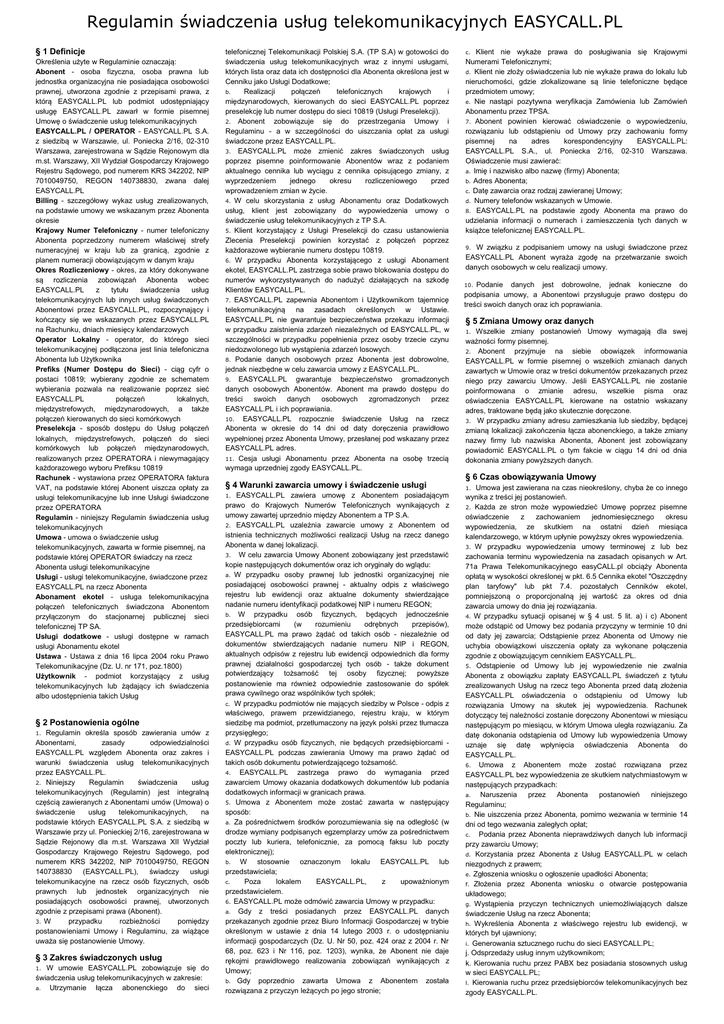 Regulamin świadczenia usług telekomunikacyjnych EASYCALL.PL § 1 Definicje Określenia użyte w Regulaminie oznaczają: Abonent - osoba fizyczna, osoba prawna lub jednostka organizacyjna nie posiadająca osobowości prawnej, utworzona zgodnie z przepisami prawa, z którą EASYCALL.PL lub podmiot udostępniający usługę EASYCALL.PL zawarł w formie pisemnej Umowę o świadczenie usług telekomunikacyjnych EASYCALL.PL / OPERATOR - EASYCALL.PL S.A. z siedzibą w Warszawie, ul. Poniecka 2/16, 02-310 Warszawa, zarejestrowana w Sądzie Rejonowym dla m.st. Warszawy, XII Wydział Gospodarczy Krajowego Rejestru Sądowego, pod numerem KRS 342202, NIP 7010049750, REGON 140738830, zwana dalej EASYCALL.PL Billing - szczegółowy wykaz usług zrealizowanych, na podstawie umowy we wskazanym przez Abonenta okresie Krajowy Numer Telefoniczny - numer telefoniczny Abonenta poprzedzony numerem właściwej strefy numeracyjnej w kraju lub za granicą, zgodnie z planem numeracji obowiązującym w danym kraju Okres Rozliczeniowy - okres, za który dokonywane są rozliczenia zobowiązań Abonenta wobec EASYCALL.PL z tytułu świadczenia usług telekomunikacyjnych lub innych usług świadczonych Abonentowi przez EASYCALL.PL, rozpoczynający i kończący się we wskazanych przez EASYCALL.PL na Rachunku, dniach miesięcy kalendarzowych Operator Lokalny - operator, do którego sieci telekomunikacyjnej podłączona jest linia telefoniczna Abonenta lub Użytkownika Prefiks (Numer Dostępu do Sieci) - ciąg cyfr o postaci 10819; wybierany zgodnie ze schematem wybierania pozwala na realizowanie poprzez sieć EASYCALL.PL połączeń lokalnych, międzystrefowych, międzynarodowych, a także połączeń kierowanych do sieci komórkowych Preselekcja - sposób dostępu do Usług połączeń lokalnych, międzystrefowych, połączeń do sieci komórkowych lub połączeń międzynarodowych, realizowanych przez OPERATORA i niewymagający każdorazowego wyboru Prefiksu 10819 Rachunek - wystawiona przez OPERATORA faktura VAT, na podstawie której Abonent uiszcza opłaty za usługi telekomunikacyjne lub inne Usługi świadczone przez OPERATORA Regulamin - niniejszy Regulamin świadczenia usług telekomunikacyjnych Umowa - umowa o świadczenie usług telekomunikacyjnych, zawarta w formie pisemnej, na podstawie której OPERATOR świadczy na rzecz Abonenta usługi telekomunikacyjne Usługi - usługi telekomunikacyjne, świadczone przez EASYCALL.PL na rzecz Abonenta Abonament ekotel - usługa telekomunikacyjna połączeń telefonicznych świadczona Abonentom przyłączonym do stacjonarnej publicznej sieci telefonicznej TP SA. Usługi dodatkowe - usługi dostępne w ramach usługi Abonamentu ekotel Ustawa - Ustawa z dnia 16 lipca 2004 roku Prawo Telekomunikacyjne (Dz. U. nr 171, poz.1800) Użytkownik - podmiot korzystający z usług telekomunikacyjnych lub żądający ich świadczenia albo udostępnienia takich Usług § 2 Postanowienia ogólne Regulamin określa sposób zawierania umów z Abonentami, zasady odpowiedzialności EASYCALL.PL względem Abonenta oraz zakres i warunki świadczenia usług telekomunikacyjnych przez EASYCALL.PL. 2. Niniejszy Regulamin świadczenia usług telekomunikacyjnych (Regulamin) jest integralną częścią zawieranych z Abonentami umów (Umowa) o świadczenie usług telekomunikacyjnych, na podstawie których EASYCALL.PL S.A. z siedzibą w Warszawie przy ul. Ponieckiej 2/16, zarejestrowana w Sądzie Rejonowy dla m.st. Warszawa XII Wydział Gospodarczy Krajowego Rejestru Sądowego, pod numerem KRS 342202, NIP 7010049750, REGON 140738830 (EASYCALL.PL), świadczy usługi telekomunikacyjne na rzecz osób fizycznych, osób prawnych lub jednostek organizacyjnych nie posiadających osobowości prawnej, utworzonych zgodnie z przepisami prawa (Abonent). 3. W przypadku rozbieżności pomiędzy postanowieniami Umowy i Regulaminu, za wiążące uważa się postanowienie Umowy. 1. § 3 Zakres świadczonych usług W umowie EASYCALL.PL zobowiązuje się do świadczenia usług telekomunikacyjnych w zakresie: a. Utrzymanie łącza abonenckiego do sieci 1. telefonicznej Telekomunikacji Polskiej S.A. (TP S.A) w gotowości do świadczenia usług telekomunikacyjnych wraz z innymi usługami, których lista oraz data ich dostępności dla Abonenta określona jest w Cenniku jako Usługi Dodatkowe; b. Realizacji połączeń telefonicznych krajowych i międzynarodowych, kierowanych do sieci EASYCALL.PL poprzez preselekcję lub numer dostępu do sieci 10819 (Usługi Preselekcji). 2. Abonent zobowiązuje się do przestrzegania Umowy i Regulaminu - a w szczególności do uiszczania opłat za usługi świadczone przez EASYCALL.PL. 3. EASYCALL.PL może zmienić zakres świadczonych usług poprzez pisemne poinformowanie Abonentów wraz z podaniem aktualnego cennika lub wyciągu z cennika opisującego zmiany, z wyprzedzeniem jednego okresu rozliczeniowego przed wprowadzeniem zmian w życie. 4. W celu skorzystania z usług Abonamentu oraz Dodatkowych usług, klient jest zobowiązany do wypowiedzenia umowy o świadczenie usług telekomunikacyjnych z TP S.A. 5. Klient korzystający z Usługi Preselekcji do czasu ustanowienia Zlecenia Preselekcji powinien korzystać z połączeń poprzez każdorazowe wybieranie numeru dostępu 10819. 6. W przypadku Abonenta korzystającego z usługi Abonament ekotel, EASYCALL.PL zastrzega sobie prawo blokowania dostępu do numerów wykorzystywanych do nadużyć działających na szkodę Klientów EASYCALL.PL. 7. EASYCALL.PL zapewnia Abonentom i Użytkownikom tajemnicę telekomunikacyjną na zasadach określonych w Ustawie. EASYCALL.PL nie gwarantuje bezpieczeństwa przekazu informacji w przypadku zaistnienia zdarzeń niezależnych od EASYCALL.PL, w szczególności w przypadku popełnienia przez osoby trzecie czynu niedozwolonego lub wystąpienia zdarzeń losowych. 8. Podanie danych osobowych przez Abonenta jest dobrowolne, jednak niezbędne w celu zawarcia umowy z EASYCALL.PL. 9. EASYCALL.PL gwarantuje be