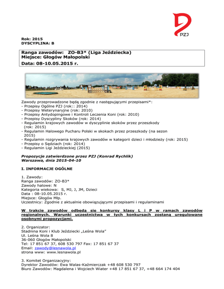 Rok: 2015 DYSCYPLINA: B Ranga zawodów: ZO-B3* (Liga Jeździecka) Miejsce: Głogów Małopolski Data: 08-10.05.2015 r. Zawody przeprowadzone będą zgodnie z następującymi przepisami*: - Przepisy Ogólne PZJ (rok:: 2014) - Przepisy Weterynaryjne (rok: 2010) - Przepisy Antydopingowe i Kontroli Leczenia Koni (rok: 2010) - Przepisy Dyscypliny Skoków (rok: 2014) - Regulamin krajowych zawodów w dyscyplinie skoków przez przeszkody (rok: 2015) - Regulamin Halowego Pucharu Polski w skokach przez przeszkody (na sezon 2015) - Regulamin rozgrywania krajowych zawodów w kategorii dzieci i młodzieży (rok: 2015) - Przepisy o Sędziach (rok: 2014) - Regulamin Ligi Jeździeckiej (2015) Propozycje zatwierdzone przez PZJ (Konrad Rychlik) Warszawa, dnia 2015-04-10 I. INFORMACJE OGÓLNE 1. Zawody: Ranga zawodów: ZO-B3* Zawody halowe: N Kategoria wiekowa: S, MJ, J, JM, Dzieci Data : 08-10.05.2015 r. Miejsce: Głogów Młp. Uczestnicy: Zgodnie z aktualnie obowiązującymi przepisami i regulaminami W trakcie zawodów odbędą się konkursy klasy L i P w ramach zawodów regionalnych. Warunki uczestnictwa w tych konkursach zostaną uregulowane osobnymi propozycjami. 2. Organizator: Stadnina Koni i Klub Jeździecki „Leśna Wola” Ul. Leśna Wola 8 36-060 Głogów Małopolski Tel: 17 851 67 37, 608 530 797 Fax: 17 851 67 37 Email: [email protected] strona www: www.lesnawola.pl 3. Komitet Organizacyjny: Dyrektor Zawodów: Ewa Walas-Kaźmierczak +48 608 530 797 Biuro Zawodów: Magdalena i Wojciech Wiater +48 17 851 67 37, +48 664 174 404 Rok: 2015 DYSCYPLINA: B Dyrektor Techniczny: Jarosław Żarów +48 600 397 592 Szef stajni: Tomasz Plewa +48 693 685 630 II. OSOBY OFICJALNE (zgodnie z Przepisami o Sędziach wyd. 6.5) 1. Komisja Sędziowska: Przewodniczący: Sylwia Morawiec-Kogut Sędzia PZJ: Krzysztof Koziarowski Sędziowie stylu: Krzysztof Koziarowski, Sławomir Pietrzak Członkowie: Sławomir Pietrzak, Magdalena Kryczka, Wojciech Wiater 2. Delegat Techniczny: Asystent Delegata Technicznego 3. Gospodarz Toru: Marc Debeare Asystent Gospodarza Toru: Krzysztof Koziarowski 4. Szef Komisarz: Łucja Śmietana Komisarze: Małgorzata Mastalerczyk 5. Delegat weterynaryjny PZJ: 6. Lekarz weterynarii zawodów: Waldemar Kalinowski 7. Spiker: III WARUNKI TECHNICZNE data godzina Otwarcie stajni 07.05.2015 10.00 Zebranie techniczne (przegląd dokumentów) 07.05.2015 17.00-20.00 Przegląd Weterynaryjny brak Plac konkursowy/hala: podłoże: piasek z włókniną wymiary: 90 x 65 Rozprężalnia: podłoże: piasek z włókniną wymiary: 30 x 65 Producent łyżek bezpieczeństwa (PZJ - Przepisy Dyscypliny B – Art. 210): Gala – W. Uchwat IV. WARUNKI UCZESTNICTWA 1.Uczestnictwo Zgodnie Przepisami Ogólnymi PZJ wyd. 5.1 oraz Regulaminem Dyscypliny Skoków wyd.10.9 2. Zgłoszenia: Termin zgłoszeń wstępnych: Termin zgłoszeń ostatecznych: 03.05.2015r. ZGŁOSZENIA JEDYNIE PRZEZ FORMULARZ ZGŁOSZENIOWY ONLINE ZAMIESZCZONY NA STRONIE www.lesnawola.pl/zawody W przypadku problemów technicznych prosimy o kontakt na adres: [email protected] Zgłoszenia są ważne tylko z dołączonym dowodem wpłaty na konto (250 PLN od konia) Rok: 2015 DYSCYPLINA: B Klub Jeździecki „Leśna Wola”, 36-060 Głogów Młp., ul. Leśna Wola 8 Nr konta: 31 9159 0000 2001 0005 5459 0001 W tytule przelewu proszę wpisać ZO maj i nazwisko zawodnika. Zgłoszenia bez opłaty są nieważne nie gwarantują przyjęcia koni na zawody. Opłaty nie podlegają zwrotowi po wycofaniu się konia po terminie zgłoszeń ostatecznych. 3. Warunki finansowe: Opłaty wpisowe Runda Diamentowa – 600,00 Runda Złota, Srebrna i Młode Konie – 480,00 Runda Brązowa (dzieci na kucach) – 300,00 Opłata za boks (za całe zawody): 250,00 Podłączenie samochodu do prądu – 150 PLN Opłata za program badań antydopingowych – 15 PLN Stajnie czynne będą od 07.05.2015 od godz. 10.00 Opłata za program badań antydopingowych 15 zł od konia Pasza i siano własne 4. Zakwaterowanie i wyżywienie: na koszt własny: - Motel na terenie Stadniny Koni „Leśna Wola” tel. 608 530 797, 17 851 67 37 - Hotel „Magnat” Głogów Młp., ul. Długa 21 tel. 17 851 78 54 - Hotel „Cztery Pory Roku” Rudna Mała 35, 36-060 Głogów Małopolski, tel. 17 779 91 21 - Hotel „Blue Diamond” Trzebownisko 36, 36-001 Trzebownisko, tel.17 772 26 66 5. Kary za brak dokumentów – według stawek PZJ. 6. Za reklamacje i odwołania obowiązuje kaucja w wys.: 300 PLN 7. Dokonanie zmiany w zapisach do konkursu (po wywieszeniu list startowych) za zgodą sędziego głównego: 8. Wymagana dokumentacja dla koni aktualne badania i szczepienia ochronne 9. Organizator nie ponosi odpowiedzialności za kradzieże, wypadki oraz inne szkody mogące mieć miejsce podczas zawodów i transportu V. ZAGADNIENIA WETERYNARYJNE Lp. Funkcja Imię i nazwisko telefon 1. Powiatowy lekarz wet. Maria Domiszewska 606940579 2. Delegat wet. PZJ 3. Lekarz wet. zawodów Jacek Kańka 604236349 Szczepienia ochronne przeciwko grypie koni. Obowiązuje następujący schemat szczepień: a. szczepienie podstawowe: pierwsze szczepienie – w dniu rozpoczęcia szczepień drugie szczepienie – nie wcześniej niż 21-go dnia i nie później niż 92 dnia od pierwszego szczepienia. b. szczepienie przypominające: co 6 miesięcy od ostatniego szczepienia (jest dopuszczalny 21 dniowy okres karencji); żadne szczepienie przypominające nie może się odbyć później niż na 7 dni przed przybyciem na zawody. Rok: 2015 DYSCYPLINA: B VI. NAGRODY (zgodnie z Regulaminem Dyscypliny Skoków wyd.10.9a, art. 5) PULA NAGRÓD – KONKURS NR 60 000,00 zł PULA I II III IV V VI VII VIII 25% X (IXGP) 1 – 115 RMK Nagrody za ogólną klasyfikacje 2 – 115 RMK 3 – 70 Kuce 500 Jako nagrody rzeczowe 4 – 120 Srebrna 1 500 400 300 200 170 120 90 70 50 100 5 – 130 Złota 3 100 750 630 480 360 300 240 150 50 100 6 – 140 Diamentowa 5 500 1400 1100 900 700 550 400 250 100 100 7 – 70 Brązowa 500 8 – 120 Srebrna 1 200 300 250 170 120 100 8