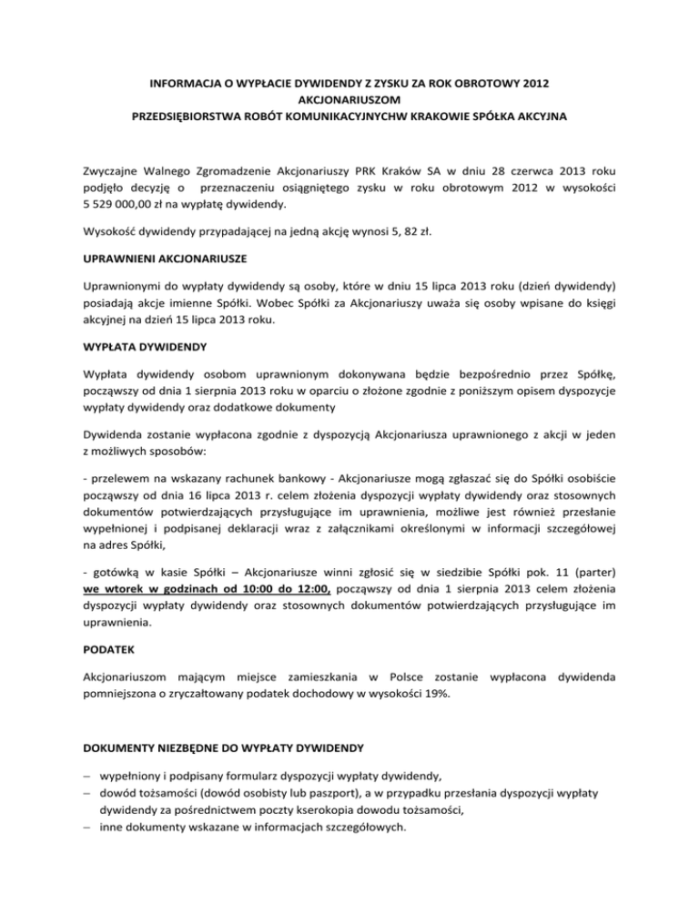 INFORMACJA O WYPŁACIE DYWIDENDY Z ZYSKU ZA ROK OBROTOWY 2012 AKCJONARIUSZOM PRZEDSIĘBIORSTWA ROBÓT KOMUNIKACYJNYCHW KRAKOWIE SPÓŁKA AKCYJNA Zwyczajne Walnego Zgromadzenie Akcjonariuszy PRK Kraków SA w dniu 28 czerwca 2013 roku podjęło decyzję o przeznaczeniu osiągniętego zysku w roku obrotowym 2012 w wysokości 5 529 000,00 zł na wypłatę dywidendy. Wysokość dywidendy przypadającej na jedną akcję wynosi 5, 82 zł. UPRAWNIENI AKCJONARIUSZE Uprawnionymi do wypłaty dywidendy są osoby, które w dniu 15 lipca 2013 roku (dzień dywidendy) posiadają akcje imienne Spółki. Wobec Spółki za Akcjonariuszy uważa się osoby wpisane do księgi akcyjnej na dzień 15 lipca 2013 roku. WYPŁATA DYWIDENDY Wypłata dywidendy osobom uprawnionym dokonywana będzie bezpośrednio przez Spółkę, począwszy od dnia 1 sierpnia 2013 roku w oparciu o złożone zgodnie z poniższym opisem dyspozycje wypłaty dywidendy oraz dodatkowe dokumenty Dywidenda zostanie wypłacona zgodnie z dyspozycją Akcjonariusza uprawnionego z akcji w jeden z możliwych sposobów: ‐ przelewem na wskazany rachunek bankowy ‐ Akcjonariusze mogą zgłaszać się do Spółki osobiście począwszy od dnia 16 lipca 2013 r. celem złożenia dyspozycji wypłaty dywidendy oraz stosownych dokumentów potwierdzających przysługujące im uprawnienia, możliwe jest również przesłanie wypełnionej i podpisanej deklaracji wraz z załącznikami określonymi w informacji szczegółowej na adres Spółki, ‐ gotówką w kasie Spółki – Akcjonariusze winni zgłosić się w siedzibie Spółki pok. 11 (parter) we wtorek w godzinach od 10:00 do 12:00, począwszy od dnia 1 sierpnia 2013 celem złożenia dyspozycji wypłaty dywidendy oraz stosownych dokumentów potwierdzających przysługujące im uprawnienia. PODATEK Akcjonariuszom mającym miejsce zamieszkania w Polsce zostanie wypłacona dywidenda pomniejszona o zryczałtowany podatek dochodowy w wysokości 19%. DOKUMENTY NIEZBĘDNE DO WYPŁATY DYWIDENDY wypełniony i podpisany formularz dyspozycji wypłaty dywidendy, dowód tożsamości (dowód osobisty lub paszport), a w przypadku przesłania dyspozycji wypłaty dywidendy za pośrednictwem poczty kserokopia dowodu tożsamości, inne dokumenty wskazane w informacjach szczegółowych. Formularze dyspozycji wypłaty dywidendy stanowią załączniki do niniejszej informacji. Informacja telefoniczna udzielana jest pod numerem telefonu (12) 294 71 63 we wtorki od godziny 10:00 do 12:00. INFORMACJE SZCZEGÓŁOWE Akcjonariusze uprawnieni z akcji imiennych składając dyspozycję wypłaty winni posiadać ze sobą dokument tożsamości, którym może być dowód osobisty lub paszport. W razie przesłania dyspozycji wypłaty pocztą należy załączyć do niej kserokopię dokumentu tożsamości. Osoby współuprawnione z akcji powinni złożyć dyspozycję na Formularzu DYSPOZYCJA WYPŁATY – WSPÓLNY PRZEDSTAWICIEL podpisaną przez ich wspólnego przedstawiciela wraz z załącznikami. Do dyspozycji należy dołączyć skierowane do Spółki pisemne zawiadomienie o wyborze wspólnego przedstawiciela podpisane przez wszystkich współuprawnionych. Dywidenda z akcji przysługujących osobom współuprawnionym jest wypłacana do rąk lub na rachunek wspólnego przedstawiciela. Wspólny przedstawiciel powinien posiadać ze sobą własny dokument tożsamości. Spadkobiercy Akcjonariuszy, do dokumentów opisanych w powyższym punkcie powinni załączyć akt zgonu Akcjonariusza oraz prawomocne postanowienie sądu o stwierdzeniu nabycia spadku lub akt notarialny poświadczenia dziedziczenia, jeżeli dotychczas nie były przedkładane Spółce. Wyznaczenie pełnomocnika ‐ Akcjonariusze mogą odebrać dywidendę przez pełnomocnika. W takiej sytuacji pełnomocnik winien przedłożyć Spółce, wraz z pozostałymi dokumentami, pełnomocnictwo udzielone w formie pisemnej wskazujące imię i nazwisko, adres zamieszkania, nr PESEL i nr dokumentu tożsamości mocodawcy i pełnomocnika. Tekst pełnomocnictwa udzielonego w języku obcym musi być przetłumaczony na język polski przez tłumacza przysięgłego. Do pełnomocnictwa powinna być załączona kserokopia dokumentu tożsamości mocodawcy. Pełnomocnik powinien posiadać ze sobą własny dokument tożsamości. PODATEK DOCHODOWY I DOKUMENTY DLA CELÓW PODATKOWYCH Akcjonariuszom, będącym osobami fizycznymi, mającymi miejsce zamieszkania w Polsce (polscy rezydenci), zostanie wypłacona dywidenda pomniejszona o zryczałtowany podatek dochodowy w wysokości 19%. Akcjonariusze będący osobami fizycznymi nie wykazują otrzymanej dywidendy oraz pobranego z tego tytułu podatku w zeznaniu o wysokości osiągniętego dochodu w roku podatkowym (PIT). W stosunku do Akcjonariuszy nie mających miejsca zamieszkania lub siedziby w Polsce (nierezydenci) jest możliwe zastosowanie innej stawki podatku dochodowego albo niepobranie podatku dochodowego, jeżeli wynika to z właściwej umowy o unikaniu podwójnego opodatkowania. Warunkiem powyższego jest udokumentowanie przez Akcjonariusza miejsca zamieszkania lub siedziby podatnika do celów podatkowych poprzez złożenie Spółce ‐ najpóźniej w dniu wypłaty dywidendy, certyfikatu rezydencji, wydanego przez właściwy organ administracji podatkowej przetłumaczonego na język polski przez tłumacza przysięgłego. W braku otrzymania w ww. terminie określonych wyżej oświadczeń i dokumentów, Akcjonariuszowi zostanie wypłacona dywidenda pomniejszona o zryczałtowany podatek dochodowy w wysokości 19%. PRZEDSIĘBIORSTWO ROBÓT KOMUNIKACYJNYCH W KRAKOWIE S.A. UL. KAZIMIERZA CZAPIŃSKIEGO 3 30‐048 KRAKÓW DYSPOZYCJA WYPŁATY DYWIDENDY Ja, niżej podpisany, Imię i nazwisko Akcjonariusza: _______________________________________________________________________ Adres zamieszkania: Kraj:______________________________Miejscowość:__________________________________ Kod pocztowy:__________ Ulica:________________________________________ Nr domu:______