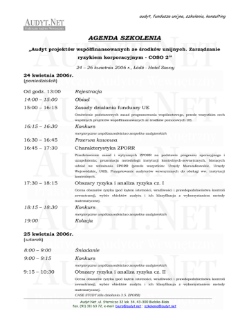 audyt, fundusze unijne, szkolenia, konsulting AGENDA SZKOLENIA „Audyt projektów współfinansowanych ze środków unijnych. Zarządzanie ryzykiem korporacyjnym - COSO 2” 24 – 26 kwietnia 2006 r., Łódź - Hotel Savoy 24 kwietnia 2006r. (poniedziałek) Od godz. 13:00 Rejestracja 14:00 – 15:00 Obiad 15:00 – 16:15 Zasady działania funduszy UE Omówienie podstawowych zasad programowania wspólnotowego, przede wszystkim cech wspólnych projektów współfinansowanych ze środków pomocowych UE. 16:15 – 16:30 Konkurs merytoryczne współzawodnictwo zespołów audytorskich 16:30 – 16:45 Przerwa kawowa 16:45 – 17:30 Charakterystyka ZPORR Przedstawienie zasad i wytycznych ZPORR na podstawie programu operacyjnego i uzupełnienia; prezentacja metodologii instytucji kontrolnych-zewnętrznych, biorących udział we wdraŜaniu ZPORR (przede wszystkim: Urzędy Marszałkowskie, Urzędy Wojewódzkie, UKS). Przygotowanie audytorów wewnętrznych do obsługi ww. instytucji kontrolnych. 17:30 – 18:15 Obszary ryzyka i analiza ryzyka cz. I Ocena obszarów ryzyka (pod kątem istotności, wraŜliwości i prawdopodobieństwa kontroli zewnętrznej), wybór obiektów audytu i ich klasyfikacja z wykorzystaniem metody matematycznej. 18:15 – 18:30 Konkurs merytoryczne współzawodnictwo zespołów audytorskich 19:00 Kolacja 25 kwietnia 2006r. (wtorek) 8:00 – 9:00 Śniadanie 9:00 – 9:15 Konkurs merytoryczne współzawodnictwo zespołów audytorskich 9:15 – 10:30 Obszary ryzyka i analiza ryzyka cz. II Ocena obszarów ryzyka (pod kątem istotności, wraŜliwości i prawdopodobieństwa kontroli zewnętrznej), wybór obiektów audytu i ich klasyfikacja z wykorzystaniem metody matematycznej. CASE STUDY (dla działania 3.5. ZPORR) Audyt.Net, ul. Sternicza 32 lok. 34, 43-300 Bielsko-Biała fax. (91) 311 63 72, e-mail: [email protected] ; [email protected] audyt, fundusze unijne, szkolenia, konsulting 10:30 – 10:45 Konkurs merytoryczne współzawodnictwo zespołów audytorskich 10:45 – 11:00 Przerwa kawowa 11:00 – 12:45 Testy audytowe cz. I Przedstawienie przykładowych testów, dostosowanych do przyjętych obiektów audytu: testy przeglądowe i zgodności oraz testy rzeczywiste, w tym badanie dokumentacji księgowej z wykorzystaniem statystycznego doboru próby (zgodnie z metodologią Europejskiego Trybunału Obrachunkowego dal metody MUS: poziom ufności: 95%, poziom istotności: 1%); ogółem 10-15 testów obejmujących pełny zakres realizacji projektu. CASE STUDY ZPORR 3.5. 12:45 – 13:00 Konkurs merytoryczne współzawodnictwo zespołów audytorskich 13:00 – 14:00 Obiad 14:00 – 16:00 Testy audytowe cz. II 16:00 – 16:30 Przerwa kawowa 16:30 – 17:30 Zarządzanie ryzykiem korporacyjnym – COSO 2 17:30 – 17:45 Konkurs merytoryczne współzawodnictwo zespołów audytorskich 18:00 Kolacja 26 kwietnia 2006r. (środa) 8:00 – 9:00 Śniadanie 9:00 – 10:30 Sporządzenie sprawozdania z audytu Prezentacja przykładowego sprawozdania z audytu, zwrócenie uwagi na najwaŜniejsze punkty sprawozdania oraz formę prezentacji danych (tak aby wyniki audytu były zrozumiałem i czytelne dla adresatów, w szczególności zewnętrznych kontrolerów i audytorów). Sprawozdanie zawiera wszystkie elementy wymagane rozporządzeniem MF. 10:30 – 11:00 Przerwa kawowa 11:30 Zakończenie (rozdanie zaświadczeń, rozstrzygnięcie konkursu i rozdanie nagród członkom zwycięskiego zespołu audytorów) Audyt.Net, ul. Sternicza 32 lok. 34, 43-300 Bielsko-Biała fax. (91) 311 63 72, e-mail: [email protected] ; [email protected]