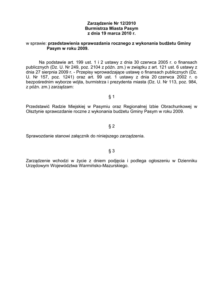 Zarządzenie Nr 12/2010 Burmistrza Miasta Pasym z dnia 19 marca 2010 r. w sprawie: przedstawienia sprawozdania rocznego z wykonania budżetu Gminy Pasym w roku 2009. Na podstawie art. 199 ust. 1 i 2 ustawy z dnia 30 czerwca 2005 r. o finansach publicznych (Dz. U. Nr 249, poz. 2104 z późn. zm.) w związku z art. 121 ust. 6 ustawy z dnia 27 sierpnia 2009 r. - Przepisy wprowadzające ustawę o finansach publicznych (Dz. U. Nr 157, poz. 1241) oraz art. 99 ust. 1 ustawy z dnia 20 czerwca 2002 r. o bezpośrednim wyborze wójta, burmistrza i prezydenta miasta (Dz. U. Nr 113, poz. 984, z późn. zm.) zarządzam: §1 Przedstawić Radzie Miejskiej w Pasymiu oraz Regionalnej Izbie Obrachunkowej w Olsztynie sprawozdanie roczne z wykonania budżetu Gminy Pasym w roku 2009. §2 Sprawozdanie stanowi załącznik do niniejszego zarządzenia. §3 Zarządzenie wchodzi w życie z dniem podjęcia i podlega ogłoszeniu w Dzienniku Urzędowym Województwa Warmińsko-Mazurskiego. załącznik do zarządzenia nr 12/2010 Burmistrza Miasta Pasym z dnia 19 marca 2010 r. SPRAWOZDANIE Z WYKONANIA BUDŻETU GMINY PASYM W 2009 ROKU Pasym, marzec 2010 r. SPRAWOZDANIE ROCZNE Z WYKONANIA BUDŻETU GMINY PASYM W ROKU 2009 Budżet Gminy Pasym na rok 2009 został uchwalony uchwałą Nr XXII/137/2008 Rady Miejskiej w Pasymiu z dnia 30 grudnia 2008 r. Przyjęto wówczas, że Gmina zrealizuje dochody w kwocie 25 127 463 zł, natomiast wydatki osiągną w 2009 r. poziom 29 847 402 zł. Deficyt budżetu, w kwocie 4 719 939 zł, planowano pokryć przychodami z zaciąganych kredytów. W trakcie roku budżetowego plan dochodów i wydatków ulegał zmianom i w dniu 31 grudnia 2009 r. planowane dochody wynosiły 20 270 309,26 zł, natomiast planowane wydatki - 23 594 372,26 zł. Planowany deficyt wynosił 3 324 063 zł, i miał być pokryty nadwyżką budżetów lat ubiegłych oraz zaciągniętym kredytem bankowym. Na dzień 31 grudnia 2009 r. budżet przewidywał realizację następujących przychodów: - zaciągnięcie kredytu w kwocie 5 723 692 zł na finansowanie planowanego deficytu budżetu Gminy Pasym oraz spłatę wcześniej zaciągniętych kredytów, - wolne środki pochodzące z budżetów lat ubiegłych, w kwocie 915 218,57 zł. Budżet przewidywał realizację w roku 2009 następujących rozchodów: - spłatę zaciągniętych kredytów - w kwocie 946 560 zł, oraz - utworzenie na koniec roku budżetowego lokaty w kwocie 2 368 287,57 zł. Zmian budżetu dokonano: a) uchwałami Rady Miejskiej: Nr XXIII/142/2009 z dnia 11 marca 2009 r., Nr XXIV/151/2009 z dnia 28 kwietnia 2009 r., Nr XXV/156/2009 z dnia 22 maja 2009 r., Nr XXVI/164/2009 z dnia 30 czerwca 2009 r., Nr XXVII/170/2009 z dnia 22 lipca 2009 r., Nr XXVIII/173/2009 z dnia 06 sierpnia 2009 r., Nr XXIX/175/2009 z dnia 22 września 2009 r., Nr XXX/179/2009 z dnia 16 listopada 2009 r., Nr XXXI/185/2009 z dnia 07 grudnia 2009 r., Nr XXXII/187/2009 z dnia 29 grudnia 2009 r., b) zarządzeniem Burmistrza Miasta: Nr 40/2009 z dnia 08 czerwca 2009 r., Nr 63/2009 z dnia 31 sierpnia 2009 r., Nr 82/2009 z dnia 30 października 2009 r., Uchwały te i zarządzenia podejmowano w związku z decyzjami różnych dysponentów środków budżetowych, zmieniającymi wysokość przyznanych Gminie Pasym dotacji, a także w związku z analizą realizowanych w trakcie roku budżetowego dochodów i wydatków. Ostatecznie w roku 2009 zrealizowano dochody w kwocie 16 089 927,11 zł (79,4 % planu), a wydatki w kwocie 17 966 0595,09 zł (76,1 % planowanych). Wskaźniki wykonania zarówno dochodów jak i wydatków, istotnie niższe od 100 % (wskaźnik upływu czasu) wynikają z faktu ujęcia w budżecie planowanych do pozyskania dużych kwot dotacji rozwojowych (4 233 109,45 zł środków pochodzących z Unii Europejskiej - po stronie dochodów), oraz ujętych w planie wydatków inwestycji planowanych do sfinansowania m.in. tymi dotacjami. Ujęcie tych dochodów i wydatków w budżecie jest konieczne w przypadku ubiegania się o środki pochodzące z budżetu Unii Europejskiej. Prowadzi to do dużego rozdźwięku między planem a wykonaniem budżetu na etapie przed- i w trakcie trwania procedur podziału środków unijnych, ale inny sposób postępowania zamykałby nam drogę do udziału w ww. konkursach o dofinansowanie inwestycji ze środków pochodzących z Unii Europejskiej. Jeśli zaś chodzi o poziom wykonania dochodów bez uwzględniania planowanych do pozyskania a nie uzyskanych środków z UE, to wyniósł on 96,3%. Z porównania kwot zrealizowanych w 2009 r. dochodów i wydatków wynika, że w roku tym osiągnięto deficyt budżetowy w kwocie 1 876 131,98 zł. W roku 2009 zaciągnięto kredyt długoterminowy w kwocie 2 600 000 zł na finansowanie deficytu budżetu i spłatę zaciągniętych wcześniej kredytów. Spłata rat kapitałowych zaciągniętych w latach ubiegłych kredytów pochłonęła 946 560 zł. Wolne środki roku 2009, liczone jako suma nadwyżki budżetowej i nadwyżki zaciągniętych kredytów nad spłaconymi ratami kredytowymi (rozliczeń z tytułu kredytów długoterminowych), nie wystąpiły. Pochodzące z roku 2008 i wcześniejszych, wolne środki wynosiły 915 218,57 zł. W roku 2009 ze środków tych wykorzystano (na spłatę rat zaciągniętych przez Gminę w latach wcześniejszych kredytów) kwotę 222 691,98 zł Zatem wolne środki lat poprzednich wyniosły na koniec 2009 r. 692 526,59 zł W roku 2009 Gmina Pasym otrzymała szereg dotacji, głównie na realizację zadań z zakresu administracji rządowej, zleconych Gminie ustawami, oraz zadań własnych Gminy, w kwocie ogółem 4 507 017,85 zł. Szczegółowo dotacje te zostały wymienione w tabeli nr 1. – – – Skutki obniżenia górnych stawek podatków w 2009 r. wyniosły 999 221,78 zł i dotyczyły: w kwocie 243 395,28 zł – podatku rolnego, w kwocie 715 015,98 zł – podatku od nieruchomości, w kwocie 40 810,52 zł - podatku od środków transportowych, Skutki udzielonych przez Gminę ulg, odroczeń (
