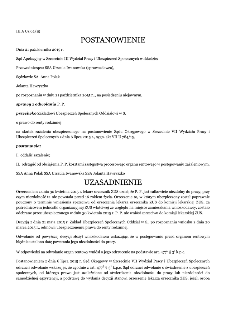 III A Uz 62/15 POSTANOWIENIE Dnia 21 października 2015 r. Sąd Apelacyjny w Szczecinie III Wydział Pracy i Ubezpieczeń Społecznych w składzie: Przewodnicząca: SSA Urszula Iwanowska (sprawozdawca), Sędziowie SA: Anna Polak Jolanta Hawryszko po rozpoznaniu w dniu 21 października 2015 r.., na posiedzeniu niejawnym, sprawy z odwołania P. P. przeciwko Zakładowi Ubezpieczeń Społecznych Oddziałowi w S. o prawo do renty rodzinnej na skutek zażalenia ubezpieczonego na postanowienie Sądu Okręgowego w Szczecinie VII Wydziału Pracy i Ubezpieczeń Społecznych z dnia 6 lipca 2015 r., sygn. akt VII U 784/15, postanawia: I. oddalić zażalenie; II. odstąpić od obciążenia P. P. kosztami zastępstwa procesowego organu rentowego w postępowaniu zażaleniowym. SSA Anna Polak SSA Urszula Iwanowska SSA Jolanta Hawryszko UZASADNIENIE Orzeczeniem z dnia 30 kwietnia 2015 r. lekarz orzecznik ZUS uznał, że P. P. jest całkowicie niezdolny do pracy, przy czym niezdolność ta nie powstała przed 16 rokiem życia. Orzeczenie to, w którym ubezpieczony został poprawnie pouczony o terminie wniesienia sprzeciwu od orzeczenia lekarza orzecznika ZUS do komisji lekarskiej ZUS, za pośrednictwem jednostki organizacyjnej ZUS właściwej ze względu na miejsce zamieszkania wnioskodawcy, zostało odebrane przez ubezpieczonego w dniu 30 kwietnia 2015 r. P. P. nie wniósł sprzeciwu do komisji lekarskiej ZUS. Decyzją z dnia 21 maja 2015 r. Zakład Ubezpieczeń Społecznych Oddział w S., po rozpoznaniu wniosku z dnia 20 marca 2015 r., odmówił ubezpieczonemu prawa do renty rodzinnej. Odwołanie od powyższej decyzji złożył wnioskodawca wskazując, że w postępowaniu przed organem rentowym błędnie ustalono datę powstania jego niezdolności do pracy. W odpowiedzi na odwołanie organ rentowy wniósł o jego odrzucenie na podstawie art. 4779 § 31 k.p.c. Postanowieniem z dnia 6 lipca 2015 r. Sąd Okręgowy w Szczecinie VII Wydział Pracy i Ubezpieczeń Społecznych odrzucił odwołanie wskazując, że zgodnie z art. 4779 § 31 k.p.c. Sąd odrzuci odwołanie o świadczenie z ubezpieczeń społecznych, od którego prawo jest uzależnione od stwierdzenia niezdolności do pracy lub niezdolności do samodzielnej egzystencji, a podstawę do wydania decyzji stanowi orzeczenie lekarza orzecznika ZUS, jeżeli osoba zainteresowana nie wniosła sprzeciwu od tego orzeczenia do komisji lekarskiej ZUS i odwołanie jest oparte wyłącznie na zarzutach dotyczących tego orzeczenia. Sąd pierwszej instancji podniósł, że w związku z tym, iż wnioskodawca mimo prawidłowego pouczenia nie złożył sprzeciwu od orzeczenia lekarza orzecznika ZUS, a odwołanie oparte jest na zarzucie dotyczącym tego orzeczenia, to postanowienie podległa odrzuceniu na podstawie art. 4779 § 31 k.p.c. Jednocześnie sąd pierwszej instancji pouczył P. P., że na podstawie art. 14 ust. 2c ustawy z dnia 17 grudnia 1998 r. o emeryturach i rentach z Funduszu Ubezpieczeń Społecznych, może wystąpić do Zakład Ubezpieczeń Społecznych z wnioskiem o przywrócenie terminu do wniesienia sprzeciwu, w tym w szczególności w razie odrzucenia przez sąd odwołania od decyzji w przypadku określonym w art. 4779 § 31 k.p.c. Z powyższym postanowieniem nie zgodził się P. P., który w złożonym zażaleniu wniósł o rozpoznanie sprawy o prawo do renty rodzinnej podnosząc, że zwrócił się do organu rentowego o przywrócenie terminu do złożenia sprzeciwu. Nadto skarżący podniósł, że w młodym wieku po pobiciu zaczął chorować na schizofrenię paranoidalną, często przebywa na oddziale psychiatrycznym i nie potrafi funkcjonować bez leków. W odpowiedzi na zażalenie Zakład Ubezpieczeń Społecznych wniósł o jego oddalenie oraz o zasądzenie kosztów zastępstwa procesowego według norm przepisanych wskazując, że zaskarżone orzeczenie jest prawidłowe. Sąd Apelacyjny rozważył, co następuje: Zażalenie nie zasługuje na uwzględnienie. W sprawie bezspornym jest, że P. P. wnosząc odwołanie od decyzji Zakładu Ubezpieczeń Społecznych Oddziału w S. z dnia 21 maja 2015 r. kwestionował jedynie ustalenie organu rentowego, że nie jest osobą całkowicie niezdolną do pracy przed 16 rokiem życia. Bezsporną jest także okoliczność, że ubezpieczony, któremu orzeczenie lekarza orzecznika ZUS zostało doręczone w dniu 30 kwietnia 2015 r. wraz z pouczeniem o prawie złożenia sprzeciwu do komisji lekarskiej ZUS, z takiego prawa nie skorzystał. Natomiast w orzeczeniu tym lekarz orzecznik ZUS nie stwierdził u wnioskodawcy powstanie całkowitej niezdolności do pracy przed 16 rokiem życia. W orzecznictwie Sądu Najwyższego i sądów powszechnych od lat utrwalony jest pogląd, którego wyrazem jest także wyrok Sądu Najwyższego z dnia 25 września 2014 r., I UK 40/14 (LEX nr 1545096), zgodnie z którym na podstawie art. 4779 § 31 k.p.c. sąd odrzuca odwołanie, w którym ubezpieczony podnosi wyłącznie zarzuty przeciwko orzeczeniu lekarza orzecznika ZUS w kwestiach określonych w art. 14 ust. 1 pkt 1-5 ustawy emerytalnej. Zaś w uchwale z dnia 15 marca 2006 r., II UZP 17/05 (OSNP 2006/15-16/245) Sąd Najwyższy stwierdził, że na podstawie art. 4779 § 31 k.p.c. sąd odrzuca odwołanie, w którym ubezpieczony podnosi wyłącznie zarzuty przeciwko orzeczeniu lekarza orzecznika ZUS w kwestiach określonych w art. 14 ust. 1 pkt 1-5 ustawy z dnia 17 grudnia 1998 r. o emeryturach i rentach z Funduszu Ubezpieczeń Społecznych (j. t. Dz. U. z 2013 r., poz. 1440 ze zm.). „Oparcie odwołania wyłącznie na zarzutach dotyczących orzeczenia lekarza orzecznika” dotyczy każdego takiego orzeczenia, a więc wszystkich kwestii ujętych w art. 14 wyżej wskazanej ustawy o emeryturach i rentach z Funduszu Ubezpieczeń Społecznych, tj. oceny niezdolności do pracy, jej stopnia oraz ustalenia daty powstania niezdolności do pracy, trwałości lub przewidywanego okresu niezdolności do pracy, związku przyczynowego niezdolno