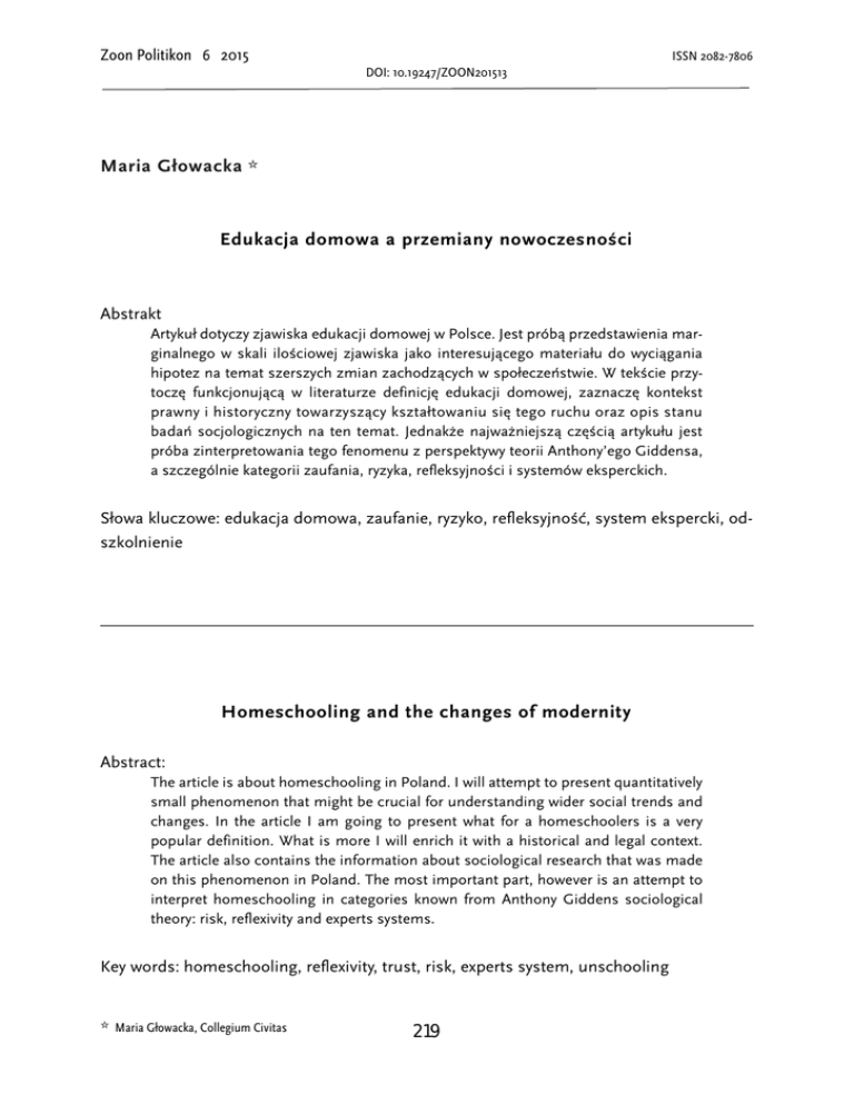 Zoon Politikon 6 2015 ISSN 2082-7806 DOI: 10.19247/ZOON201513 Maria Głowacka ✩ Edukacja domowa a przemiany nowoczesności Abstrakt Artykuł dotyczy zjawiska edukacji domowej w Polsce. Jest próbą przedstawienia marginalnego w skali ilościowej zjawiska jako interesującego materiału do wyciągania hipotez na temat szerszych zmian zachodzących w społeczeństwie. W tekście przytoczę funkcjonującą w literaturze definicję edukacji domowej, zaznaczę kontekst prawny i historyczny towarzyszący kształtowaniu się tego ruchu oraz opis stanu badań socjologicznych na ten temat. Jednakże najważniejszą częścią artykułu jest próba zinterpretowania tego fenomenu z perspektywy teorii Anthony’ego Giddensa, a szczególnie kategorii zaufania, ryzyka, refleksyjności i systemów eksperckich. Słowa kluczowe: edukacja domowa, zaufanie, ryzyko, refleksyjność, system ekspercki, odszkolnienie Homeschooling and the changes of modernity Abstract: The article is about homeschooling in Poland. I will attempt to present quantitatively small phenomenon that might be crucial for understanding wider social trends and changes. In the article I am going to present what for a homeschoolers is a very popular definition. What is more I will enrich it with a historical and legal context. The article also contains the information about sociological research that was made on this phenomenon in Poland. The most important part, however is an attempt to interpret homeschooling in categories known from Anthony Giddens sociological theory: risk, reflexivity and experts systems. Key words: homeschooling, reflexivity, trust, risk, experts system, unschooling ✩ Maria Głowacka, Collegium Civitas 219 Maria Głowacka Wprowadzenie W niniejszym artykule staram się przedstawić zjawisko edukacji domowej, które mimo ograniczonego zasięgu może wskazywać na pewne szersze zmiany społeczne zachodzące zarówno w podejściu do systemu oświaty czy procesu nauczania, jak też być symptomem pewnych przemian nowoczesności. Edukacja domowa rozwija się na obrzeżach powszechnego systemu i jest jednocześnie swoistą diagnozą niedostatków tego systemu Celem artykułu jest więc przybliżenie zjawiska, oraz umiejscowienie go na mapie socjologicznych trendów i pojęć. W artykule przedstawiam aktualny stan badań socjologicznych nad tym zagadnieniem w Polsce (na razie bardzo ubogi) i uzasadniam dlaczego, moim zdaniem, tego typu zjawisko warte jest dokładniejszego zgłębienia. W drugiej części artykułu swoją próbę interpretacji opieram na kategoriach, których Anthony Giddens używa do analizy przemian zachodzących w nowoczesnych świecie: zaufania, ryzyka, refleksyjności i systemów eksperckich. Definicje i konteksty Edukacja domowa to jedna z alternatywnych, wobec powszechnej edukacji szkolnej, form nauczania. Według definicji zaproponowanej przez jednego z czołowych przedstawicieli nurtu, profesora Marka Budajczaka, jest to: „bardzo dynamiczny w kilku krajach ruch społeczny, bazujący na niezależnych przedsięwzięciach pojedynczych rodzin, w których rodzice, powodowani troską o edukacyjny los własnych dzieci, przyjmują na siebie całkowitą odpowiedzialność za ich kształcenie, wychowanie i uspołecznienie, przejmując tę odpowiedzialność od państwa, jako zobligowanego przez prawo międzynarodowe i krajowe gwaranta praw do edukacji i strażnika obowiązku jej spełniania” (Budajczak 2004: 12). W Polsce edukacja domowa jest dopuszczalna prawnie od początku lat 90tych. Ze względu na niewielki zasięg zjawisko nie doczekało się jeszcze gruntownych naukowych badań, ani ilościowych ani jakościowych. Wielu rodzimych entuzjastów, praktyków i teoretyków nauczania domowego wypowiadających się publicznie na temat zjawiska odnosi się do wyników badań amerykańskich. W Stanach Zjednoczonych odsetek uczniów kształcących się 220 Edukacja domowa a przemiany nowoczesności domowo jest dość wysoki i wynosi ok. 3% wszystkich uczniów1 czyli ok. 1.5 miliona osób (National Household Education Surveys Program of 2012. Data File User’s Manual. Parent and Family Involvement in Education Survey. Early Childhood Program Participation Survey 2015). Polscy edukatorzy domowi sięgają jednak głównie do wyników badań, świadczących o lepszych wynikach uczniów kształconych w domu w ogólnonarodowych testach kompetencyjnych2. Amerykańskie badania niezmiennie pokazują, że dzieci uczone w domu osiągają w testach wyniki lepsze o 15-30% od dzieci uczonych w szkole. Dotyczy to wszystkich dziedzin nauczania – od przedmiotów ścisłych po humanistyczne (Ray 2008). Pozytywne wyniki badań dotyczą również rozwoju osobowego i socjalizacji dzieci uczonych przez rodziców – są one co najmniej równie dobrze rozwinięte jak uczniowie szkół publicznych i prywatnych (ibidem). W artykule nie ma niestety miejsca na gruntowne przyjrzenie się metodologii przytoczonych badań, a także na porównanie amerykańskiego systemu egzaminowania uczniów z metodami klasyfikowania w Polsce. Główny cel to zwrócenie uwagi, że brak porządnych badań na rodzimym gruncie sprawia, że wyniki badań amerykańskich są dla polskich entuzjastów edukacji domowej argumentem utwierdzającym ich w poczuciu słuszności własnych wyborów. Niezależnie więc od wszelkich możliwych zastrzeżeń co do prawomocności takich międzykulturowych porównań, dla edukatorów domowych badania amerykańskie są wartościowe i przekonujące. Funkcjonująca w środowisku już jako pozycja kultowa książka Marka Budajczaka pod tytułem Edukacja domowa zawiera również wyniki badań zza oceanu. Autor, choć podjął próbę przebadania polskich edukatorów domowych, sam przyznaje, że „niewielka część zaprezentowanych informacji to dane ilościowe, jak również, że badania jakościowe zakładane w projekcie badawczym3 zostały zrealizowane w ograniczonym zakresie” (Budajczak 2004: 15). 1 Uczniów ucząc