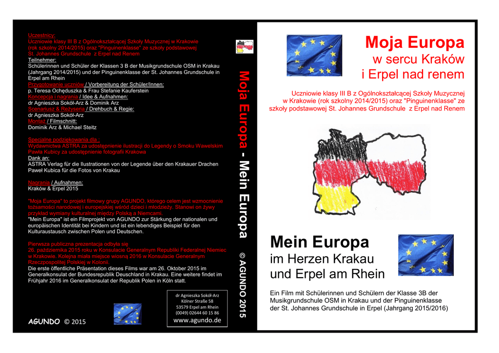 Specjalne podziękowania dla : Wydawnictwa ASTRA za udostępnienie ilustracji do Legendy o Smoku Wawelskim Pawła Kubicy za udostępnienie fotografii Krakowa Dank an: ASTRA Verlag für die Ilustrationen von der Legende über den Krakauer Drachen Paweł Kubica für die Fotos von Krakau Nagrania / Aufnahmen: Kraków & Erpel 2015 "Moja Europa" to projekt filmowy grupy AGUNDO, którego celem jest wzmocnienie tożsamości narodowej i europejskiej wśród dzieci i młodzieży. Stanowi on żywy przykład wymiany kulturalnej między Polską a Niemcami. "Mein Europa" ist ein Filmprojekt von AGUNDO zur Stärkung der nationalen und europäischen Identität bei Kindern und ist ein lebendiges Beispiel für den Kulturaustausch zwischen Polen und Deutschen. dr Agnieszka Sokół-Arz Kölner Straße 58 53579 Erpel am Rhein (0049) 02644 60 15 86 AGUNDO © 2015 www.agundo.de © AGUNDO 2015 Pierwsza publiczna prezentacja odbyła się 26. pażdziernika 2015 roku w Konsulacie Generalnym Republiki Federalnej Niemiec w Krakowie. Kolejna miała miejsce wiosną 2016 w Konsulacie Generalnym Rzeczpospolitej Polskiej w Kolonii. Die erste öffentliche Präsentation dieses Films war am 26. Oktober 2015 im Generalkonsulat der Bundesrepublik Deuschland in Krakau. Eine weitere findet im Frühjahr 2016 im Generalkonsulat der Republik Polen in Köln statt. Moja Europa Moja Europa - Mein Europa Uczestnicy: Uczniowie klasy III B z Ogólnokształcącej Szkoły Muzycznej w Krakowie (rok szkolny 2014/2015) oraz "Pinguinenklasse" ze szkoły podstawowej St. Johannes Grundschule z Erpel nad Renem Teilnehmer: Schülerinnen und Schüler der Klassen 3 B der Musikgrundschule OSM in Krakau (Jahrgang 2014/2015) und der Pinguinenklasse der St. Johannes Grundschule in Erpel am Rhein Przygotowanie uczniów / Vorbereitung der Schüler/Innen: p. Teresa Ochęduszka & Frau Stefanie Kauferstein Koncepcja i nagrania / Idee & Aufnahmen: dr Agnieszka Sokół-Arz & Dominik Arz Scenariusz & Reżyseria / Drehbuch & Regie: dr Agnieszka Sokół-Arz Montaż / Filmschnitt: Dominik Arz & Michael Steitz w sercu Kraków i Erpel nad renem Uczniowie klasy III B z Ogólnokształcącej Szkoły Muzycznej w Krakowie (rok szkolny 2014/2015) oraz "Pinguinenklasse" ze szkoły podstawowej St. Johannes Grundschule z Erpel nad Renem Mein Europa im Herzen Krakau und Erpel am Rhein Ein Film mit Schülerinnen und Schülern der Klasse 3B der Musikgrundschule OSM in Krakau und der Pinguinenklasse der St. Johannes Grundschule in Erpel (Jahrgang 2015/2016)