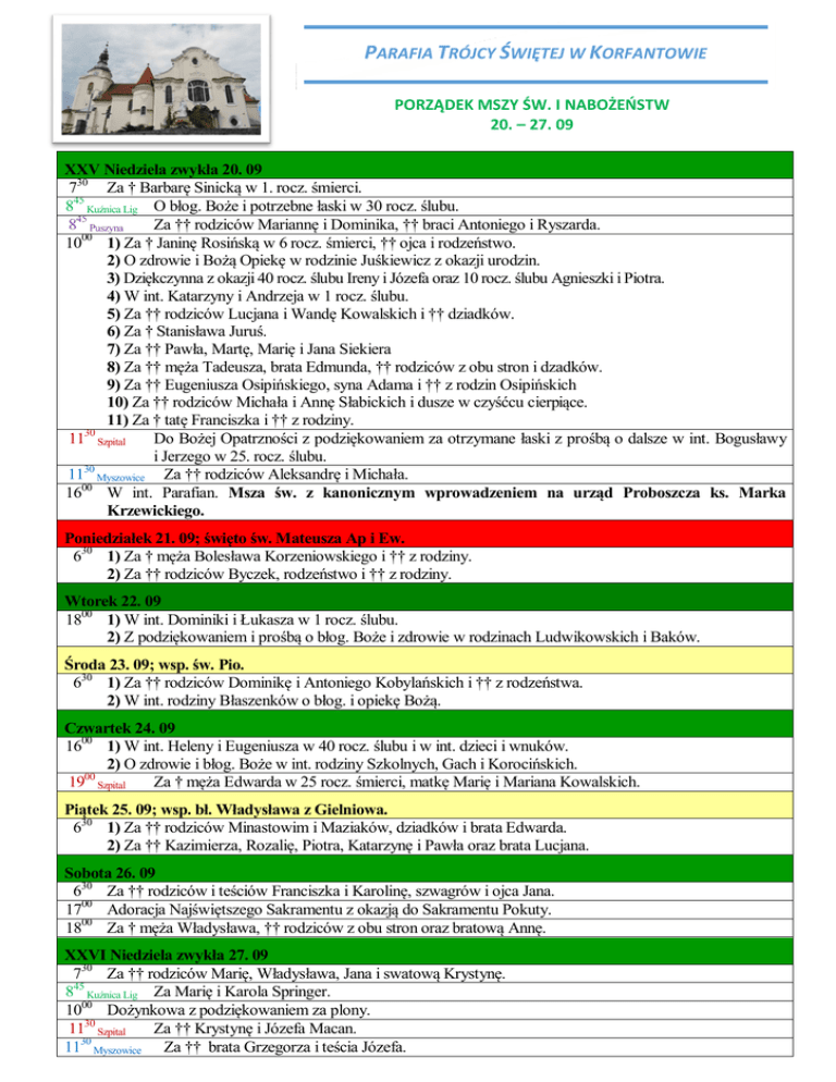 PARAFIA TRÓJCY ŚWIĘTEJ W KORFANTOWIE PORZĄDEK MSZY ŚW. I NABOŻEŃSTW 20. – 27. 09 XXV Niedziela zwykła 20. 09 730 Za † Barbarę Sinicką w 1. rocz. śmierci. 845 Kuźnica Lig O błog. Boże i potrzebne łaski w 30 rocz. ślubu. 845 Puszyna Za †† rodziców Mariannę i Dominika, †† braci Antoniego i Ryszarda. 00 10 1) Za † Janinę Rosińską w 6 rocz. śmierci, †† ojca i rodzeństwo. 2) O zdrowie i Bożą Opiekę w rodzinie Juśkiewicz z okazji urodzin. 3) Dziękczynna z okazji 40 rocz. ślubu Ireny i Józefa oraz 10 rocz. ślubu Agnieszki i Piotra. 4) W int. Katarzyny i Andrzeja w 1 rocz. ślubu. 5) Za †† rodziców Lucjana i Wandę Kowalskich i †† dziadków. 6) Za † Stanisława Juruś. 7) Za †† Pawła, Martę, Marię i Jana Siekiera 8) Za †† męża Tadeusza, brata Edmunda, †† rodziców z obu stron i dzadków. 9) Za †† Eugeniusza Osipińskiego, syna Adama i †† z rodzin Osipińskich 10) Za †† rodziców Michała i Annę Słabickich i dusze w czyśćcu cierpiące. 11) Za † tatę Franciszka i †† z rodziny. 30 11 Szpital Do Bożej Opatrzności z podziękowaniem za otrzymane łaski z prośbą o dalsze w int. Bogusławy i Jerzego w 25. rocz. ślubu. 30 11 Myszowice Za †† rodziców Aleksandrę i Michała. 1600 W int. Parafian. Msza św. z kanonicznym wprowadzeniem na urząd Proboszcza ks. Marka Krzewickiego. Poniedziałek 21. 09; święto św. Mateusza Ap i Ew. 630 1) Za † męża Bolesława Korzeniowskiego i †† z rodziny. 2) Za †† rodziców Byczek, rodzeństwo i †† z rodziny. Wtorek 22. 09 1800 1) W int. Dominiki i Łukasza w 1 rocz. ślubu. 2) Z podziękowaniem i prośbą o błog. Boże i zdrowie w rodzinach Ludwikowskich i Baków. Środa 23. 09; wsp. św. Pio. 630 1) Za †† rodziców Dominikę i Antoniego Kobylańskich i †† z rodzeństwa. 2) W int. rodziny Błaszenków o błog. i opiekę Bożą. Czwartek 24. 09 1600 1) W int. Heleny i Eugeniusza w 40 rocz. ślubu i w int. dzieci i wnuków. 2) O zdrowie i błog. Boże w int. rodziny Szkolnych, Gach i Korocińskich. 00 19 Szpital Za † męża Edwarda w 25 rocz. śmierci, matkę Marię i Mariana Kowalskich. Piątek 25. 09; wsp. bł. Władysława z Gielniowa. 630 1) Za †† rodziców Minastowim i Maziaków, dziadków i brata Edwarda. 2) Za †† Kazimierza, Rozalię, Piotra, Katarzynę i Pawła oraz brata Lucjana. Sobota 26. 09 630 Za †† rodziców i teściów Franciszka i Karolinę, szwagrów i ojca Jana. 1700 Adoracja Najświętszego Sakramentu z okazją do Sakramentu Pokuty. 1800 Za † męża Władysława, †† rodziców z obu stron oraz bratową Annę. XXVI Niedziela zwykła 27. 09 730 Za †† rodziców Marię, Władysława, Jana i swatową Krystynę. 845 Kuźnica Lig Za Marię i Karola Springer. 1000 Dożynkowa z podziękowaniem za plony. 1130 Szpital Za †† Krystynę i Józefa Macan. 1130 Myszowice Za †† brata Grzegorza i teścia Józefa. PARAFIA TRÓJCY ŚWIĘTEJ W KORFANTOWIE OGŁOSZENIA PARAFIALNE XXIV NIEDZIELA ZWYKŁA 20. 09 2015 1. Dziś 20 września, XXV niedziela zwykła. Na Górze św. Anny Diecezjalne Dożynki. W naszej Parafii o godz. 1600 Msza św. z kanonicznym wprowadzeniem na urząd Proboszcza ks. Marka Krzewickiego serdecznie zapraszamy do udziału w tej Mszy św. i w modlitwie w intencji ks. Proboszcza. 2. W poniedziałek 21. 09 święto św. Mateusza Apostoła i Ewangelisty. 3. We wtorek 22. 09 na wieczorną Msze św. (o godz. 1800) zapraszamy wszystkich kandydatów przygotowujących się do Bierzmowania, po Mszy św. spotkanie w kościele. 4. W czwartki o godz. 1600 Msza św. szkolna po niej spotkanie dla Marianek, w soboty o godz. 1000 spotkanie dla ministrantów. Marianki od piątku do niedzieli (25-27. 09) uczestniczyć będą w Diecezjalnej Pielgrzymce Dzieci Maryi na Górze św. Anny. 5. W niedzielę 27. 09 w naszej parafii odbędą się Parafialne Dożynki, które w tym roku przygotowują mieszkańcy Puszyny. Uroczysta Msza św. o godz. 1000, nie będzie w Puszynie Mszy św. o godz. 845. Nie będzie także popołudniowego nabożeństwa. Kolekta w tę niedzielę na budowę kościołów i jałmużna postna z całego roku. 6. Intencje na nowy rok będą przyjmowane od października.