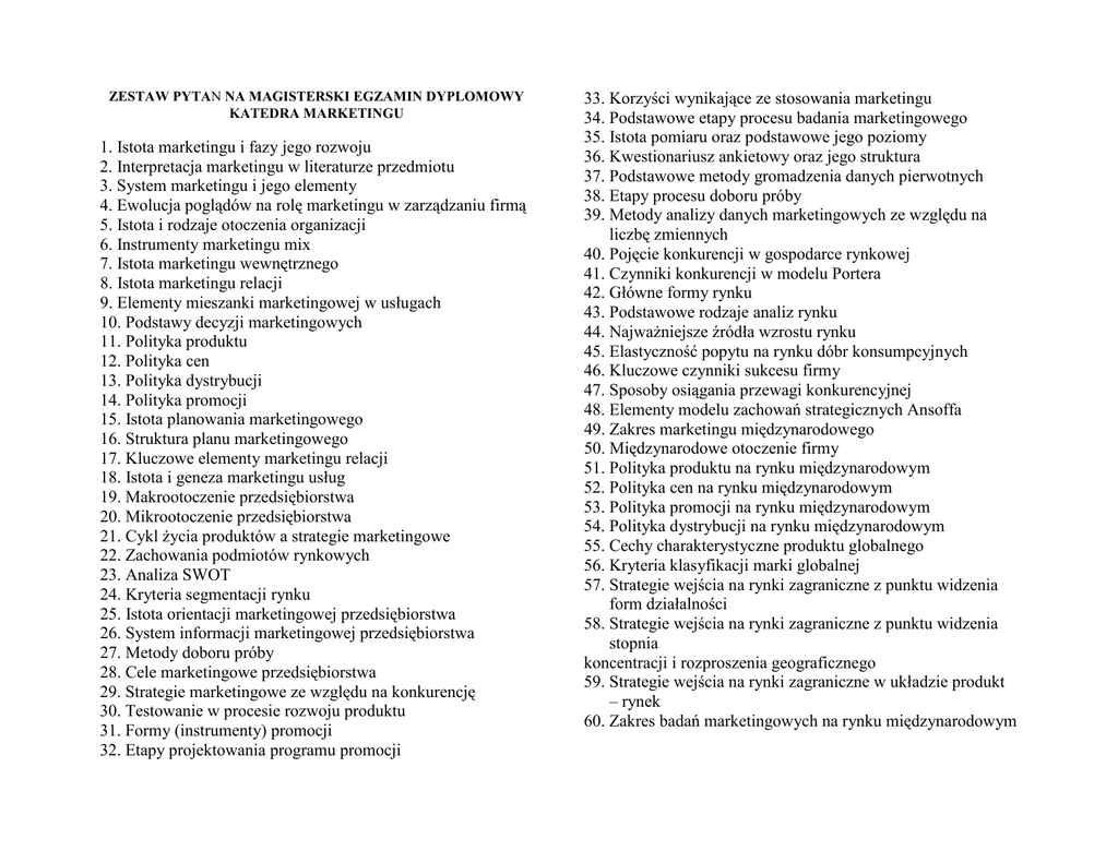 ZESTAW PYTAN NA MAGISTERSKI EGZAMIN DYPLOMOWY KATEDRA MARKETINGU 1. Istota marketingu i fazy jego rozwoju 2. Interpretacja marketingu w literaturze przedmiotu 3. System marketingu i jego elementy 4. Ewolucja poglądów na rolę marketingu w zarządzaniu firmą 5. Istota i rodzaje otoczenia organizacji 6. Instrumenty marketingu mix 7. Istota marketingu wewnętrznego 8. Istota marketingu relacji 9. Elementy mieszanki marketingowej w usługach 10. Podstawy decyzji marketingowych 11. Polityka produktu 12. Polityka cen 13. Polityka dystrybucji 14. Polityka promocji 15. Istota planowania marketingowego 16. Struktura planu marketingowego 17. Kluczowe elementy marketingu relacji 18. Istota i geneza marketingu usług 19. Makrootoczenie przedsiębiorstwa 20. Mikrootoczenie przedsiębiorstwa 21. Cykl Ŝycia produktów a strategie marketingowe 22. Zachowania podmiotów rynkowych 23. Analiza SWOT 24. Kryteria segmentacji rynku 25. Istota orientacji marketingowej przedsiębiorstwa 26. System informacji marketingowej przedsiębiorstwa 27. Metody doboru próby 28. Cele marketingowe przedsiębiorstwa 29. Strategie marketingowe ze względu na konkurencję 30. Testowanie w procesie rozwoju produktu 31. Formy (instrumenty) promocji 32. Etapy projektowania programu promocji 33. Korzyści wynikające ze stosowania marketingu 34. Podstawowe etapy procesu badania marketingowego 35. Istota pomiaru oraz podstawowe jego poziomy 36. Kwestionariusz ankietowy oraz jego struktura 37. Podstawowe metody gromadzenia danych pierwotnych 38. Etapy procesu doboru próby 39. Metody analizy danych marketingowych ze względu na liczbę zmiennych 40. Pojęcie konkurencji w gospodarce rynkowej 41. Czynniki konkurencji w modelu Portera 42. Główne formy rynku 43. Podstawowe rodzaje analiz rynku 44. NajwaŜniejsze źródła wzrostu rynku 45. Elastyczność popytu na rynku dóbr konsumpcyjnych 46. Kluczowe czynniki sukcesu firmy 47. Sposoby osiągania przewagi konkurencyjnej 48. Elementy modelu zachowań strategicznych Ansoffa 49. Zakres marketingu międzynarodowego 50. Międzynarodowe otoczenie firmy 51. Polityka produktu na rynku międzynarodowym 52. Polityka cen na rynku międzynarodowym 53. Polityka promocji na rynku międzynarodowym 54. Polityka dystrybucji na rynku międzynarodowym 55. Cechy charakterystyczne produktu globalnego 56. Kryteria klasyfikacji marki globalnej 57. Strategie wejścia na rynki zagraniczne z punktu widzenia form działalności 58. Strategie wejścia na rynki zagraniczne z punktu widzenia stopnia koncentracji i rozproszenia geograficznego 59. Strategie wejścia na rynki zagraniczne w układzie produkt – rynek 60. Zakres badań marketingowych na rynku międzynarodowym ZESTAW PYTAN NA INśYNIERSKI EGZAMIN DYPLOMOWY KATEDRA MARKETINGU 1. Określić na czym polega orientacja marketingowa przedsiębiorstwa 2. Scharakteryzować makrootoczenie marketingowe przedsiębiorstwa 3. Scharakteryzować otoczenie rynkowe (mikrootoczenie) przedsiębiorstwa 4. Omówić ogólny proces badania marketingowego 5. Przedstawić kryteria segmentacji rynku dóbr konsumpcyjnych 6. Scharakteryzować proces segmentacji rynku 7. Określić warunki efektywnej segmentacji rynku 8. Omówić proces podejmowania decyzji zakupu 9. Zdefiniować pojęcie udziału w rynku 10. Scharakteryzować cele marketingowe przedsiębiorstwa 11. Omówić strategie marketingowe ze względu na konkurencję 12. Wyjaśnić pojęcie kompozycji marketingowej (Marketing Mix) 13. Scharakteryzować poziomy produktu 14. Omówić rodzaje (strategie) nadawania marki 15. Scharakteryzować proces rozwoju nowego produktu 16. Wyjaśnić pojęcie cyklu Ŝycia produktu na rynku 17. Określić czynniki wpływające na cenę 18. Wyjaśnić róŜnicę między penetracją , ceną, a zbieraniem śmietanki 19. Scharakteryzować rabaty (opusty) cenowe 20. Scharakteryzować strumienie przepływające w kanale dystrybucji 21 Scharakteryzować typowe kanały dystrybucji dóbr konsumpcyjnych 22. Scharakteryzować typowe kanały dystrybucji produktów przemysłowych 23. Scharakteryzować dystrybucję fizyczną 24. Określić elementy procesu komunikacji marketingowej 25. Scharakteryzować główne formy (instrumenty) promocji 26. Omówić etapy projektowania programu promocji 27. Omówić metody ustalania budŜetu promocyjnego 28. Scharakteryzować strukturę słuŜb marketingowych zorientowaną funkcjonalnie 29. Scharakteryzować strukturę słuŜb marketingowych zorientowaną według produktów 30. Scharakteryzować strukturę słuŜb marketingowych zorientowaną rynkowo (według grup klientów)
