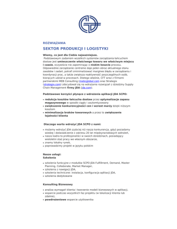 ROZWIĄZANIA SEKTOR PRODUKCJI I LOGISTYKI Wiemy, co jest dla Ciebie najważniejsze. Podstawowym zadaniem wszelkich systemów zarządzania łańcuchem dostaw jest umieszczenie właściwego towaru we właściwym miejscu i czasie, oczywiście nie zapominając o niskim koszcie procesu. Odpowiednie zarządzanie centralne daje pełen obraz aktualnego stanu zasobów i zadań, potrafi zminimalizować margines błędu w zarządzaniu i koordynacji prac, a także zwiększa reaktywność poszczególnych osób, biorących udział w procesach. Dlatego właśnie, CFT wraz z firmami partnerskimi MEB Consulting (mebcglobal.com oraz Strategix (strategix.com) zdecydował się na wdrażanie rozwiązań z dziedziny Supply Chain Management firmy JDA (jda.com). Podstawowe korzyści płynące z wdrożenia aplikacji JDA SCPO: ● ● ● redukcja kosztów łańcucha dostaw przez optymalizacje zapasu magazynowego w sposób ciągły i zautomtyzowany zwiększenie konkurencyjności cen i wzrost marży dzięki niższym kosztom minimalizacja braków towarowych a przez to zwiększenie lojalności klienta Dlaczego warto wdrożyć JDA SCPO z nami: ● ● ● ● możemy wdrożyć JDA szybciej niż nasza konkurencja, gdyż posiadamy wiedzę i doświadczenie z zakresu 20 lat międzynarodowych wdrożeń, nasza kadra to profesjonaliści w swoich dziedzinach, posiadający wieloletni staż pracy we własnym obszarze, znamy lokalny rynek, poprowadzimy projekt w języku polskim Nasze usługi: Szkolenia ● ● ● ● szkolenia funkcyjne z modułów SCPO JDA Fulfillment, Demand, Master Planning, Collaborate, Market Manager, szkolenia z nawigacji JDA, szkolenia techniczne: instalacja, konfiguracja aplikacji JDA, szkolenia dedykowane Konsulting Biznesowy ● ● ● analiza wymagań klienta i tworzenie modeli biznesowych w aplikacji, wsparcie podczas wszystkich faz projektu (w lokalizacji klienta lub zdalnie), powdrożeniowe wsparcie użytkownika ROZWIĄZANIA | SEKTOR PRODUKCJI I LOGISTYKI strona 2/2 Konsulting Techniczny ● ● ● ● ● ● tworzenie specyfikacji sprzętowej do wymagań klienta (server sizing), instalacje i podnoszenie wersji w lokalizacji klienta lub zdalnie, programowanie interfejsów i procesów, konfiguracja aplikacji JDA, optymalizacja procesów, Oracle DBA Wsparcie 24/7 ● ● ● monitoring procesów batchowych klienta, rozwiązywanie problemów technicznych i funkcyjnych, dostępność konsultantów 24 godziny na dobę 7 dni w tygodniu Europe - Poland Europe - Poland United States United States CFT Polska ul. Ryżowa 49 02-495 Warszawa Telefon: +48 22 379 75 00 [email protected] CFT Polska Ul. Andersa 5 15-124 Białystok Telefon: +48 22 379 75 00 [email protected] CFT Inc. 1556 S. Michigan Avenue Unit 3A Chicago, Illinois 60605 Telefon: +1.312.588.0006 Tel. kom.: +1.312.420.1016 [email protected] CFT Inc. 6820 Lyons Technologies Cir Coconut Creek, Florida 33073 Telefon: +1.312.588.0006 Phone: +1.312.420.1016 [email protected]