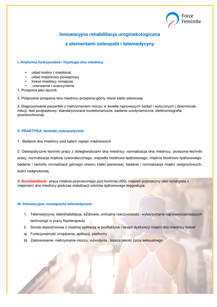 Innowacyjna rehabilitacja uroginekologiczna z elementami osteopatii i telemedycyny I. Anatomia funkcjonalna i fizjologia dna miednicy • układ kostny ( miednica) • układ mięśniowo-powięziowy • trzewi miednicy mniejszej • unerwienie i unaczynienie 1. Przepona jako łącznik 2. Połączenie przepona dna miednicy-przepona-górny otwór klatki piersiowej 3. Diagnozowanie pacjentek z nietrzymaniem moczu w świetle najnowszych badań i wytycznych ( dzienniczek mikcji, test podpaskowy, standaryzowane kwestionariusze, badanie urodynamiczne, elektromiografia powierzchowna) II. PRAKTYKA: techniki osteopatyczne 1. Badanie dna miednicy pod kątem napięć mięśniowych 2. Osteopatyczne techniki pracy z dolegliwościami dna miednicy: normalizacja dna miednicy, przepona-techniki pracy, normalizacja mięśnia czworobocznego, więzadła biodrowo-lędźwiowego, mięśnia biodrowo-lędźwiowego, badanie i techniki normalizacjI górnego otworu klatki piersiowej, badanie i normalizacja mięśni nadgnykowych, kości nadgnykowej, 3. Sonofeedback- praca mięśnia poprzecznego pod kontrolą USG, mięsień poprzeczny jako synergista z mięśniami dna miednicy podczas stabilizacji odcinka lędźwiowego kręgosłupa III. Innowacyjne rozwiązania telemedyczne: 1. Telemedycyna: telerehabilitacja, eZdrowie, wirtualna rzeczywistość- wykorzystanie najnowocześniejszych technologii w pracy fizjoterapeuty 2. Sonda dopochwowa z mobilną aplikacją w profilaktyce i terapii dysfunkcji mięśni dna miednicy kobiet a) Funkcjonalność urządzenia, aplikacji, platformy b) Zastosowanie: nietrzymanie moczu, vulvodynia , lepsza jakość życia seksualnego Instruktorzy: mgr Ewelina Tyszko-Bury & mgr Urszula Wójtowicz Termin: 04 czerwca 2016 r. od godziny 08:30-18:30 Miejsce: Warszawa, Golden Floor Plaza - Millenium Plaza nowoczesny ośrodek w ścisłym centrum Warszawy (800 metrów od dworca Warszawa Centralna) Organizator: Fundacja FORCE FEMINITE Innowacyjna kobiecość ! Cena kursu: 699 zł Zapewniamy całodzienny serwis: kawa, herbata, owoce, warzywa, ciastka. W przerwie lunchowej zapewniamy menu kontynentalne: tartinki, koreczki, mini Vol-au-vent’y , szaszłyki z pieczonym schabem i rukolą, świeże owoce. zaliczka 300zł - gwarancja rezerwacji miejsca. Zgłoszenia przyjmujemy pod @: [email protected] Wpłatę zaliczki w wysokości 300 zł prosimy dokonywać na poniższe dane: mBANK: 96 1140 2004 0000 3202 7575 1592 tytuł: Innowacyjna rehabilitacja Fundacja FORCE FEMINITE Ul. Bednarska 24/9 00-321 Warszawa