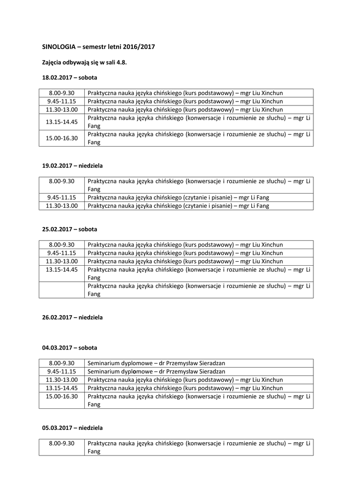 SINOLOGIA – semestr letni 2016/2017 Zajęcia odbywają się w sali 4.8. 18.02.2017 – sobota 8.00-9.30 9.45-11.15 11.30-13.00 13.15-14.45 15.00-16.30 Praktyczna nauka języka chińskiego (kurs podstawowy) – mgr Liu Xinchun Praktyczna nauka języka chińskiego (kurs podstawowy) – mgr Liu Xinchun Praktyczna nauka języka chińskiego (kurs podstawowy) – mgr Liu Xinchun Praktyczna nauka języka chińskiego (konwersacje i rozumienie ze słuchu) – mgr Li Fang Praktyczna nauka języka chińskiego (konwersacje i rozumienie ze słuchu) – mgr Li Fang 19.02.2017 – niedziela 8.00-9.30 9.45-11.15 11.30-13.00 Praktyczna nauka języka chińskiego (konwersacje i rozumienie ze słuchu) – mgr Li Fang Praktyczna nauka języka chińskiego (czytanie i pisanie) – mgr Li Fang Praktyczna nauka języka chińskiego (czytanie i pisanie) – mgr Li Fang 25.02.2017 – sobota 8.00-9.30 9.45-11.15 11.30-13.00 13.15-14.45 Praktyczna nauka języka chińskiego (kurs podstawowy) – mgr Liu Xinchun Praktyczna nauka języka chińskiego (kurs podstawowy) – mgr Liu Xinchun Praktyczna nauka języka chińskiego (kurs podstawowy) – mgr Liu Xinchun Praktyczna nauka języka chińskiego (konwersacje i rozumienie ze słuchu) – mgr Li Fang Praktyczna nauka języka chińskiego (konwersacje i rozumienie ze słuchu) – mgr Li Fang 26.02.2017 – niedziela 04.03.2017 – sobota 8.00-9.30 9.45-11.15 11.30-13.00 13.15-14.45 15.00-16.30 Seminarium dyplomowe – dr Przemysław Sieradzan Seminarium dyplomowe – dr Przemysław Sieradzan Praktyczna nauka języka chińskiego (kurs podstawowy) – mgr Liu Xinchun Praktyczna nauka języka chińskiego (kurs podstawowy) – mgr Liu Xinchun Praktyczna nauka języka chińskiego (konwersacje i rozumienie ze słuchu) – mgr Li Fang 05.03.2017 – niedziela 8.00-9.30 Praktyczna nauka języka chińskiego (konwersacje i rozumienie ze słuchu) – mgr Li Fang 9.45-11.15 11.30-13.00 Praktyczna nauka języka chińskiego (czytanie i pisanie) – mgr Li Fang Praktyczna nauka języka chińskiego (czytanie i pisanie) – mgr Li Fang 11.03.2017 – sobota 8.00-9.30 9.45-11.15 11.30-13.00 13.15-14.45 15.00-16.30 Praktyczna nauka języka chińskiego (kurs podstawowy) – mgr Liu Xinchun Praktyczna nauka języka chińskiego (kurs podstawowy) – mgr Liu Xinchun Praktyczna nauka języka chińskiego (kurs podstawowy) – mgr Liu Xinchun Praktyczna nauka języka chińskiego (konwersacje i rozumienie ze słuchu) – mgr Li Fang Praktyczna nauka języka chińskiego (konwersacje i rozumienie ze słuchu) – mgr Li Fang 12.03.2017 – niedziela 18.03.2017 – sobota 8.00-9.30 9.45-11.15 11.30-13.00 13.15-14.45 15.00-16.30 Praktyczna nauka języka chińskiego (kurs podstawowy) – mgr Liu Xinchun Praktyczna nauka języka chińskiego (kurs podstawowy) – mgr Liu Xinchun Praktyczna nauka języka chińskiego (kurs podstawowy) – mgr Liu Xinchun Praktyczna nauka języka chińskiego (konwersacje i rozumienie ze słuchu) – mgr Li Fang Praktyczna nauka języka chińskiego (konwersacje i rozumienie ze słuchu) – mgr Li Fang 19.03.2017 – niedziela 8.00-9.30 9.45-11.15 11.30-13.00 Praktyczna nauka języka chińskiego (konwersacje i rozumienie ze słuchu) – mgr Li Fang Praktyczna nauka języka chińskiego (czytanie i pisanie) – mgr Li Fang Praktyczna nauka języka chińskiego (czytanie i pisanie) – mgr Li Fang 25.03.2017 – sobota 8.00-9.30 9.45-11.15 11.30-13.00 13.15-14.45 15.00-16.30 Praktyczna nauka języka chińskiego (kurs podstawowy) – mgr Liu Xinchun Praktyczna nauka języka chińskiego (kurs podstawowy) – mgr Liu Xinchun Praktyczna nauka języka chińskiego (konwersacje i rozumienie ze słuchu) – mgr Li Fang Praktyczna nauka języka chińskiego (konwersacje i rozumienie ze słuchu) – mgr Li Fang Praktyczna nauka języka chińskiego (czytanie i pisanie) – mgr Li Fang 26.03.2017 – niedziela 01.04.2017 – sobota 8.00-9.30 9.45-11.15 11.30-13.00 13.15-14.45 15.00-16.30 Seminarium dyplomowe – dr Przemysław Sieradzan Seminarium dyplomowe – dr Przemysław Sieradzan Praktyczna nauka języka chińskiego (kurs podstawowy) – mgr Liu Xinchun Praktyczna nauka języka chińskiego (kurs podstawowy) – mgr Liu Xinchun Praktyczna nauka języka chińskiego (konwersacje i rozumienie ze słuchu) – mgr Li Fang 02.04.2017 – niedziela 8.00-9.30 9.45-11.15 11.30-13.00 Praktyczna nauka języka chińskiego (konwersacje i rozumienie ze słuchu) – mgr Li Fang Praktyczna nauka języka chińskiego (czytanie i pisanie) – mgr Li Fang Praktyczna nauka języka chińskiego (czytanie i pisanie) – mgr Li Fang 08.04.2017 – sobota 8.00-9.30 9.45-11.15 11.30-13.00 13.15-14.45 15.00-16.30 Praktyczna nauka języka chińskiego (kurs podstawowy) – mgr Liu Xinchun Praktyczna nauka języka chińskiego (kurs podstawowy) – mgr Liu Xinchun Praktyczna nauka języka chińskiego (konwersacje i rozumienie ze słuchu) – mgr Li Fang Praktyczna nauka języka chińskiego (konwersacje i rozumienie ze słuchu) – mgr Li Fang Praktyczna nauka języka chińskiego (czytanie i pisanie) – mgr Li Fang 22.04.2017 – sobota 8.00-9.30 9.45-11.15 11.30-13.00 13.15-14.45 15.00-16.30 Seminarium dyplomowe – dr Przemysław Sieradzan Seminarium dyplomowe – dr Przemysław Sieradzan Praktyczna nauka języka chińskiego (kurs podstawowy) – mgr Liu Xinchun Praktyczna nauka języka chińskiego (kurs podstawowy) – mgr Liu Xinchun Praktyczna nauka języka chińskiego (konwersacje i rozumienie ze słuchu) – mgr Li Fang 23.04.2017 – niedziela 8.00-9.30 9.45-11.15 11.30-13.00 Praktyczna nauka języka chińskiego (czytanie i pisanie) – mgr Li Fang Praktyczna nauka języka chińskiego (czytanie i pisanie) – mgr Li Fang Praktyczna nauka języka chińskiego (czytanie i pisanie) – mgr Li Fang 13.05.2017 – sobota 8.00-9.30 9.45-11.15 11.30-13.00 13.15-14.45 15.00-16.30 Seminarium dyplomowe – dr Przemysław Sieradzan Seminarium dyplomowe – dr Przemysław Sieradzan Praktyczna nauka języka chińskiego (kurs