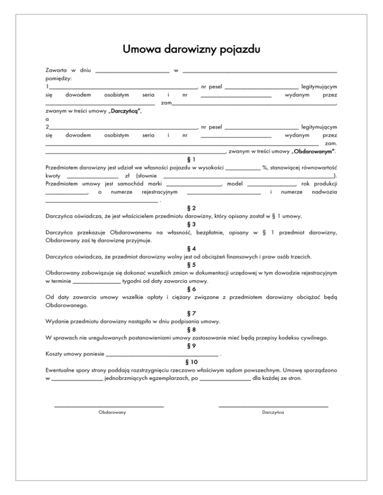 Umowa darowizny pojazdu Zawarta w dniu _______________________ w ________________________________________________ pomiędzy: 1______________________________________________, nr pesel _______________________ legitymującym się dowodem osobistym seria i nr ______________________ wydanym przez __________________________________ zam___________________________________________________, zwanym w treści umowy „Darczyńcą”, a 2______________________________________________, nr pesel _______________________ legitymującym się dowodem osobistym seria i nr ______________________ wydanym przez _____________________________________________________________________________________ zam. ________________________________________________________, zwanym w treści umowy „Obdarowanym”. §1 Przedmiotem darowizny jest udział we własności pojazdu w wysokości ___________ %, stanowiącej równowartość kwoty ________________ zł (słownie _____________________________________________________). Przedmiotem umowy jest samochód marki _________________, model _______________, rok produkcji _____________, o numerze rejestracyjnym _______________________ i numerze nadwozia ___________________________________ . §2 Darczyńca oświadcza, że jest właścicielem przedmiotu darowizny, który opisany został w § 1 umowy. §3 Darczyńca przekazuje Obdarowanemu na własność, bezpłatnie, opisany w § 1 przedmiot darowizny, Obdarowany zaś tę darowiznę przyjmuje. §4 Darczyńca oświadcza, że przedmiot darowizny wolny jest od obciążeń finansowych i praw osób trzecich. §5 Obdarowany zobowiązuje się dokonać wszelkich zmian w dokumentacji urzędowej w tym dowodzie rejestracyjnym w terminie _______________ tygodni od daty zawarcia umowy. §6 Od daty zawarcia umowy wszelkie opłaty i ciężary związane z przedmiotem darowizny obciążać będą Obdarowanego. §7 Wydanie przedmiotu darowizny nastąpiło w dniu podpisania umowy. §8 W sprawach nie uregulowanych postanowieniami umowy zastosowanie mieć będą przepisy kodeksu cywilnego. §9 Koszty umowy poniesie ___________________________________ . § 10 Ewentualne spory strony poddają rozstrzygnięciu rzeczowo właściwym sądom powszechnym. Umowę sporządzono w ________________ jednobrzmiących egzemplarzach, po ________________ dla każdej ze stron. _______________________________ Obdarowany _______________________________ Darczyńca