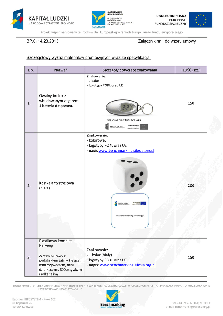 Projekt współfinansowany ze środków Unii Europejskiej w ramach Europejskiego Funduszu Społecznego Załącznik nr 1 do wzoru umowy BP.0114.23.2013 Szczegółowy wykaz materiałów promocyjnych wraz ze specyfikacją: L.p. Nazwa* Szczegóły dotyczące znakowania ILOŚĆ (szt.) Znakowanie: - 1 kolor - logotypy POKL oraz UE 1. Owalny brelok z wbudowanym zegarem. 1 bateria dołączona. 150 Znakowanie: - kolorowe, - logotypy POKL oraz UE - napis www.benchmarking.silesia.org.pl 2. Kostka antystresowa (biała) Plastikowy komplet biurowy 3. Zestaw biurowy z podajnikiem taśmy klejącej, mini zszywaczem, mini dziurkaczem, 300 zszywkami i rolką taśmy 200 Znakowanie: - 1 kolor (biały) - logotypy POKL oraz UE - napis: www.benchmarking.silesia.org.pl 150 Projekt współfinansowany ze środków Unii Europejskiej w ramach Europejskiego Funduszu Społecznego samoprzylepnej. Przezroczyste plastikowe pudełko. Zestaw biurowych klipsów 4. Zestaw biurowych klipsów "Manikin" z 5 klipsami z magnesem w różnych kolorach; pakowany w przeźroczyste pudełko. Linijka 5. Linijka LONG. Praktyczna, trwała linijka z wbudowaną lupą. Długość 40 cm. 2w1 Zakreślacz i długopis 6. 7. Znakowanie: - 1 kolor - logotypy POKL oraz UE - napis: www.benchmarking.silesia.org.pl (umieszczenie w 1 możliwym miejscu) 150 Znakowanie: - kolorowe - logotypy POKL oraz UE - napis: www.benchmarking.silesia.org.pl Znakowanie: - 1 kolor po jednej stronie - logotypy POKL oraz UE - napis: Benchmarking – po drugiej stronie Wymiary: 14,1 x 1 Długopis z korpusem wykonanym z kartonu, piszący na czarno. Dodatkowo posiada praktyczny, kolorowy zakreślacz. Zakładka do książki z zestawem karteczek samoprzylepnych w 6 150 150 Znakowanie: - kolorowe, - logotyp ŚZGiP, 150 Projekt współfinansowany ze środków Unii Europejskiej w ramach Europejskiego Funduszu Społecznego kolorach, nadrukowana linijka - logotypy POKL oraz UE kolor: naturalny wymiary: 6 x 21,7 x 0,3 cm Przybornik do szycia – szczotka 8. 9. Znakowanie: - 1 kolor - logotypy POKL oraz UE (w dowolnym miejscu) kolor: srebrny wymiary: 6.6 x 6.6 x 2.9 cm Składana szczotka do włosów z lusterkiem i ratunkowym zestawem do szycia Torba z paskiem na ramię oraz dodatkowo uchwyty do ręki, ozdobne szare paski z przodu. 200 Znakowanie: - logotypy w kolorze (POKL, ŚZGiP, UE) - napis (biały) www.benchmarking.silesia.org.pl - napis (biały) Projekt współfinansowany ze środków Unii Europejskiej w ramach Europejskiego Funduszu Społecznego 200 kolor: niebieski wymiary: 35,6x39,4 cm Materiał Poliester 600D Notesz długopisem 10. kolor: srebrny wymiary: 8x10,8x1,2 cm Znakowanie: - 1 kolor - PRZÓD ->napis: Benchmarking – szukamy najlepszych rozwiązań; www.benchmarking.silesia.org.pl - TYŁ -> logotypy POKL, ŚZGiP oraz UE 200 Projekt współfinansowany ze środków Unii Europejskiej w ramach Europejskiego Funduszu Społecznego - Brelok z latarką 11. Brelok metalowy z jasnym światłem LED, zawierający baterie kolor: srebrny wymiary: Ø 1,5x6,5 cm Zestaw karteczek i markerów 12. 13. Znakowanie: - 1 kolor - logotypy: POKL oraz UE 50 Znakowanie - 1 kolor - NA WIERZCHU – PRZÓD: ciąg logotypów oraz napis www.benchmarking.silesia.org.pl Kartonowe pudełko z 2 kolorowymi bloczkami kartek samoprzylepnych i 5 kolorowymi markerami. Dołączona przezroczysta linijka 12cm i kartonowy długopis z niebieskim wkładem. Magnetyczny klip do 50 Znakowanie 50 Projekt współfinansowany ze środków Unii Europejskiej w ramach Europejskiego Funduszu Społecznego notatek z ludzikami Pendrive 4GB 14. Flash chip: SAMSUNG Obudowa: plastik Kolor: dowolny USB 2.0 kompatybilne z USB 1.1 Kompatybilne z Win98/NT/ME/2000/XP/ Vista - 1 kolor - logotypy POKL i UE (na bocznym pasku) oraz napis BENCHMARKING (obok) Znakowanie: - 1 kolor - logotypy POKL oraz UE (tył) - logotyp ŚZGiP (przód) 50 Znakowanie - 1 kolor – grawer laserowy - napis: www.benchmarking.silesia.org.pl - ciąg logotypów – POKL, ŚZGiP, UE 15. 16. Kubek termiczny o pojemności 0,4 l, wykonany ze stali nierdzewnej. Zestaw upominkowy Komplet - uchwyt na 50 Znakowanie - 1 kolor 50 Projekt współfinansowany ze środków Unii Europejskiej w ramach Europejskiego Funduszu Społecznego torebkę, metalowy brelok i długopis kolor: czarny wymiary: 9,1x16,5x1,9 cm - na zewnętrznej pokrywie zestawu: ciąg logotypów: POKL, ŚZGiP, UE + napis: www.benchmarking.silesia.org.pl Znakowanie - 1 kolor - logotypy: POKL oraz UE 17. Mini radio FM z klipem kolor: biały wymiary: 3,7 x 5,5 x 1,6 cm 50 Znakowanie: - 1 kolor (biały na parasolu w kolorze niebieskim lub czarny na parasolu w kolorze szarym/srebrnym) 18. Parasol składany i rozkładany automatycznie, materiał: poliester wymiar: min. Ø96 x 54,5 cm kolor: niebieski lub szary/srebrny - napis: www.benchmarking.silesia.org.pl - logotypy POKL, ŚZGiP, UE - napis: Projekt współfinansowany ze środków Unii Europejskiej w ramach Europejskiego Funduszu Społecznego 50