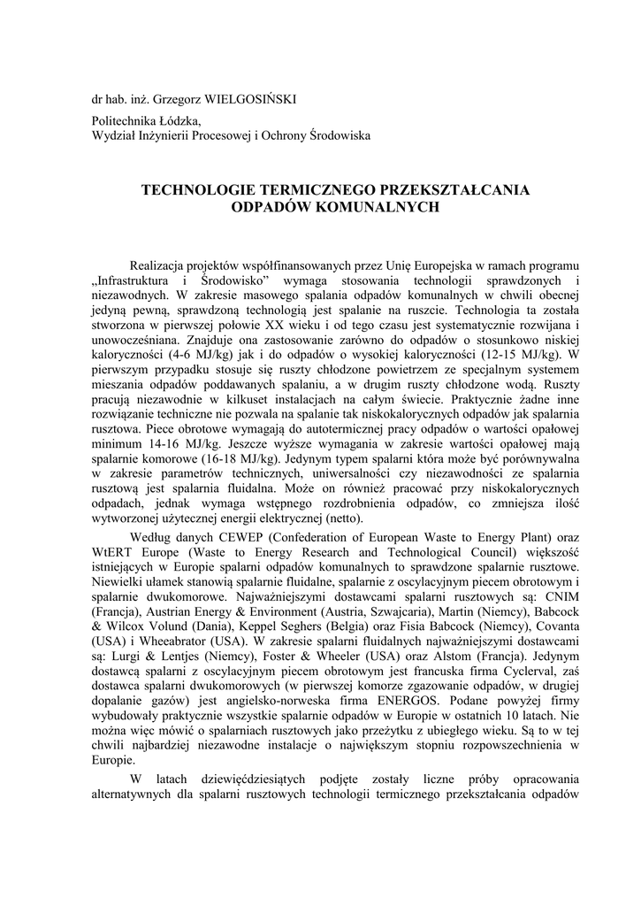 dr hab. inż. Grzegorz WIELGOSIŃSKI Politechnika Łódzka, Wydział Inżynierii Procesowej i Ochrony Środowiska TECHNOLOGIE TERMICZNEGO PRZEKSZTAŁCANIA ODPADÓW KOMUNALNYCH Realizacja projektów współfinansowanych przez Unię Europejska w ramach programu „Infrastruktura i Środowisko” wymaga stosowania technologii sprawdzonych i niezawodnych. W zakresie masowego spalania odpadów komunalnych w chwili obecnej jedyną pewną, sprawdzoną technologią jest spalanie na ruszcie. Technologia ta została stworzona w pierwszej połowie XX wieku i od tego czasu jest systematycznie rozwijana i unowocześniana. Znajduje ona zastosowanie zarówno do odpadów o stosunkowo niskiej kaloryczności (4-6 MJ/kg) jak i do odpadów o wysokiej kaloryczności (12-15 MJ/kg). W pierwszym przypadku stosuje się ruszty chłodzone powietrzem ze specjalnym systemem mieszania odpadów poddawanych spalaniu, a w drugim ruszty chłodzone wodą. Ruszty pracują niezawodnie w kilkuset instalacjach na całym świecie. Praktycznie żadne inne rozwiązanie techniczne nie pozwala na spalanie tak niskokalorycznych odpadów jak spalarnia rusztowa. Piece obrotowe wymagają do autotermicznej pracy odpadów o wartości opałowej minimum 14-16 MJ/kg. Jeszcze wyższe wymagania w zakresie wartości opałowej mają spalarnie komorowe (16-18 MJ/kg). Jedynym typem spalarni która może być porównywalna w zakresie parametrów technicznych, uniwersalności czy niezawodności ze spalarnia rusztową jest spalarnia fluidalna. Może on również pracować przy niskokalorycznych odpadach, jednak wymaga wstępnego rozdrobnienia odpadów, co zmniejsza ilość wytworzonej użytecznej energii elektrycznej (netto). Według danych CEWEP (Confederation of European Waste to Energy Plant) oraz WtERT Europe (Waste to Energy Research and Technological Council) większość istniejących w Europie spalarni odpadów komunalnych to sprawdzone spalarnie rusztowe. Niewielki ułamek stanowią spalarnie fluidalne, spalarnie z oscylacyjnym piecem obrotowym i spalarnie dwukomorowe. Najważniejszymi dostawcami spalarni rusztowych są: CNIM (Francja), Austrian Energy & Environment (Austria, Szwajcaria), Martin (Niemcy), Babcock & Wilcox Volund (Dania), Keppel Seghers (Belgia) oraz Fisia Babcock (Niemcy), Covanta (USA) i Wheeabrator (USA). W zakresie spalarni fluidalnych najważniejszymi dostawcami są: Lurgi & Lentjes (Niemcy), Foster & Wheeler (USA) oraz Alstom (Francja). Jedynym dostawcą spalarni z oscylacyjnym piecem obrotowym jest francuska firma Cyclerval, zaś dostawca spalarni dwukomorowych (w pierwszej komorze zgazowanie odpadów, w drugiej dopalanie gazów) jest angielsko-norweska firma ENERGOS. Podane powyżej firmy wybudowały praktycznie wszystkie spalarnie odpadów w Europie w ostatnich 10 latach. Nie można więc mówić o spalarniach rusztowych jako przeżytku z ubiegłego wieku. Są to w tej chwili najbardziej niezawodne instalacje o największym stopniu rozpowszechnienia w Europie. W latach dziewięćdziesiątych podjęte zostały liczne próby opracowania alternatywnych dla spalarni rusztowych technologii termicznego przekształcania odpadów -2- komunalnych. Najbardziej znanymi przykładami takich działań były technologie SchwelBrenn-Verfahren (opracowana w koncernie Simensa) oraz Thermoselect. Obie zrobiły spektakularną klapę na początku lat dwutysięcznych. Simens wybudował instalację w miejscowości Fürth koło Norymbergii o wydajności ok. 100 000 Mg/rok, która po czterech latach bezowocnych prób została ostatecznie zamknięta w 2001 roku przynosząc startę około 400 mln DM. Pełnotechniczna instalacja Thermoselect w Karlsruhe o wydajności ok. 225 000 Mg/rok została po 6 latach prób uruchomienia i osiągnięcia zakładanej wydajności w roku 2006 ostatecznie zamknięta przynosząc straty przekraczające 500 mln DM. Na takie eksperymenty Polski nie stać. Jedyną pracującą instalacją pirolityczną dla odpadów komunalnych jest instalacja w Burgau (Niemcy) wybudowana w 1987 roku. Na jej bazie wybudowano podobną instalację w Arras (Francja), która jednak w 2009 roku została zamknięta oraz w Hamm (Niemcy) o wydajności ok. 100 000 Mg roku, która zamknięto w czerwcu 2010 roku. Nie jest to więc technologia sprawdzona, niezawodna, godna polecenia. Innych technologii opartych o procesy zgazowania lub pirolizy, o wydajności powyżej 50 000 Mg/rok w chwili obecnej w Europie nie ma. Instalacji plazmowych przeznaczonych do termicznego przekształcania odpadów komunalnych jest w chwili obecnej na świecie 6. Dwie największe z nich (o wydajności ok. 45 000 Mg/rok) znajdują się Japonii. Kolejne instalacje o wydajności ok. 25 000 Mg/rok znajdują się w Kanadzie oraz z również w Japonii. Dwie instalacje badawcze o wydajnościach rzędu 1000 - 2000 Mg/rok znajdują się na Tajwanie oraz w Wielkiej Brytanii. Brytyjska firma planuje podobno budowę takiej instalacji w miejscowości Swindon o wydajności ok. 100 000 Mg/rok, ale prace jeszcze nie zostały rozpoczęte. Jednocześnie w tej samej Wielkiej Brytanii oddanego właśnie do użytku spalarnię Belvedere (niedaleko Londynu) - rusztową, o wydajności 585 000 Mg/rok. Kolejna o wydajności 840 000 Mg/rok (Manchester) jest w budowie. Jak więc widać ani zgazowanie, ani piroliza, ani tym bardziej plazma nie stanowią aktualnie żadnej konkurencji dla klasycznych instalacji rusztowych. W chwili obecnej niektóre z krajów Unii Europejskiej posiadają całkowicie zaspokojone potrzeby w zakresie funkcjonowania spalani odpadów komunalnych. Do takich krajów zaliczają się Niemcy (69 instalacji o łącznej wydajności ok. 19,5 mln Mg/rok), Holandia, Szwecja, Belgia i Dania. Trwa budowa spalarni w Hiszpanii, Finlandii, Francji, a przede wszystkim we Włoszech i Wielkiej Brytanii, gdzie opóźnienia w zakresie termicznych metod unieszkodliwiania odpadów komunalnych są największe. Kończy się budowa spalarni odpadów w Dublinie (Irlandia) o wydajności 600 000 M