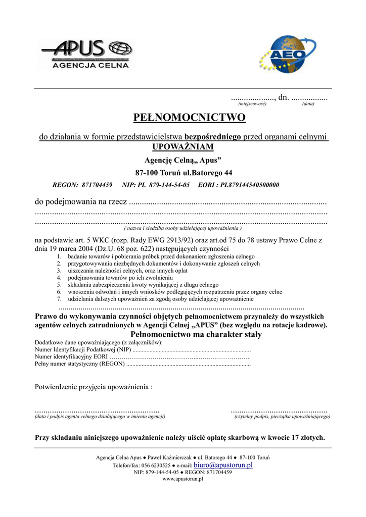 ...................., dn. ................. (miejscowość) (data) PEŁNOMOCNICTWO do działania w formie przedstawicielstwa bezpośredniego przed organami celnymi UPOWAŻNIAM Agencję Celną„ Apus” 87-100 Toruń ul.Batorego 44 REGON: 871704459 NIP: PL 879-144-54-05 EORI : PL879144540500000 do podejmowania na rzecz ............................................................................................ ........................................................................................................................................ ........................................................................................................................................ ( nazwa i siedziba osoby udzielającej upoważnienia ) na podstawie art. 5 WKC (rozp. Rady EWG 2913/92) oraz art.od 75 do 78 ustawy Prawo Celne z dnia 19 marca 2004 (Dz.U. 68 poz. 622) następujących czynności 1. 2. 3. 4. 5. 6. 7. badanie towarów i pobierania próbek przed dokonaniem zgłoszenia celnego przygotowywania niezbędnych dokumentów i dokonywanie zgłoszeń celnych uiszczania należności celnych, oraz innych opłat podejmowania towarów po ich zwolnieniu składania zabezpieczenia kwoty wynikającej z długu celnego wnoszenia odwołań i innych wniosków podlegających rozpatrzeniu przez organy celne udzielania dalszych upoważnień za zgodą osoby udzielającej upoważnienie ........................................................................................................................... Prawo do wykonywania czynności objętych pełnomocnictwem przynależy do wszystkich agentów celnych zatrudnionych w Agencji Celnej „APUS” (bez względu na rotacje kadrowe). Pełnomocnictwo ma charakter stały Dodatkowe dane upoważniającego (z załączników): Numer Identyfikacji Podatkowej (NIP) ............................................................................. Numer identyfikacyjny EORI ……………………………………..…………………….. Pełny numer statystyczny (REGON) ................................................................................. Potwierdzenie przyjęcia upoważnienia : .......................................................... (data i podpis agenta celnego działającego w imieniu agencji) ............................................. (czytelny podpis, pieczątka upoważniającego) Przy składaniu niniejszego upoważnienie należy uiścić opłatę skarbową w kwocie 17 złotych. Agencja Celna Apus ● Paweł Kaźmierczak ● ul. Batorego 44 ● 87-100 Toruń Telefon/fax: 056 6230525 ● e-mail: [email protected] NIP: 879-144-54-05 ● REGON: 871704459 www.apustorun.pl Załącznik nr 6 TORUē ............................................... (miejscowoĞü i data) Dyrektor Izby Celnej w TORUNIU Karta Rejestracji – PDR 1. WnioskujĊ o rejestracjĊ w Podsystemie Danych Referencyjnych (PDR) podmiotu: A1 B1 Nazwa firmy Adres firmy Adres e-mail Tel/fax EORI NIP REGON 2. InformujĊ, iĪ nastĊpujący reprezentanci zostali upowaĪnieni do przesyłania i/lub podpisywania w imieniu ww. podmiotu zgłoszeĔ i innych dokumentów celnych w postaci elektronicznych komunikatów do systemów CELINA / ECS / ICS 2): L.p. 1. ImiĊ i nazwisko PESEL (REGON (nazwa) i NIP) reprezentanta3 AGENCJA Reprezentanta3 REGON: CELNA APUS 871704459 87-100 TORUē NIP: UL.BATOREGO 879-144-54-05 44 2. 3. 4. 5. Zakres4 C/E/P Klucz5 + 3. Wraz z niniejszą Kartą przedkładam: Dokument rejestrowy podmiotu w postaci: .………………………………….…………………. UpowaĪnienia dla osób wskazanych w wykazie6 w iloĞci szt. .......…………………………………. …………………. Inne (np. OĞwiadczenia dotyczące Instrukcji, dokument ustanawiający pełnomocnika w kraju, urzĊdowe tłumaczenia przedkładanych dokumentów, jeĞli zostały sporządzone w jĊzyku obcym)............................................................................................................................................. 4. WskazujĊ pozycje ewidencji EORI/wykazu W05 (innej ewidencji) organu celnego:................................. ...................................................................................................................................................................... ..................................................... (czytelny podpis wnioskodawcy) 1 W przypadku rejestracji dla potrzeb systemów ECS i ICS podmiotu mającego siedzibĊ za granicą, wypełnia siĊ wyłącznie pola z tabeli A. W pozostałych przypadkach – wypełnieniu podlegają tabela A oraz B. 2 Niepotrzebne skreĞliü. 3 NazwĊ, REGON i NIP podaje siĊ w przypadku , gdy upowaĪnienie dotyczy profesjonalnego reprezentanta. NaleĪy przy tym mieü na wzglĊdzie, Īe w przypadku ICS dane tu wpisywane dotyczą tylko osób fizycznych. W zakresie systemów CELINA i ECS, gdy reprezentantem w rozumieniu art. 5 Wspólnotowego Kodeksu Celnego jest: - osoba fizyczna mająca miejsce zamieszkania za granicą naleĪy podaü inny numer identyfikacyjny, którym osoba posługuje siĊ w kraju zamieszkania, przy czym podawany numer identyfikacyjny powinien byü toĪsamy z numerem identyfikacyjnym podawanym dla potrzeb uzyskania login (tj. numerem podawanym we wniosku o nadanie numeru identyfikacyjnego w PDR ), - firma mająca siedzibĊ za granicą w miejscu przeznaczonym na NIP podaje siĊ VAT UE, a w przypadku jego braku inny numer przypisany firmie w kraju siedziby do celów identyfikacji podatkowe (numeru REGON siĊ nie podaje) 4 NaleĪy wskazaü, do jakich systemów reprezentant bĊdzie przesyłał zgłoszenia i inne dokumenty w postaci elektronicznych komunikatów. NaleĪy wykorzystaü nastĊpujące kody : „C” oznacza system CELINA, „E” oznacza system ECS, „P” oznacza system ICS, przy czym, jeĞli upowaĪnienie dotyczy wiĊcej niĪ jednego systemu, naleĪy zastosowaü stosowną kombinacjĊ kodów np. „C/E”, „C/E/P”) 5 Postawienie w „Karcie Rejestracji”, w kolumni