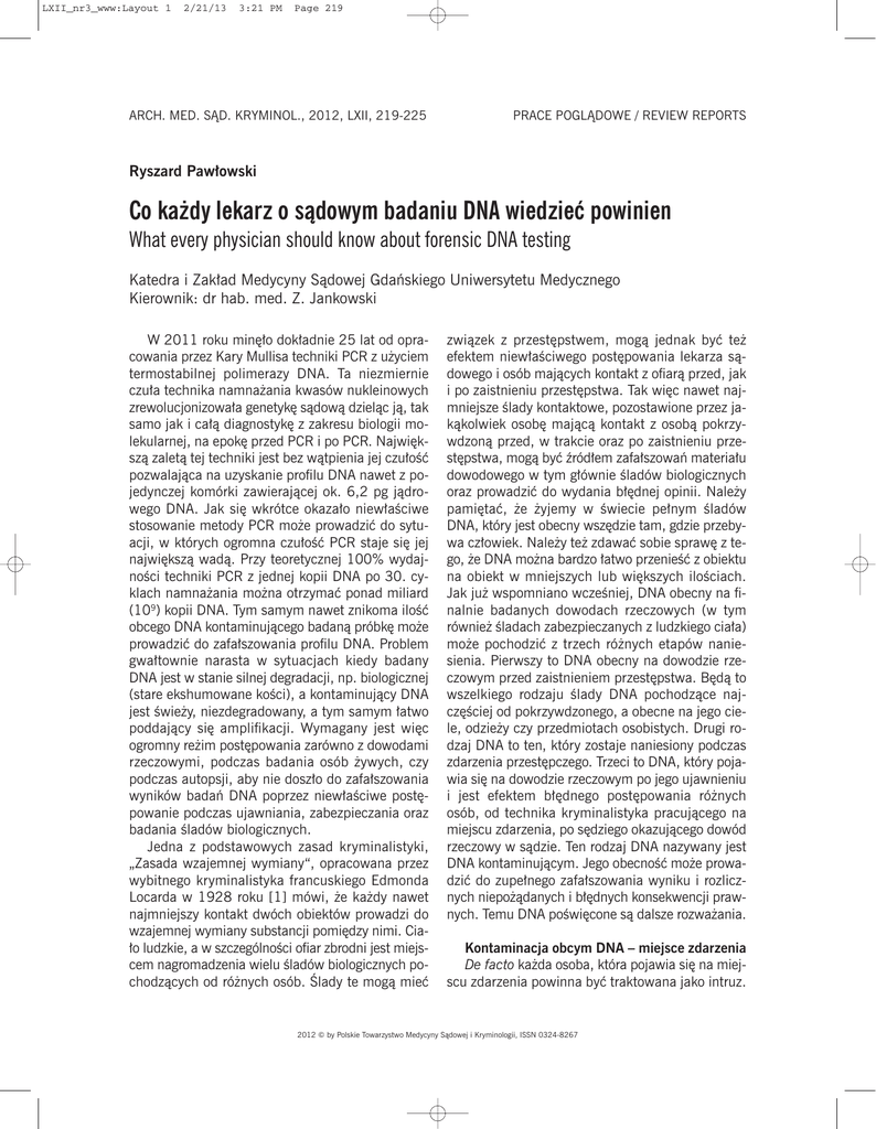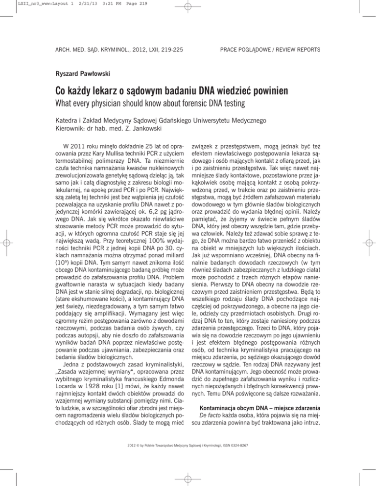 LXII_nr3_www:Layout 1 2/21/13 3:21 PM Page 219 ARCH. MED. SĄD. KRYMINOL., 2012, LXII, 219-225 PRACE POGLĄDOWE / REVIEW REPORTS Ryszard Pawłowski Co każdy lekarz o sądowym badaniu DNA wiedzieć powinien What every physician should know about forensic DNA testing Katedra i Zakład Medycyny Sądowej Gdańskiego Uniwersytetu Medycznego Kierownik: dr hab. med. Z. Jankowski W 2011 roku minęło dokładnie 25 lat od opracowania przez Kary Mullisa techniki PCR z użyciem termostabilnej polimerazy DNA. Ta niezmiernie czuła technika namnażania kwasów nukleinowych zrewolucjonizowała genetykę sądową dzieląc ją, tak samo jak i całą diagnostykę z zakresu biologii molekularnej, na epokę przed PCR i po PCR. Największą zaletą tej techniki jest bez wątpienia jej czułość pozwalająca na uzyskanie profilu DNA nawet z pojedynczej komórki zawierającej ok. 6,2 pg jądrowego DNA. Jak się wkrótce okazało niewłaściwe stosowanie metody PCR może prowadzić do sytuacji, w których ogromna czułość PCR staje się jej największą wadą. Przy teoretycznej 100% wydajności techniki PCR z jednej kopii DNA po 30. cyklach namnażania można otrzymać ponad miliard (109) kopii DNA. Tym samym nawet znikoma ilość obcego DNA kontaminującego badaną próbkę może prowadzić do zafałszowania profilu DNA. Problem gwałtownie narasta w sytuacjach kiedy badany DNA jest w stanie silnej degradacji, np. biologicznej (stare ekshumowane kości), a kontaminujący DNA jest świeży, niezdegradowany, a tym samym łatwo poddający się amplifikacji. Wymagany jest więc ogromny reżim postępowania zarówno z dowodami rzeczowymi, podczas badania osób żywych, czy podczas autopsji, aby nie doszło do zafałszowania wyników badań DNA poprzez niewłaściwe postępowanie podczas ujawniania, zabezpieczania oraz badania śladów biologicznych. Jedna z podstawowych zasad kryminalistyki, „Zasada wzajemnej wymiany“, opracowana przez wybitnego kryminalistyka francuskiego Edmonda Locarda w 1928 roku [1] mówi, że każdy nawet najmniejszy kontakt dwóch obiektów prowadzi do wzajemnej wymiany substancji pomiędzy nimi. Ciało ludzkie, a w szczególności ofiar zbrodni jest miejscem nagromadzenia wielu śladów biologicznych pochodzących od różnych osób. Ślady te mogą mieć związek z przestępstwem, mogą jednak być też efektem niewłaściwego postępowania lekarza sądowego i osób mających kontakt z ofiarą przed, jak i po zaistnieniu przestępstwa. Tak więc nawet najmniejsze ślady kontaktowe, pozostawione przez jakąkolwiek osobę mającą kontakt z osobą pokrzywdzoną przed, w trakcie oraz po zaistnieniu przestępstwa, mogą być źródłem zafałszowań materiału dowodowego w tym głównie śladów biologicznych oraz prowadzić do wydania błędnej opinii. Należy pamiętać, że żyjemy w świecie pełnym śladów DNA, który jest obecny wszędzie tam, gdzie przebywa człowiek. Należy też zdawać sobie sprawę z tego, że DNA można bardzo łatwo przenieść z obiektu na obiekt w mniejszych lub większych ilościach. Jak już wspomniano wcześniej, DNA obecny na finalnie badanych dowodach rzeczowych (w tym również śladach zabezpieczanych z ludzkiego ciała) może pochodzić z trzech różnych etapów naniesienia. Pierwszy to DNA obecny na dowodzie rzeczowym przed zaistnieniem przestępstwa. Będą to wszelkiego rodzaju ślady DNA pochodzące najczęściej od pokrzywdzonego, a obecne na jego ciele, odzieży czy przedmiotach osobistych. Drugi rodzaj DNA to ten, który zostaje naniesiony podczas zdarzenia przestępczego. Trzeci to DNA, który pojawia się na dowodzie rzeczowym po jego ujawnieniu i jest efektem błędnego postępowania różnych osób, od technika kryminalistyka pracującego na miejscu zdarzenia, po sędziego okazującego dowód rzeczowy w sądzie. Ten rodzaj DNA nazywany jest DNA kontaminującym. Jego obecność może prowadzić do zupełnego zafałszowania wyniku i rozlicznych niepożądanych i błędnych konsekwencji prawnych. Temu DNA poświęcone są dalsze rozważania. Kontaminacja obcym DNA – miejsce zdarzenia De facto każda osoba, która pojawia się na miejscu zdarzenia powinna być traktowana jako intruz. 2012 © by Polskie Towarzystwo Medycyny Sądowej i Kryminologii, ISSN 0324-8267 LXII_nr3_www:Layout 1 220 2/21/13 3:21 PM Page 220 Ryszard Pawłowski Oczywiście obecność prokuratora, techników kryminalistyków czy lekarza sądowego jest konieczna do przeprowadzenia wymaganych prawem czynności, jednak jak uczy życie nie zawsze są to tylko niezbędne osoby. Szeroko praktykowaną na zachodzie Europy zasadą jest poddanie profilowaniu DNA wszystkich osób przebywających na miejscu zdarzenia. Aby uniknąć lub drastycznie ograniczyć kontaminację obcym DNA, każda osoba tam obecna powinna być ubrana w jednorazowy kombinezon i rękawice oraz maski chroniące całe ciało przed pozostawieniem różnorakich śladów (najczęściej śliny, włosów, naskórka, wydzieliny z nosa itp.). O ile kombinezon może być używany przez cały czas pracy na miejscu zdarzenia bez zmiany, to jednorazowe rękawice winny być zmieniane po kontakcie z każdym nowym dowodem rzeczowym. Jak wykazano, właśnie rękawice oraz inny sprzęt używany podczas pobierania i badania dowodów rzeczowych może być poważnym źródłem zanieczyszczenia ich obcym DNA [2]. Dotknięcie jakiegokolwiek przedmiotu zanieczyszczoną rękawicą nanosi na ten przedmiot obcy DNA. Ślady te mogą być łatwo zauważalne, jak np. mokre jeszcze plamy krwi, czy zupełnie niewidoczne, jak np. ślady naskórka, śliny czy nabłonków na powierzchni ciała. Zgodnie z zasadą Locarda, stroje ochronne też mogą nagromadzać na sobie ślady znajdujące się na miejscu przestępstwa, dlatego też w niektórych krajach, jak np. w Wielkiej Brytanii praktykuje się zebranie i zabezpieczenie kombinezonów, rękawic, fartuchów i butów należących do policjantów i pierwszej pomocy medycznej, jako potencja