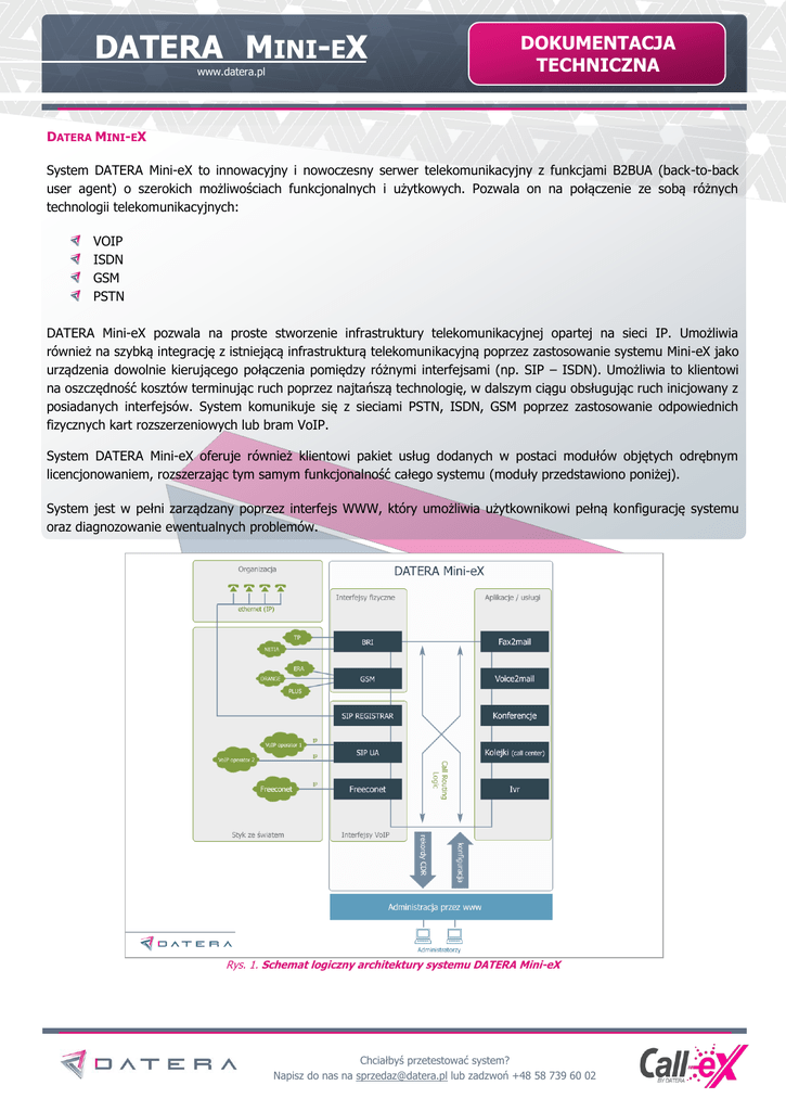 DATERA MINI-EX www.datera.pl DOKUMENTACJA TECHNICZNA DATERA MINI-EX System DATERA Mini-eX to innowacyjny i nowoczesny serwer telekomunikacyjny z funkcjami B2BUA (back-to-back user agent) o szerokich możliwościach funkcjonalnych i użytkowych. Pozwala on na połączenie ze sobą różnych technologii telekomunikacyjnych: VOIP ISDN GSM PSTN DATERA Mini-eX pozwala na proste stworzenie infrastruktury telekomunikacyjnej opartej na sieci IP. Umożliwia również na szybką integrację z istniejącą infrastrukturą telekomunikacyjną poprzez zastosowanie systemu Mini-eX jako urządzenia dowolnie kierującego połączenia pomiędzy różnymi interfejsami (np. SIP – ISDN). Umożliwia to klientowi na oszczędność kosztów terminując ruch poprzez najtańszą technologię, w dalszym ciągu obsługując ruch inicjowany z posiadanych interfejsów. System komunikuje się z sieciami PSTN, ISDN, GSM poprzez zastosowanie odpowiednich fizycznych kart rozszerzeniowych lub bram VoIP. System DATERA Mini-eX oferuje również klientowi pakiet usług dodanych w postaci modułów objętych odrębnym licencjonowaniem, rozszerzając tym samym funkcjonalność całego systemu (moduły przedstawiono poniżej). System jest w pełni zarządzany poprzez interfejs WWW, który umożliwia użytkownikowi pełną konfigurację systemu oraz diagnozowanie ewentualnych problemów. Rys. 1. Schemat logiczny architektury systemu DATERA Mini-eX Chciałbyś przetestować system? Napisz do nas na [email protected] lub zadzwoń +48 58 739 60 02 DATERA MINI-EX DOKUMENTACJA TECHNICZNA www.datera.pl WERSJE SYSTEMU DATERA MINI-EX System oferowany jest w trzech wersjach, przy czym wersje mogą być dostosowywane do potrzeb klienta, w zależności od jego wymagań: DATERA Mini-eX S DATERA Mini-eX M DATERA Mini-eX L Przedstawione systemy różnią się od siebie pojemnością systemu. Maksymalna liczba Maksymalna liczba Maksymalna liczba Rooms Maksymalna liczba Call Recorder DATERA MINI-EX S DATERA MINI-EX M DATERA MINI-EX M 20 20 30 30 40 40 15 15 15 20 30 40 użytkowników jednoczesnych połączeń* połączeń do usługi Conference połączeń przy wykorzystaniu usługi CECHY SYSTEMU DATERA MINI-EX Integracja systemu Mini-eX z centralami PBX via BRI DID call routing Wsparcie SIP Proxy Telephone Number Mapping (ENUM) Do not Disturb (wymagane wsparcie telefonów) Profil użytkownika (call permissions) DTMF (rfc2833, info, inband) Call routing pomiędzy systemami DATERA Mini-eX (oddziały firmy) Automatyczna konfiguracja i zarządzanie terminalami IP (wybranych producentów) Konfiguracja z wykorzystaniem szyfrowanego połączenia HTTPS SNMP Personalizacja panelu zarządzania (logo, biuletyn) Backup konfiguracji Możliwość włączania/wyłączania kolejnych kont oraz interfejsów Failover Route FUNKCJE SYSTEMU DATERA MINI-EX Account Code Attended Transfer Automatic Attendant Automatic Call Distribution Billings Call Blocking Call Forwarding Call Waiting Call Waiting Indication Calling ID Conference Rooms Contact List Extension Dialing FID Follow Me Forward on Busy/No Answer Hold IVR Least Cost Routing Music On Hold Night Answer No-Proxy Outgoing Only Queue Restricted extension Voice Messaging * dotyczy połączeń peer-peer przy wykorzystaniu tego samego kodeka mowy, przy połączeniach gdzie strumień głosowy jest transkodowany lub połączenia przychodzą do różnych usług (np. Conference Rooms) liczba ta może być mniejsza Chciałbyś przetestować system? Napisz do nas na [email protected] lub zadzwoń +48 58 739 60 02 DATERA MINI-EX www.datera.pl DOKUMENTACJA TECHNICZNA PANEL ADMINISTRACYJNY SYSTEMU DATERA MINI-EX System jest zarządzany poprzez interfejs WWW, który pozwala użytkownikowi na pełną konfigurację systemu wraz z usługami, w tym między innymi: Podgląd informacji na temat rejestracji (Stan terminala, adres IP terminala oraz kolejny czas rejestracji) Import/Eksport kont użytkowników do pliku CSV Podgląd raportów systemu, filtracja po grupach, kontach, interfejsach, datach, rezultatach, rodzajach połączeń Eksport raportów do plików CSV Dynamiczne filtrowanie użytkowników Kontakty systemu z opcja click to dial Przeglądanie historii płatności dla kont, zarządzanie zasileniami, obciążeniami i abonamentami (moduł Call Rating) Podgląd logów systemu (logi modułu sterującego połączeniami, logi provisioningu terminali) MODUŁY SYSTEMU DATERA MINI-EX (W STANDARDZIE) CALL PICKUP – moduł umożliwiający definiowanie grup odbierających, umożliwiających użytkownikom odbieranie (przechwytywanie) rozmów przychodzących na innych terminalach. INTERACTIVE VOICE RESPONSE (IVR) – moduł umożliwiający użytkownikowi stworzenie dowolnego i rozbudowanego drzewa IVR bez żadnych ograniczeń. W skład IVR wchodzą następujące funkcje: Menu – standardowa funkcja IVR Powitanie – umożliwia wdzwonienie się na wybrany numer wewnętrzny Przełącznik – sterownie połączeniem w zależności od czasu oraz numeru A i B Zapowiedź – odtworzenie wybranego komunikatu przed połączeniem z użytkownikiem Znajdź mnie – umożliwia „szukanie” użytkownika, przełączając rozmowy na kolejne terminale, aż rozmowa zostanie odebrana Każda funkcja IVR zawiera obsługę błędów pozwalającą na zdefiniowanie kolejnej akcji w przypadku nieodebrania/błędu/zajętości danego użytkownika. MUSIC ON HOLD (MOH) – moduł odgrywania zdefiniowanych przez użytkownika melodii w trakcie oczekiwania na połączenie. Moduł pozwala na wczytywanie plików dźwiękowych w formatach WAVE oraz MP3, po wczytaniu pliki są konwertowane do pliku WAVE (16 kbps 8000 Hz mono). CALL RATING – moduł umożliwiający prowadzanie zawansowanych metod naliczania kosztów połączeń oraz zarządzanie opłatami. Moduł Call Rating udostępnia funkcję monitorowania stanu konta oraz operacji na kontach użytkowników. Moduł pozwala na: Definiowanie grup – pozwala to na ustalanie osobnych stawek dla każdego z użytk