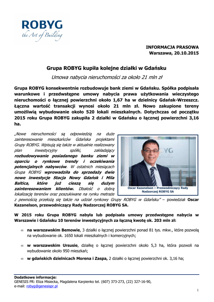 INFORMACJA PRASOWA Warszawa, 20.10.2015 Grupa ROBYG kupiła kolejne działki w Gdańsku Umowa nabycia nieruchomości za około 21 mln zł Grupa ROBYG konsekwentnie rozbudowuje bank ziemi w Gdańsku. Spółka podpisała warunkowe i przedwstępne umowy nabycia prawa uŜytkowania wieczystego nieruchomości o łącznej powierzchni około 1,67 ha w dzielnicy Gdańsk-Wrzeszcz. Łączna wartość transakcji wynosi około 21 mln zł. Nowo zakupione tereny umoŜliwią wybudowanie około 520 lokali mieszkalnych. Dotychczas od początku 2015 roku Grupa ROBYG zakupiła 2 działki w Gdańsku o łącznej powierzchni 3,16 ha. „Nowe nieruchomości są odpowiedzią na duŜe zainteresowanie mieszkańców Gdańska projektami Grupy ROBYG. Wpisują się takŜe w aktualnie realizowany plan inwestycyjny spółki, zakładający rozbudowywanie posiadanego banku ziemi w oparciu o rynkowe trendy i oczekiwania potencjalnych nabywców. W ostatnich miesiącach Grupa ROBYG wprowadziła do sprzedaŜy dwie nowe inwestycje Stacja Nowy Gdańsk i Mila Baltica, które juŜ cieszą się duŜym Oscar Kazanelson – Przewodniczący Rady zainteresowaniem klientów. Dbałość o dobrą Nadzorczej ROBYG SA lokalizację terenów oraz poszukiwane na rynku metraŜe z pewnością przełoŜą się takŜe na udział rynkowy Grupy ROBYG w Gdańsku” – powiedział Oscar Kazanelson, przewodniczący Rady Nadzorczej ROBYG SA. W 2015 roku Grupa ROBYG nabyła lub podpisała umowy przedwstępne nabycia w Warszawie i Gdańsku 10 terenów inwestycyjnych za łączną kwotę ok. 203 mln zł: • na warszawskim Bemowie, 3 działki o łącznej powierzchni ponad 81 tys. mkw., które pozwolą na wybudowanie ok. 1650 lokali mieszkalnych i komercyjnych; • w warszawskim Ursusie, działkę o łącznej powierzchni około 5,3 ha, która pozwoli na wybudowanie około 950 mieszkań; • w gdańskich dzielnicach Morena i Zaspa, 2 działki o łącznej powierzchni ok. 3,16 ha; Dodatkowe informacje: GENESIS PR: Eliza Misiecka, Magdalena Karpienko tel. (607) 373-273, (22) 327-16-90, e-mail: [email protected] 1 • w gdańskiej dzielnicy Wrzeszcz, 3 warunkowe umowy nabycia działek o łącznej powierzchni ok. 1,67 ha; • w warszawskim Wilanowie, działkę o łącznej powierzchni około 50 tys. mkw., która pozwoli na wybudowanie około 700 lokali. „Spółka niezmiennie utrzymuje wysoką płynność finansową i dobrą kontrolę długu. Realizacja dotychczasowych kierunków działalności przekłada się na wysoki poziom świadczonych usług i przyczyniła się do osiągnięcia poziomu kontraktacji w wysokości 1769 lokali i liczby 1278 przekazań mieszkań od początku 2015 roku. Ponadto zgodnie z przyjętą strategią Grupa ROBYG stawia sobie za cel osiągnięcie poziomu ponad 4000 przekazań w latach 2015 i 2016, a takŜe sprzedaŜ lokali w ilości ok. 2200 w roku 2015 oraz ok. 2500 w roku kolejnym” – dodał Oscar Kazanelson, przewodniczący Rady Nadzorczej ROBYG SA. W trzecim kwartale 2015 Grupa ROBYG przekazała nabywcom ok. 730 lokali w Warszawie i Gdańsku. Narastająco po trzech kwartałach 2015 roku spółka przekazała 1278 lokali, co daje wzrost rok do roku o niemal 30%. Spółka odnotowała równieŜ rekordową kwartalną kontraktację na poziomie 638 lokali netto (po uwzględnieniu rezygnacji) w Gdańsku i Warszawie w Q3 2015. Oznacza to wzrost o ponad 24% wobec analogicznego okresu 2014 roku. Kontraktacja spółki od początku roku wynosi 1769 lokali – co przybliŜa ją do realizacji planu, który zakłada sprzedaŜ 2200 lokali w całym 2015 roku. Grupa ROBYG osiągnęła w I półroczu 2015 roku przychody w wysokości 141 mln zł. W tym okresie poziom kontraktacji spółki wyniósł 1131 lokali (po uwzględnieniu rezygnacji), co oznacza ok. 7% wzrost w stosunku do analogicznego okresu w 2014 roku. Zysk netto spółki za pierwsze półrocze 2015 wyniósł 18 mln zł, natomiast ekonomiczny zysk netto Grupy ROBYG – 24 mln zł. W I półroczu 2015 roku spółka odnotowała równieŜ wzrost marŜy zysku netto, która wyniosła 13% – w I półroczu 2014 wynosiła 9%. Od debiutu na Giełdzie Papierów Wartościowych w Warszawie w 2010 roku ROBYG SA regularnie dzieli się zyskiem z akcjonariuszami. Dotychczas spółka wypłaciła w ramach dywidendy: • • • • • z zysku za 2010 rok w wysokości 0,07 zł na akcję, co stanowiło 27 % zysku ekonomicznego netto z zysku za 2011 rok w wysokości 0,12 zł na akcję, co stanowiło ponad 78% zysku ekonomicznego netto z zysku za 2012 rok w wysokości 0,08 zł na akcję, co stanowiło niemal 31% zysku ekonomicznego netto z zysku za 2013 rok w wysokości 0,08 zł na akcję, co stanowiło około 30% zysku ekonomicznego netto z zysku za 2014 w wysokości 0,11 zł na akcję, co stanowiło około 37% zysku ekonomicznego netto Więcej informacji www.robyg.pl Dodatkowe informacje: GENESIS PR: Eliza Misiecka, Magdalena Karpienko tel. (607) 373-273, (22) 327-16-90, e-mail: [email protected] 2