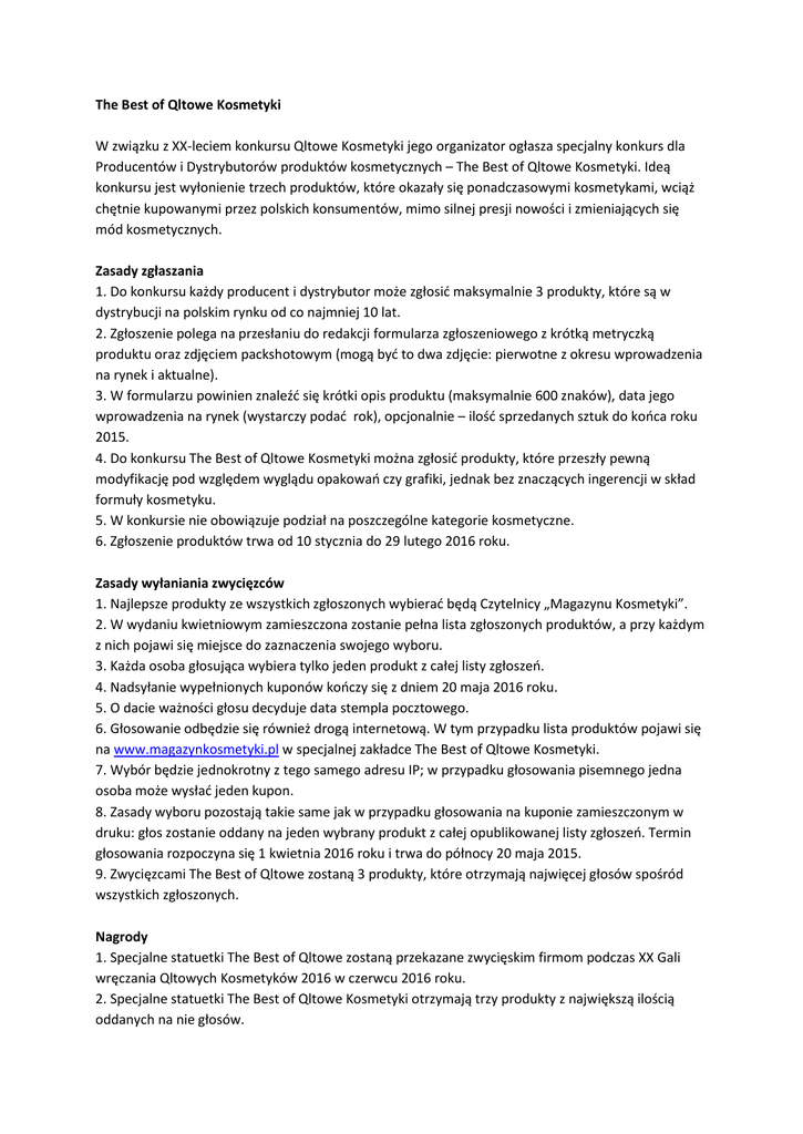 The Best of Qltowe Kosmetyki W związku z XX-leciem konkursu Qltowe Kosmetyki jego organizator ogłasza specjalny konkurs dla Producentów i Dystrybutorów produktów kosmetycznych – The Best of Qltowe Kosmetyki. Ideą konkursu jest wyłonienie trzech produktów, które okazały się ponadczasowymi kosmetykami, wciąż chętnie kupowanymi przez polskich konsumentów, mimo silnej presji nowości i zmieniających się mód kosmetycznych. Zasady zgłaszania 1. Do konkursu każdy producent i dystrybutor może zgłosić maksymalnie 3 produkty, które są w dystrybucji na polskim rynku od co najmniej 10 lat. 2. Zgłoszenie polega na przesłaniu do redakcji formularza zgłoszeniowego z krótką metryczką produktu oraz zdjęciem packshotowym (mogą być to dwa zdjęcie: pierwotne z okresu wprowadzenia na rynek i aktualne). 3. W formularzu powinien znaleźć się krótki opis produktu (maksymalnie 600 znaków), data jego wprowadzenia na rynek (wystarczy podać rok), opcjonalnie – ilość sprzedanych sztuk do końca roku 2015. 4. Do konkursu The Best of Qltowe Kosmetyki można zgłosić produkty, które przeszły pewną modyfikację pod względem wyglądu opakowań czy grafiki, jednak bez znaczących ingerencji w skład formuły kosmetyku. 5. W konkursie nie obowiązuje podział na poszczególne kategorie kosmetyczne. 6. Zgłoszenie produktów trwa od 10 stycznia do 29 lutego 2016 roku. Zasady wyłaniania zwycięzców 1. Najlepsze produkty ze wszystkich zgłoszonych wybierać będą Czytelnicy „Magazynu Kosmetyki”. 2. W wydaniu kwietniowym zamieszczona zostanie pełna lista zgłoszonych produktów, a przy każdym z nich pojawi się miejsce do zaznaczenia swojego wyboru. 3. Każda osoba głosująca wybiera tylko jeden produkt z całej listy zgłoszeń. 4. Nadsyłanie wypełnionych kuponów kończy się z dniem 20 maja 2016 roku. 5. O dacie ważności głosu decyduje data stempla pocztowego. 6. Głosowanie odbędzie się również drogą internetową. W tym przypadku lista produktów pojawi się na www.magazynkosmetyki.pl w specjalnej zakładce The Best of Qltowe Kosmetyki. 7. Wybór będzie jednokrotny z tego samego adresu IP; w przypadku głosowania pisemnego jedna osoba może wysłać jeden kupon. 8. Zasady wyboru pozostają takie same jak w przypadku głosowania na kuponie zamieszczonym w druku: głos zostanie oddany na jeden wybrany produkt z całej opublikowanej listy zgłoszeń. Termin głosowania rozpoczyna się 1 kwietnia 2016 roku i trwa do północy 20 maja 2015. 9. Zwycięzcami The Best of Qltowe zostaną 3 produkty, które otrzymają najwięcej głosów spośród wszystkich zgłoszonych. Nagrody 1. Specjalne statuetki The Best of Qltowe zostaną przekazane zwycięskim firmom podczas XX Gali wręczania Qltowych Kosmetyków 2016 w czerwcu 2016 roku. 2. Specjalne statuetki The Best of Qltowe Kosmetyki otrzymają trzy produkty z największą ilością oddanych na nie głosów. 3. Zwycięzcy będą mieli prawo posługiwać się znakiem The Best of Qltowe Kosmetyki w materiałach prasowych i reklamowych. Informacje dodatkowe dla głosujących 1. Na kuponie należy wpisać swoje imię, nazwisko, adres sklepu, telefon kontaktowy. 2. Czytelnicy mogą (opcjonalnie) dodać krótką recenzję produktu, na który głosowali, uzasadniającą swój wybór. 3. Autorzy 10 najciekawszych recenzji zostaną nagrodzeni przez „Magazyn Kosmetyki” upominkami, a kilka najciekawszych tekstów zostanie opublikowanych w „Qltowym Dodatku 2016”. Informacje dodatkowe dla zgłaszających 1. Wszelkich dodatkowych informacji udzielać będzie Redakcja „Magazynu Kosmetyki”. W razie pytań lub wątpliwości prosimy o kontakt mailowy: [email protected]; tel. 22/539-59-42