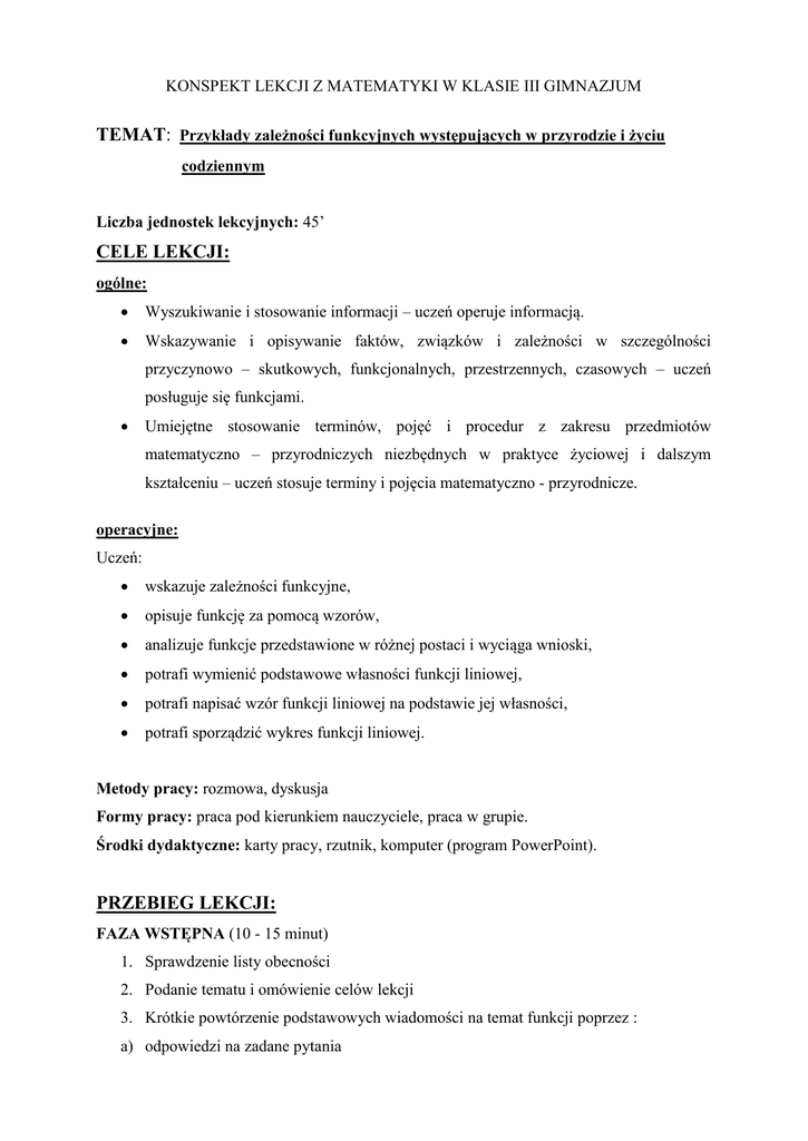 KONSPEKT LEKCJI Z MATEMATYKI W KLASIE III GIMNAZJUM