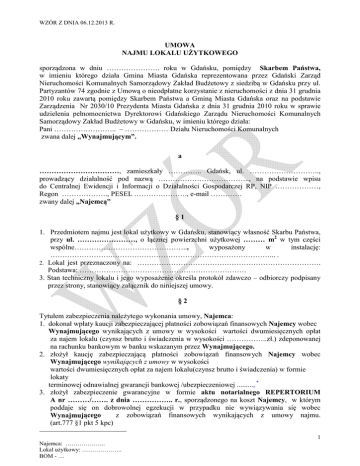 WZÓR Z DNIA 06.12.2013 R. UMOWA NAJMU LOKALU UŻYTKOWEGO sporządzona w dniu …………………. roku w Gdańsku, pomiędzy Skarbem Państwa, w imieniu którego działa Gmina Miasta Gdańska reprezentowana przez Gdański Zarząd Nieruchomości Komunalnych Samorządowy Zakład Budżetowy z siedzibą w Gdańsku przy ul. Partyzantów 74 zgodnie z Umową o nieodpłatne korzystanie z nieruchomości z dnia 31 grudnia 2010 roku zawartą pomiędzy Skarbem Państwa a Gminą Miasta Gdańska oraz na podstawie Zarządzenia Nr 2030/10 Prezydenta Miasta Gdańska z dnia 31 grudnia 2010 roku w sprawie udzielenia pełnomocnictwa Dyrektorowi Gdańskiego Zarządu Nieruchomości Komunalnych Samorządowy Zakład Budżetowy w Gdańsku, w imieniu którego działa: Pani …………………….. – ……………… Działu Nieruchomości Komunalnych zwana dalej „Wynajmującym”. a ……………………………, zamieszkały ………….. Gdańsk, ul. ……………………….., prowadzący działalność pod nazwą ……………………………….., na podstawie wpisu do Centralnej Ewidencji i Informacji o Działalności Gospodarczej RP, NIP ………………, Regon ………………., PESEL …………………., e-mail …………. zwany dalej „Najemcą” §1 1. Przedmiotem najmu jest lokal użytkowy w Gdańsku, stanowiący własność Skarbu Państwa, przy ul. ……………………, o łącznej powierzchni użytkowej ……… m2 w tym części wspólne……………………………………….., wyposażony w instalację: …………………….…………………………………………………………... . 2. Lokal jest przeznaczony na: …………………………………………………………………. Podstawa: …………………………………………………………… 3. Stan techniczny lokalu i jego wyposażenie określa protokół zdawczo – odbiorczy podpisany przez strony, stanowiący załącznik do niniejszej umowy. §2 Tytułem zabezpieczenia należytego wykonania umowy, Najemca: 1. dokonał wpłaty kaucji zabezpieczającej płatności zobowiązań finansowych Najemcy wobec Wynajmującego wynikających z umowy w wysokości wartości dwumiesięcznych opłat za najem lokalu (czynsz brutto i świadczenia w wysokości ……………..zł.) zdeponowanej na rachunku bankowym w banku wskazanym przez Wynajmującego. 2. złożył kaucję zabezpieczającą płatności zobowiązań finansowych Najemcy wobec Wynajmującego wynikających z umowy w wysokości wartości dwumiesięcznych opłat za najem lokalu(czynsz brutto i świadczenia) w formie lokaty terminowej odnawialnej gwarancji bankowej /ubezpieczeniowej ........., * 3. złożył zabezpieczenie gwarancyjne w formie aktu notarialnego REPERTORIUM A nr ………/……. z dnia …………….. r., sporządzonego na koszt Najemcy, w którym poddaje się on dobrowolnej egzekucji w przypadku nie wywiązywania się wobec z zobowiązań finansowych wynikających z umowy najmu. Wynajmującego (art.777 §1 pkt 5 kpc) 1 Najemca: ……………….. Lokal użytkowy: ……………….. BOM - … WZÓR Z DNIA 06.12.2013 R. 4. złożył zabezpieczenie gwarancyjne kosztów opróżnienia lokalu w formie weksla in blanco poręczonego przez dwóch poręczycieli o udokumentowanych dochodach i ich współmałżonków wraz z podpisaniem deklaracji wekslowej określającej sposób wypełnienia weksla, trybu i warunków domagania się zapłaty z weksla.* 5. złożył zabezpieczenie opuszczenia i opróżnienia lokalu w formie aktu notarialnego REPERTORIUM A nr ………/……. z dnia …………….. r., sporządzonego na koszt Najemcy, w którym podda się on dobrowolnej egzekucji obejmującej obowiązek wydania w przypadku jego nie opuszczenia i nie opróżnienia lokalu po rozwiązaniu umowy najmu (art. 777 §1 pkt 4 kpc). §3 1. Wynajmujący jest uprawniony do uruchomienia złożonych przez Najemcę zabezpieczeń, o których mowa w § 2 umowy w sytuacji, gdy zadłużenie Najemcy z tytułu najmu przekroczy sumę złożonej kaucji i będzie z nich pokrywał swe roszczenia z tytułu niezapłaconego czynszu i opłat eksploatacyjnych a także poniesionych strat finansowych z tytułu niewłaściwej eksploatacji oraz opróżnienia i wydania lokalu. 2. W przypadku gdy nie zajdą okoliczności, o których mowa w ust.1 uzasadniające uruchomienie zabezpieczeń, kaucja gwarancyjna zostanie zwrócona Najemcy w terminie 14 dni od daty zakończenia obowiązywania niniejszej umowy i zwrócenia przez Najemcę Wynajmującemu przedmiotu najmu w stanie nie budzącym zastrzeżeń Wynajmującego. §4 1. Najemca zobowiązany jest do zapłaty na rzecz Wynajmującego czynszu najmu oraz do zwrotu poniesionych na lokal kosztów eksploatacyjnych, w okresie od dnia ……………. roku: a) czynsz najmu netto za powierzchnię lokalu wynosi 2 2 0m x 0,00 z3/m i zostanie powiększony o podatek od towarów i usług wg obowiązującej stawki. = 0,00 zł Podstawa: 2. Najemca zobowiązuje się do zwrotu Wynajmującemu kosztów usług eksploatacyjnych świadczonych na rzecz Najemcy, proporcjonalnie do zajmowanej powierzchni, na podstawie faktur wystawianych przez Biuro Obsługi Mieszkańców GZNK SZB zgodnie z fakturami otrzymywanymi od dostawców usług. Najemca upoważnia Wynajmującego do nabywania ww. usług eksploatacyjnych we własnym imieniu, na rzecz Najemcy, który faktycznie z usług tych korzysta. Opłaty eksploatacyjne powiększone zostaną o podatek od towarów i usług wg obowiązującej stawki. 3. Niezależnie od czynszu i opłat eksploatacyjnych Najemca uiszcza opłaty za gospodarowanie odpadami komunalnymi ustalone według zasad wynikających z aktualnych przepisów - Uchwały Rady Miasta Gdańska. a) Opłaty za gospodarowanie odpadami komunalnymi uiszczane będą na podstawie faktur VAT. b) Wysokość opłat za gospodarowanie odpadami komunalnymi zmienia się bez konieczności zmiany umowy, z chwilą zmiany podstaw f