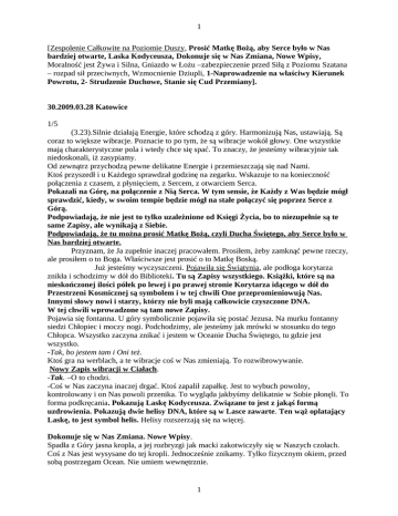 1 [Zespolenie Całkowite na Poziomie Duszy, Prosić Matkę Bożą, aby Serce było w Nas bardziej otwarte, Laska Kodyceusza, Dokonuje się w Nas Zmiana, Nowe Wpisy, Moralność jest Żywa i Silna, Gniazdo w Łożu –zabezpieczenie przed Siłą z Poziomu Szatana – rozpad sił przeciwnych, Wzmocnienie Dziupli, 1-Naprowadzenie na właściwy Kierunek Powrotu, 2- Strudzenie Duchowe, Stanie się Cud Przemiany]. 30.2009.03.28 Katowice 1/5 (3.23).Silnie działają Energie, które schodzą z góry. Harmonizują Nas, ustawiają. Są coraz to większe wibracje. Poznacie to po tym, że są wibracje wokół głowy. One wszystkie mają charakterystyczne pola i wtedy chce się spać. To znaczy, że jesteśmy wibracyjnie tak niedoskonali, iż zasypiamy. Od zewnątrz przychodzą pewne delikatne Energie i przemieszczają się nad Nami. Ktoś przyszedł i u Każdego sprawdzał godzinę na zegarku. Wskazuje to na konieczność połączenia z czasem, z płynięciem, z Sercem, z otwarciem Serca. Pokazali na Górę, na połączenie z Nią Serca. W tym sensie, że Każdy z Was będzie mógł sprawdzić, kiedy, w swoim tempie będzie mógł na stałe połączyć się poprzez Serce z Górą. Podpowiadają, że nie jest to tylko uzależnione od Księgi Życia, bo to niezupełnie są te same Zapisy, ale wynikają z Siebie. Podpowiadają, że tu można prosić Matkę Bożą, czyli Ducha Świętego, aby Serce było w Nas bardziej otwarte. Przyznam, że Ja zupełnie inaczej pracowałem. Prosiłem, żeby zamknąć pewne rzeczy, ale prosiłem o to Boga. Właściwsze jest prosić o to Matkę Boską. Już jesteśmy wyczyszczeni. Pojawiła się Świątynia, ale podłoga korytarza znikła i schodzimy w dół do Biblioteki. Tu są Zapisy wszystkiego. Książki, które są na nieskończonej ilości półek po lewej i po prawej stronie Korytarza idącego w dół do Przestrzeni Kosmicznej są symbolem i w tej chwili One przepromieniowują Nas. Innymi słowy nowi i starzy, którzy nie byli mają całkowicie czyszczone DNA. W tej chwili wprowadzone są tam nowe Zapisy. Pojawia się fontanna. U góry symbolicznie pojawiła się postać Jezusa. Na murku fontanny siedzi Chłopiec i moczy nogi. Podchodzimy, ale jesteśmy jak mrówki w stosunku do tego Chłopca. Wszystko zaczyna znikać i jestem w Oceanie Ducha Świętego, tu gdzie jest wszystko. -Tak, bo jestem tam i Oni też. Ktoś gra na werblach, a te wibracje coś w Nas zmieniają. To rozwibrowywanie. Nowy Zapis wibracji w Ciałach. -Tak. –O to chodzi. -Coś w Nas zaczyna inaczej drgać. Ktoś zapalił zapałkę. Jest to wybuch powolny, kontrolowany i on Nas powoli przenika. To wygląda jakbyśmy delikatnie w Sobie płonęli. To forma podkręcania. Pokazują Laskę Kodyceusza. Związane to jest z jakąś formą uzdrowienia. Pokazują dwie helisy DNA, które są w Lasce zawarte. Ten wąż oplatający Laskę, to jest symbol helis. Helisy rozszerzają się na więcej. Dokonuje się w Nas Zmiana. Nowe Wpisy. Spadła z Góry jasna kropla, a jej rozbryzgi jak macki zakotwiczyły się w Naszych czołach. Coś z Nas jest wysysane do tej kropli. Jednocześnie znikamy. Tylko fizycznym okiem, przed sobą postrzegam Ocean. Nie umiem wewnętrznie. 1 2 Ktoś przypływa łódką. Stoi. To jest ciemna Postać, ma ciemny Kij. Coś rzuca do wody jakby rybki, które mają zęby. -Co to jest? -To Twój strach. -Strach przed Zaistnieniem Cudu. -To do mnie. Wiem, o co chodzi. Każą mi tę rybkę złapać. Ona mi zjada rękę, a jednocześnie ta ręka cały czas jest. Zjada, wpływa mi do ręki, głowy, wszędzie przepływa, a gdziekolwiek przepływa, to pochłania mnie. Jednocześnie za nią odtwarza się to, co zjadła. Nic się nie dzieje, ale to niedobre uczucie. Czuję lęk. Wiem, o co chodzi. Zjadła mi Serce, ale Serce się nie odtworzyło. -Czy chcesz, żeby się odtworzyło? –Pytają mnie. –Tak. –Mówię. -To poproś Ojca. -Teraz się pojawiło jakieś dziwne, inne. Mówią. -A, po co Ty chcesz, żeby to Serce było. Jesteś Energią, w której jest Zapis. -To starcie z moimi pewnymi słabościami. Nie umiem pewnych rzeczy przeskoczyć. Ryba stała się takim Młodzieńcem. On wyciągnął to Serce, włożył we Mnie. -To była próba, której nie zdałeś…..- Zdałeś, zdałeś. Nie martw się. –Żartują Na dłoniach jest symbol Serca. Jeden z Nas poszedł za Katedrę, otworzył książkę i czyta. To Kodeks Moralny. Pokazuje ta Osoba, że w tym kodeksie są istotne rzeczy, byle tylko Światło od Boga je Przepromieniowywało. Ta Osoba przemienia się w mądrego starca i mówią;- i byle Starzec, to właściwie wyrażał. Teraz trzepie książką i wylatuje z niej nieskończona ilość liter, które spadają i niczym czarne dżdżownice gdzieś się rozpełzają. –Słychać tylko pisk jakby to było żywe. -Bo to jest Żywe. –Mówią. -Moralność jest Żywa. To jest też Program i taka sama forma Energii, która niszczy Świat jak Energia Zetora, która się wyłoniła i która może nawet zetrzeć Prawo Totalnego Podporządkowania. Oznacza to, że z samą Moralnością trzeba się będzie zetrzeć. –Tak. Teraz tak jakbyście byli nasmarowani i to z Was ściągają. Z tej masy powstało coś nieprzyjemnego, żywego. To jest jakby wielka bakteria. -Zaprzedanie Prawu. –Temu innemu. -Fałszywa Energetyka. –Mówi, ale nie jest to dziś dla mnie zrozumiałe. Przyszła Postać. Siadła na stolikach po lewej stronie. Chwyciła to, co było, uniosła to wszystko do Góry i z tego, co było nieprawdziwe, nieprzyjemne zrobiła kręcącą się piłkę. Piłka rozpostarła skrzydła i uleciała. -Co to jest? –Ktoś za mnie spytał. -Prawo. -Mówi ta Osoba. -Nowe Prawo? -E tam. –Nie ma nowego prawa. Przyjrzyjcie się Temu, co jest, a wszystko będzie zrozumiane. -Rzuca monetami. -Co to znaczy? –Pytam. -Że potrzeba pieniędzy i starań, tak by to było zrozumiane. -Czyli te wszystkie wysiłki i to, po co sięgamy, kiedyś, dzięki Naszej walce, dzięki tym staraniom się 