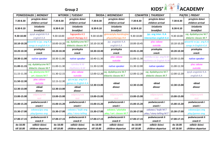 Group 2 PONIEDZIAŁEK | MONDAY WTOREK | TUESDAY ŚRODA | WEDNESDAY przyjście dzieci przyjście dzieci przyjście dzieci 7.30-8.30 7.30-8.30 children arrival children arrival children arrival śniadanie śniadanie śniadanie 8.30-9.10 8.30-9.10 8.30-9.10 breakfast breakfast breakfast język angielski K.A logopedia A.S gimnastyka korekcyjna 9.30-10.00 9.30-10.00 9.30-10.00 english K.A speech therapy A.S physiotherapy R.K piosenki w jęz. ang K.A zaj. dydaktyczne M.T jęz. angielski K.A 10.10-10.20 10.00-10.20 10.10-10.30 songs in english K.A didactic classes M.T english K.A przekąska przekąska przekąska 10.20-10.30 10.20-10.30 10.30-10.40 snack snack snack plac zabaw 10.30-11.00 native speaker 10.30-11.00 native speaker 10.40-11.30 outside zaj. dydaktyczne M.T rytmika N.W 11.00-11.15 11.00-11.30 11.30-12.00 native speaker didactic classes M.T rhythmics N.W zaj. plastyczne M.T plac zabaw zaj. dydaktyczne M.T 11.15-11.30 11.30-12.15 12.00-12.20 art. classes M.T outside didactic classes M.T plac zabaw gry w jęz. ang K.A 11.50-12.30 12.15-12.30 outside games in English K.A obiad 12.30-13.00 obiad obiad dinner 12.30-13.00 12.30-13.00 dinner dinner odpoczynek odpoczynek odpoczynek 13.00-15.00 13.00-15.00 13.00-15.00 rest rest rest podwieczorek I podwieczorek I podwieczorek I 15.00-15.20 15.00-15.20 15.00-15.20 snack I snack I snack I zabawa/gry ang zabawa / bajki ang zabawa / plastyka 15.30-17.00 15.30-17.00 15.30-17.00 play/games ang play / story telling play / art. classes M.T podwieczorek II podwieczorek II podwieczorek II 17.00-17.15 17.00-17.15 17.00-17.15 snack II snack II snack II do 18.00 odbiór dzieci do 18.00 odbiór dzieci do 18.00 odbiór dzieci till 18.00 children departue till 18.00 children departue till 18.00 children departue 7.30-8.30 CZWARTEK | THURSDAY przyjście dzieci children arrival śniadanie 8.30-9.10 breakfast jęz. ang inter. K.A 9.30-10.00 Interactive english K.A plac zabaw 10.00-10.45 outside przekąska 10.45-11.00 snack rytmika w jęz. ang N.W 11.00-11.30 rhythmics in English N.W 7.30-8.30 PIĄTEK | FRIDAY 7.30-8.30 8.30-9.10 9.30-10.00 10.10-10.20 10.20-10.30 10.30-11.00 11.30-12.00 native speaker 11.00-11.50 12.00-12.20 zaj. dydaktyczne M.T didactic classes M.T 12.00-12.20 12.30-13.00 obiad dinner 12.30-13.00 odpoczynek rest podwieczorek I 15.00-15.20 snack I zabawa / bajki M.T 15.30-17.00 play / story telling M.T podwieczorek II 17.00-17.15 snack II do 18.00 odbiór dzieci till 18.00 children departue 13.00-15.00 13.00-15.00 15.00-15.20 15.30-17.00 17.00-17.15 do 18.00 till 18.00 przyjście dzieci children arrival śniadanie breakfast zaj. dydaktyczne M.T didactic classes M.T piosenki w jęz. ang K.A songs in English K.A przekąska snack native speaker plac zabaw outside język angielski K.A english K.A obiad dinner odpoczynek rest podwieczorek I snack I zabawa/gry ang play/games ang podwieczorek II snack II odbiór dzieci children departue
