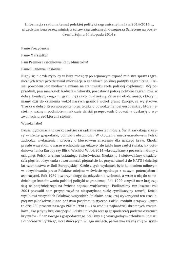 Informacja rządu na temat polskiej polityki zagranicznej na lata 2014-2015 r., przedstawiona przez ministra spraw zagranicznych Grzegorza Schetynę na posiedzeniu Sejmu 6 listopada 2014 r. Panie Prezydencie! Panie Marszałku! Pani Premier i członkowie Rady Ministrów! Panie i Panowie Posłowie! Nigdy się nie zdarzyło, by w kilka miesięcy po sejmowym exposé ministra spraw zagranicznych Rząd przedstawiał informację o zadaniach polskiej polityki zagranicznej. Dzisiaj powodem jest niedawna zmiana na stanowisku szefa polskiej dyplomacji. Mój poprzednik, pan marszałek Radosław Sikorski, pozostawił polską politykę zagraniczną w dobrej kondycji, czego mu gratuluję i za co mu dziękuję. Zarazem okoliczności, z którymi mamy dziś do czynienia wokół naszych granic i wokół granic Europy, są wyjątkowe. Troska o dobro Rzeczypospolitej oraz troska o powodzenie idei europejskiej, której jesteśmy ważnym podmiotem, nakazuje dzisiaj przeprowadzić poważną dyskusję o wyzwaniach, przed którymi stoimy. Wysoka Izbo! Dzisiaj dyplomacja to coraz częściej zarządzanie niestabilnością. Świat zaskakują kryzysy w sferze gospodarki, polityki i obronności. W otoczeniu międzynarodowym Polski zachodzą wydarzenia i procesy o kluczowym znaczeniu dla naszego kraju. Chodzi przede wszystkim o nasze wschodnie sąsiedztwo, ale także inne części świata, jak południowa flanka Europy czy Bliski Wschód. W rok 2014 wkroczyliśmy z poczuciem dumy z osiągnięć Polski w ciągu ostatniego ćwierćwiecza. Niedawno świętowaliśmy dwadzieścia pięć lat odzyskania suwerenności, piętnaście lat przynależności do NATO i dziesięć lat członkostwa w Unii Europejskiej. Każde z tych wydarzeń było kamieniem milowym w odzyskiwaniu przez Polaków miejsca w świecie zgodnego z naszym potencjałem i aspiracjami. Rok 1989 otworzył drogę do odzyskania wolności, a wraz z nią do samodzielnego kształtowania polskiej polityki zagranicznej. Rok 1999 uczynił nasz kraj częścią najpotężniejszego na świecie sojuszu wojskowego. Podkreślmy raz jeszcze: rok 2004 pozwolił nam przyspieszyć na niespotykaną skalę cywilizacyjny rozwój. Dzięki wysiłkowi wszystkich Polaków, wszystkich Polaków, nasz kraj wykorzystał ten czas lepiej niż jakiekolwiek inne państwo postkomunistyczne. Polski Produkt Krajowy Brutto to dziś 230 procent naszego PKB z 1990 r. – i to według najbardziej skromnych szacunków. Jako jedyny kraj europejski Polska uniknęła recesji gospodarczej podczas ostatnich kryzysów - finansowego i gospodarczego. Staliśmy się wiarygodnym członkiem Sojuszu Północnoatlantyckiego, uczestniczącym w jego misjach, pełniącym ważną rolę w syste- mie bezpieczeństwa Europy Środkowej. Od 1 grudnia, Polak premier Donald Tusk pokieruje Radą Europejską. To najlepsza miara sukcesu Polski w ciągu ostatnich 25 lat. Wydarzenia ostatnich miesięcy potwierdziły, że nie popełniliśmy błędu, stawiając na dwa filary polskiej polityki zagranicznej – członkostwo w Unii Europejskiej i w NATO. Dzięki osadzeniu we wspólnocie państw demokratycznych, tworzących wspólny rynek i gotowych bronić wartości świata zachodniego możemy być dzisiaj bezpieczni, dumni, bogatsi. Polska będzie nadal wzmacniać pozycję w silnym NATO i w silnej Unii Europejskiej. Nasz status jest już mocny, o czym świadczy choćby fakt, że nowy sekretarz generalny NATO Jens Stoltenberg i nowa unijna wysoka przedstawiciel ds. polityki zagranicznej Federica Mogherini za cel swoich pierwszych wizyt zagranicznych wybrali nasz kraj. Miałem przyjemność być gospodarzem obu tych wizyt. Zarazem zdajemy sobie sprawę z tego, że jednostronność jest szkodliwa i czasy bezwzględnej dominacji Europy w świecie należą do przeszłości. Dlatego większy nacisk położymy na globalny, pozaeuropejski wymiar polskiej polityki zagranicznej, zwłaszcza w dziedzinie gospodarczej. To kluczowe, bo w perspektywie roku 2020, i w latach późniejszych, gdy zapewne przestaniemy być beneficjentem funduszy unijnych, musimy znaleźć nowe szanse dla polskiej gospodarki, nowe rynki zbytu dla polskich towarów i usług, by powstawały nowe miejsca pracy i udało nam się utrzymać wysokie tempo wzrostu gospodarczego. Rok 2014 nie przyniósł nam wyłącznie zasłużonej satysfakcji. W historii zapisze się przede wszystkim jako czas, gdy w 100-lecie wybuchu I wojny światowej za sprawą Rosji zakwestionowany został ład międzynarodowy w Europie ukształtowany po zimnej wojnie. Podważono zasady nienaruszalności granic, niestosowania siły w sporach międzynarodowych, suwerenności państw. Dziś trudną próbę przechodzi nasz wschodni sąsiad – Ukraina, zaatakowana bez wypowiedzenia wojny. W chwili, gdy my świętowaliśmy trzy doniosłe rocznice, w Europie ożyły zagrożenia, z którymi zmagaliśmy się przed 1989 rokiem – widmo agresji zbrojnej, nieobliczalności wielkiego mocarstwa, wreszcie pogardy dla praw suwerennych narodów, ryzyko podziału kontynentu na strefy wpływu. Mimo niekorzystnych zmian w naszym sąsiedztwie Polska jest bezpieczna dzięki członkostwu w NATO, aktywnej polityce w ramach Sojuszu oraz modernizacji sił zbrojnych. Szczyt NATO w Newport, kładąc nacisk na potrzebę obrony pokoju i wolności na całym kontynencie europejskim, odwrócił dotychczasowe, niekorzystne trendy w polityce europejskiej i transatlantyckiej. Podjęto decyzje o wzmocnieniu wschodniej flanki NATO i stopniowej odbudowie potencjału militarnego sojuszników europejskich. Decyzje te mają dla nas, decyzje te mają dla Polski charakter fundamentalny. Naszym najważniejszym celem w ramach NATO jest wdrażanie Planu Gotowości Sojuszu. Czuwamy nad napiętym kalendarzem realizacji uzgodnień w zakresie ćwiczeń, dowodzenia, planowania obronnego i operacyjnego oraz rozmieszczenia sprzętu. Pilne utworzenie Sił Natychmiastowego Reagowania i wzmocnienie w strukturze sił NATO roli Korpusu Północ-Wschód w Szczecini