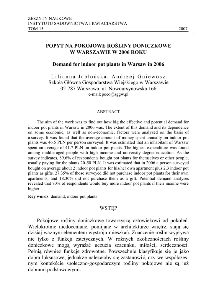 ZESZYTY NAUKOWE INSTYTUTU SADOWNICTWA I KWIACIARSTWA TOM 15 2007 POPYT NA POKOJOWE ROŚLINY DONICZKOWE W WARSZAWIE W 2006 ROKU Demand for indoor pot plants in Warsaw in 2006 Lilianna Jabł o ńs k a , A n d r z e j G n i e w o s z Szkoł a Gł ówna Gospodarstwa Wiejskiego w Warszawie 02-787 Warszawa, ul. Nowoursynowska 166 e-mail: [email protected] ABSTRACT The aim of the work was to find out how big the effective and potential demand for indoor pot plants in Warsaw in 2006 was. The extent of this demand and its dependence on some economic, as well as non-economic, factors were analyzed on the basis of a survey. It was found that the average amount of money spent annually on indoor pot plants was 46.5 PLN per person surveyed. It was estimated that an inhabitant of Warsaw spent an average of 41.7 PLN on indoor pot plants. The highest expenditure was found among middle-aged people with high income and university degree education. As the survey indicates, 89.6% of respondents bought pot plants for themselves or other people, usually paying for the plants 20-50 PLN. It was estimated that in 2006 a person surveyed bought on average about 2 indoor pot plants for his/her own apartment plus 2.3 indoor pot plants as gifts. 27.35% of those surveyed did not purchase indoor pot plants for their own apartments, and 18.30% did not purchase them as a gift. Potential demand analyses revealed that 70% of respondents would buy more indoor pot plants if their income were higher. Key words: demand, indoor pot plants WSTĘP Pokojowe roś liny doniczkowe towarzyszączł owiekowi od pokoleń. Wielokrotnie niedoceniane, pomijane w architekturze wnę trz, stająsię dzisiaj ważnym elementem wystroju mieszkań. Znaczenie roś lin wypł ywa nie tylko z funkcji estetycznych. W różnych okolicznoś ciach roś liny doniczkowe mogą wyraż ać uczucia szacunku, mił oś ci, serdecznoś ci. Peł niąrównieżfunkcje zdrowotne. Powszechnie klasyfikuje sięje jako dobra luksusowe, jednakże należał oby sięzastanowić , czy we współ czesnym kontekś cie społ eczno-gospodarczym roś liny pokojowe nie sąjuż dobrami podstawowymi. 118 Zeszyty Naukowe Instytutu Sadownictwa i Kwiaciarstwa, tom 15 Jest to jedna z niewielu grup produktów, które sąkupowane, otrzymywane jako prezenty oraz uzyskiwane (rozmnaż anie) we wł asnym zakresie. Ich wielofunkcyjnoś ćprzyczynia siędo coraz wię kszego popytu (Jabł ońska 1997). Przy zakupie roś lin pokojowych konsumenci kierująsię gł ównie ceną , efektem zdobniczym roś liny, gatunkiem (Rutkowska 1995; Sypniewska 1998; Zyntek 2004; Rembowska 2005). Cechącharakterystyczną popytu na pokojowe roś liny doniczkowe jest to, że do podstawowych jego determinantów, tj. dochodów konsumentów, cen roś lin oraz produktów komplementarnych i substytucyjnych, wieku, pł ci, mody, tradycji, gustów i preferencji konsumentów (Kamerschen i in. 1991; Begg 1994; Milewski 1994; Zawojska i in. 1998), należy doł ą czyćwielkoś ć mieszkań(Jabł ońska 2003). Przy rosnącej konkurencji analiza popytu i preferencji konsumentów jest warunkiem podję cia wł aś ciwych decyzji produkcyjnych i marketingowych. Niniejsza praca ma na celu przedstawienie wielkoś ci popytu efektywnego i potencjalnego na roś liny pokojowe w zależ noś ci od niektórych czynników ekonomicznych oraz pozaekonomicznych. MATERIAŁI METODY Analiza popytu opiera sięna badaniach ankietowych przeprowadzonych w Warszawie w 2006 roku. Ograniczenie badańdo rynku warszawskiego wynikał o z duż ej ich pracochł onnoś ci. W zwią zku z szybkim przyrostem w Polsce odsetka osób z wykształ ceniem ś rednim i wyższym przedstawiono respondentów tylko z tym wykształ ceniem, gdyżjak wynika z badań(Goździewska 1995; Wrona 2006; Bartoszek 2006), w najbliższych latach te grupy bę dąmiał y najwię ksze znaczenie we wzroś cie poziomu zakupów roś lin doniczkowych. Badaniami obję to 325 osób. Spoś ród nich wyselekcjonowano reprezentatywnągrupę250 osób, wś ród których tylko 10,4% nie kupił o w ogóle roś lin pokojowych. Kryterium wyboru oparto na danych GUS o strukturze wiekowej populacji mieszkańców Warszawy. Analizy przeprowadzono prostymi metodami matematyczno-statystycznymi, posł ugują c sięwskaźnikami procentowymi oraz wielkoś ciami ś rednimi. WYNIKI BADAŃ 1. Wysokoś ćwydatków na roś liny pokojowe W objętej badaniami populacji zaobserwowano duż e zainteresowanie roś linami pokojowymi. Najwięcej respondentów (35,15%) dokonał o Popyt na pokojowe roś liny doniczkowe ... 119 zakupów za 21-50 zł(tab. 1). Kolejnąlicznie deklarowanąkwotąokazał się przedział51-100 zł(26,36% badanych) oraz 11-20 zł(15,90% badanych). Poniż ej 10 złrocznie wydawał o tylko 15,06% osób, a powyż ej 100 zł– 7,53%. Najmniej respondentów podał o, że kupował o roś liny za ponad 200 zł(2,93% osób). Przyjmują c w sposób uproszczony wielkoś ć wydatków w każdej grupie jako ś redniąarytmetycznądanego przedział u kwotowego, moż na w przybliż eniu okreś lić, ż e ś redni wydatek osób kupują cych roś liny pokojowe wynosiłw 2006 roku 46,50 zł , a w cał ej badanej populacji 41,66 zł . Analizy wykazał y zależ noś ćwydatków na roś liny pokojowe od poziomu dochodów konsumentów. Wś ród osób o najniż szych dochodach 50% wydał o kwotęponiżej 20 zł , powyżej 100 zł– zaledwie 2,94%. Wś ród respondentów o dochodzie 800-1500 złodsetek ten wynosił odpowiednio 22,77 i 5,94%, a z dochodem ponad 1500 zł– 24,28 i 14,29%. Jak pokazał y uzyskane wyniki, ś rednie wydatki w najbiedniejszej grupie badanych wynosił y 31,38 zł . W gronie ankietowanych o dochodzie wynoszą cym 800-1500 złkupowano roś liny za 48,47 zł , natomiast wś ród osób o dochodzie przekraczają cym 1500 złwydatki kształ tował y sięna poziomie 58,05 zł . Również wykształ cenie należy do waż niejszych determinantów wydatków na roś liny pokojowe. W przedziale zakupów poniż