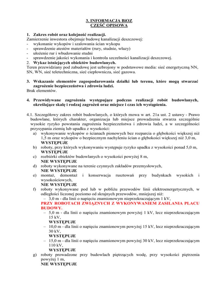 3. INFORMACJA BiOZ CZĘŚĆ OPISOWA 1. Zakres robót oraz kolejność realizacji. Zamierzenie inwestora obejmuje budowę kanalizacji deszczowej: - wykonanie wykopów i szalowania ścian wykopu - sprawdzenie atestów materiałów (rury, studnie, włazy) - ułożenie rur i wbudowanie studni - sprawdzenie jakości wykonania i kontrola szczelności kanalizacji deszczowej. 2. Wykaz istniejących obiektów budowlanych. Teren przewidziany pod zabudowę jest uzbrojony w podstawowe media: sieć energetyczną NN, SN, WN, sieć teletechniczna, sieć ciepłownicza, sieć gazowa. 3. Wskazanie elementów zagospodarowania działki lub terenu, które mogą stwarzać zagrożenie bezpieczeństwa i zdrowia ludzi. Brak elementów. 4. Przewidywane zagrożenia występujące podczas realizacji robót budowlanych, określające skalę i rodzaj zagrożeń oraz miejsce i czas ich wystąpienia. 4.1. Szczegółowy zakres robót budowlanych, o których mowa w art. 21a ust. 2 ustawy - Prawo budowlane, których charakter, organizacja lub miejsce prowadzenia stwarza szczególnie wysokie ryzyko powstania zagrożenia bezpieczeństwa i zdrowia ludzi, a w szczególności przysypania ziemią lub upadku z wysokości: a) wykonywanie wykopów o ścianach pionowych bez rozparcia o głębokości większej niż 1,5 m oraz wykopów o bezpiecznym nachyleniu ścian o głębokości większej niż 3,0 m, WYSTĘPUJE b) roboty, przy których wykonywaniu występuje ryzyko upadku z wysokości ponad 5,0 m, WYSTĘPUJE c) rozbiórki obiektów budowlanych o wysokości powyżej 8 m, NIE WYSTĘPUJE d) roboty wykonywane na terenie czynnych zakładów przemysłowych, NIE WYSTĘPUJE e) montaż, demontaż i konserwacja rusztowań przy budynkach wysokich i wysokościowych, NIE WYSTĘPUJE f) roboty wykonywane pod lub w pobliżu przewodów linii elektroenergetycznych, w odległości liczonej poziomo od skrajnych przewodów, mniejszej niż: – 3,0 m - dla linii o napięciu znamionowym nieprzekraczającym 1 kV, PRZY ROBOTACH ZWIĄZNYCH Z WYKONYWANIEM ZASILANIA PLACU BUDOWY. – 5,0 m - dla linii o napięciu znamionowym powyżej 1 kV, lecz nieprzekraczającym 15 kV, WYSTĘPUJE – 10,0 m - dla linii o napięciu znamionowym powyżej 15 kV, lecz nieprzekraczającym 30 kV, WYSTĘPUJE – 15,0 m - dla linii o napięciu znamionowym powyżej 30 kV, lecz nieprzekraczającym 110 kV, WYSTĘPUJE g) roboty prowadzone przy budowlach piętrzących wodę, przy wysokości piętrzenia powyżej 1 m, NIE WYSTĘPUJE 2 h) roboty wykonywane w pobliżu linii kolejowych; NIE WYSTĘPUJE 4.2. Szczegółowy zakres robót budowlanych, o których mowa w art. 21a ust. 2 ustawy - Prawo budowlane, przy których występują działania substancji chemicznych lub czynników biologicznych zagrażających bezpieczeństwu i zdrowiu ludzi: a) roboty prowadzone w temperaturze poniżej -10°C, NIE WYSTĘPUJE b) roboty polegające na usuwaniu i naprawie wyrobów budowlanych zawierających azbest; NIE WYSTĘPUJE 4.3. Szczegółowy zakres robót budowlanych, o których mowa w art. 21a ust. 2 ustawy - Prawo budowlane, stwarzających zagrożenie promieniowaniem jonizującym: a) roboty remontowe i rozbiórkowe obiektów przemysłu energii atomowej, NIE WYSTĘPUJE b) roboty remontowe i rozbiórkowe obiektów, w których były realizowane procesy technologiczne z użyciem izotopów; NIE WYSTĘPUJE 4.4. Szczegółowy zakres robót budowlanych, o których mowa w art. 21a ust. 2 ustawy - Prawo budowlane, prowadzonych w pobliżu linii wysokiego napięcia lub czynnych linii komunikacyjnych: a) roboty wykonywane w odległości liczonej poziomo od skrajnych przewodów, mniejszej niż 15,0 m dla linii o napięciu znamionowym 110 kV, WYSTĘPUJE b) roboty wykonywane w odległości liczonej poziomo od skrajnych przewodów, mniejszej niż 30,0 m - dla linii o napięciu znamionowym powyżej 110 kV, WYSTĘPUJE c) budowa i remont: - linii kolejowych (roboty torowe i podtorowe), NIE WYSTĘPUJE - sieci trakcyjnej i linii zasilającej sieć trakcyjną i urządzenia elektroenergetyczne, - linii i urządzeń sterowania ruchem kolejowym, NIE WYSTĘPUJE - sieci telekomunikacyjnych, radiotelekomunikacyjnych i komputerowych, związane z prowadzeniem ruchu kolejowego, NIE WYSTĘPUJE d) wszystkie roboty budowlane, wykonywane na obszarze kolejowym w warunkach prowadzenia ruchu kolejowego; NIE WYSTĘPUJE 5) robót budowlanych stwarzających ryzyko utonięcia pracowników: a) roboty prowadzone z wody lub pod wodą, NIE WYSTĘPUJE b) montaż elementów konstrukcyjnych obiektów mostowych, NIE WYSTĘPUJE c) fundamentowanie podpór mostowych i innych obiektów budowlanych na palach, d) roboty prowadzone przy budowlach piętrzących wodę, przy wysokości piętrzenia powyżej 1 m; NIE WYSTĘPUJE 6) robót budowlanych prowadzonych w studniach, pod ziemią i w tunelach: a) roboty prowadzone w zbiornikach, kanałach, wnętrzach urządzeń technicznych i w innych niebezpiecznych przestrzeniach zamkniętych, WYSTĘPUJE b) roboty związane z wykonywaniem przejść rurociągów pod przeszkodami metodami: tunelową, przecisku lub podobnymi; 3 WYSTĘPUJE 7) robót budowlanych wykonywanych przez kierujących pojazdami zasilanymi z linii napowietrznych - roboty przy budowie, remoncie i rozbiórce torowisk; NIE WYSTĘPUJE 8) robót budowlanych wykonywanych w kesonach, z atmosferą wytwarzaną ze sprężonego powietrza - roboty przy budowie i remoncie nabrzeży portowych i przepraw mostowych; NIE WYSTĘPUJE 9) robót budowlanych wymagających użycia materiałów wybuchowych: a) roboty ziemne związane z przemieszczaniem lub zagęszczaniem gruntu, b) roboty rozbiórkowe, w tym wykonywanie otworów w istniejących elementach konstrukcyjnych obiektów; NIE WYSTĘPUJE 10) robót budowlanych prowadzonych przy montażu i demontażu ciężkich elementów prefabrykowanych – roboty, których masa przekracza 1,0 t. WYSTĘPUJE 5. Sposób prowadzenia instruktażu pracowników przed przystąpieniem do realizacji robót szczególnie niebezpiecznych. Instru