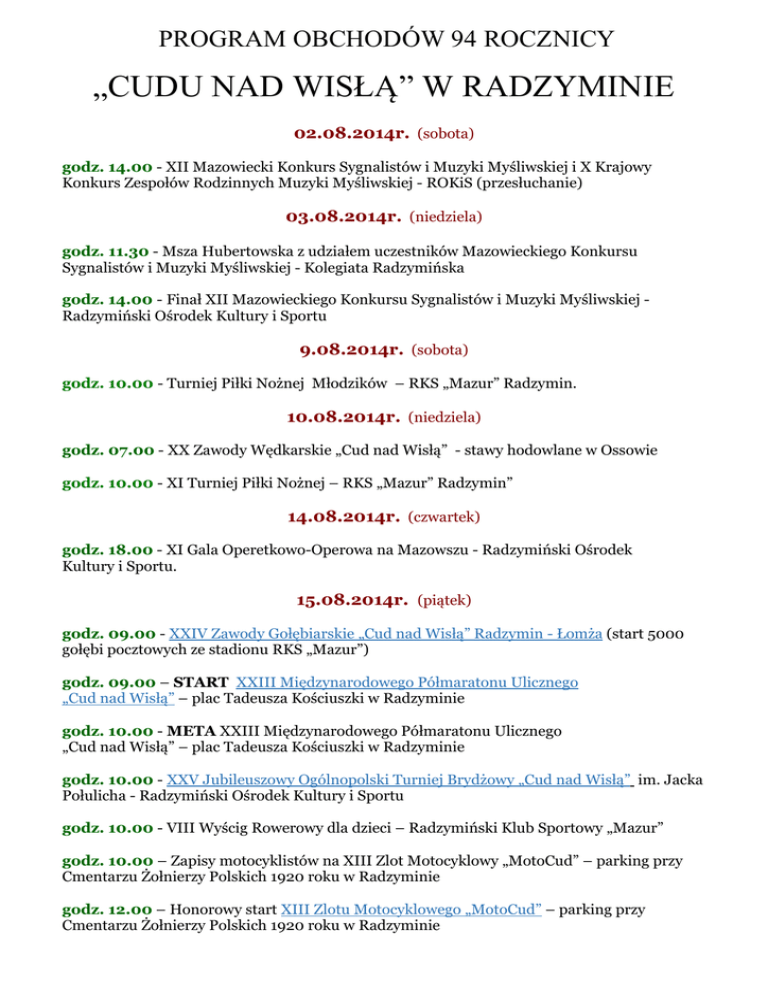PROGRAM OBCHODÓW 94 ROCZNICY „CUDU NAD WISŁĄ” W RADZYMINIE 02.08.2014r. (sobota) godz. 14.00 - XII Mazowiecki Konkurs Sygnalistów i Muzyki Myśliwskiej i X Krajowy Konkurs Zespołów Rodzinnych Muzyki Myśliwskiej - ROKiS (przesłuchanie) 03.08.2014r. (niedziela) godz. 11.30 - Msza Hubertowska z udziałem uczestników Mazowieckiego Konkursu Sygnalistów i Muzyki Myśliwskiej - Kolegiata Radzymińska godz. 14.00 - Finał XII Mazowieckiego Konkursu Sygnalistów i Muzyki Myśliwskiej Radzymiński Ośrodek Kultury i Sportu 9.08.2014r. (sobota) godz. 10.00 - Turniej Piłki Nożnej Młodzików – RKS „Mazur” Radzymin. 10.08.2014r. (niedziela) godz. 07.00 - XX Zawody Wędkarskie „Cud nad Wisłą” - stawy hodowlane w Ossowie godz. 10.00 - XI Turniej Piłki Nożnej – RKS „Mazur” Radzymin” 14.08.2014r. (czwartek) godz. 18.00 - XI Gala Operetkowo-Operowa na Mazowszu - Radzymiński Ośrodek Kultury i Sportu. 15.08.2014r. (piątek) godz. 09.00 - XXIV Zawody Gołębiarskie „Cud nad Wisłą” Radzymin - Łomża (start 5000 gołębi pocztowych ze stadionu RKS „Mazur”) godz. 09.00 – START XXIII Międzynarodowego Półmaratonu Ulicznego „Cud nad Wisłą” – plac Tadeusza Kościuszki w Radzyminie godz. 10.00 - META XXIII Międzynarodowego Półmaratonu Ulicznego „Cud nad Wisłą” – plac Tadeusza Kościuszki w Radzyminie godz. 10.00 - XXV Jubileuszowy Ogólnopolski Turniej Brydżowy „Cud nad Wisłą” im. Jacka Połulicha - Radzymiński Ośrodek Kultury i Sportu godz. 10.00 - VIII Wyścig Rowerowy dla dzieci – Radzymiński Klub Sportowy „Mazur” godz. 10.00 – Zapisy motocyklistów na XIII Zlot Motocyklowy „MotoCud” – parking przy Cmentarzu Żołnierzy Polskich 1920 roku w Radzyminie godz. 12.00 – Honorowy start XIII Zlotu Motocyklowego „MotoCud” – parking przy Cmentarzu Żołnierzy Polskich 1920 roku w Radzyminie godz. 15.00 - Uroczysty Apel przy pomniku Wincentego Witosa w Radzyminie godz.15.30 - Meta XIII Zlotu Motocyklowego „MotoCud” - Plac Tadeusza Kościuszki w Radzyminie. godz. 17.00 - Uroczysta Msza Święta i Apel Poległych na Cmentarzu Żołnierzy Polskich 1920 roku w Radzyminie Plac Tadeusza Kościuszki w Radzyminie godz. 20.00 - Koncert Macieja Maleńczuka z Zespołem Psychodancing godz. 21.30 - pokaz sztucznych ogni Imprezę poprowadzi DJ Farad godz. 21.40 - koncert zespołu Bayer Full 16.08.2014r. (sobota) godz. 16.00 - Odbicie Radzymina 1920 - rekonstrukcja historyczna, pola bitwy przy Sanktuarium św. Jana Pawła II w Radzyminie, ul. Słowackiego godz. 18.00 - Przemarsz historyczny ulicami Radzymina zwieńczony inscenizacją nadania orderów Virtuti Militari przez gen. Józefa Hallera żołnierzom walczącym pod Radzyminem w sierpniu 1920 roku godz. 19.30 - Koncert Kapeli Wileńskiej 17.08.2014r. (niedziela) godz. 18.00 – „Wielkie Tańce Ukrainy” - Koncert Ukraińskiego Zespołu Pieśni i Tańca „KALINA” z Kijowa - Radzymiński Ośrodek Kultury i Sportu